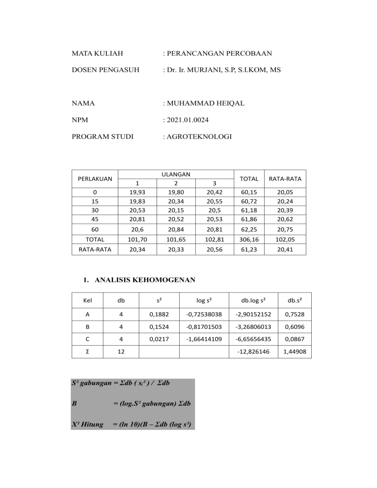 MATA KULIAH : PERANCANGAN PERCOBAAN DOSEN PENGASUH : Dr. Ir. MURJANI, S.P, S.I.KOM, MS NAMA : MUHAMMAD HEIQAL NPM : 2021.01.0024 PROGRAM STUDI : AGROTEKNOLOGI 0 15 30 45 1 19,93 19,83 20,53 20,81 ULANGAN 2 19,80 20,34 20,15 20,52 3 20,42 20,55 20,5 20,53 60 20,6 20,84 TOTAL 101,70 RATA-RATA 20,34 PERLAKUAN TOTAL RATA-RATA 60,15 60,72 61,18 61,86 20,05 20,24 20,39 20,62 20,81 62,25 20,75 101,65 102,81 306,16 102,05 20,33 20,56 61,23 20,41 1. ANALISIS KEHOMOGENAN Kel db s² log s² db.log s² db.s² A 4 0,1882 -0,72538038 -2,90152152 0,7528 B 4 0,1524 -0,81701503 -3,26806013 0,6096 C 4 0,0217 -1,66414109 -6,65656435 0,0867 Ʃ 12 -12,826146 1,44908 S² gabungan = Ʃdb ( sᵢ² ) / Ʃdb B = (log.S² gabungan) Ʃdb X² Hitung = (ln 10)(B – Ʃdb (log s²) S² gabungan = 0,12075667 B = -11,0170666 X² Hitung = 4,16555927 X² Tabel = 5,99146455 " Karena X² Hitung < X² Tabel, maka H₀ diterima. Artinya kelompok data tersebut memiliki varians yang sama atau homogen 2. ANALISIS RAGAM ANOVA PERLAKUAN 0 15 30 45 60 TOTAL RATA-RATA SK Perlakuan Galat Total ULANGAN 1 2 3 19,93 19,80 20,42 19,83 20,34 20,55 20,53 20,15 20,5 20,81 20,52 20,53 20,6 20,84 20,81 101,70 101,65 102,81 20,34 20,33 20,56 db 4 10 14 JK 0,955 0,666 1,621 KT 0,239 0,067 db Perlakuan = Perlakuan – 1 =5–1=4 db Galat = Perlakuan ( Ulangan – 1 ) =5(3–1) = 5 (2) = 10 db Total = Perlakuan . Ulangan – 1 = 5 . 3 – 1 = 14 TOTAL RATA-RATA 60,15 60,72 61,18 61,86 62,25 306,16 61,23 20,05 20,24 20,39 20,62 20,75 102,05 20,41 Fhit 3,59 F Tab 0,05% 3,48 0,01% 5,99 * FK = (Grand Total)² / (P.U) = 306,16 / 15 = 6248,93 JKT = ƩX² - FK = 1,62109 JKP = ƩP² / U – FK = 0,95543 JKG = JKT – JKP = 1,62109 – 0,95543 = 0,66567 KTP = JKP / dbP = 0,95543 / 4 = 0,23886 KTG = JKG / dbG = 0,6657 / 10 = 0,06657 F. Hitung = KTP / KTG = 0,23886 / 0,06657 = 3,58823 F. Tabel KK = √KTG x 100% Ӯ = 1% Karena F hit (3,59) kurang dari F tab pada taraf 0.05% (3,49), maka H0 ditolak yang berarti Pengaruh Pupuk Bokashi Kotoran Ayam Berpengaruh Nyata terhadap Tanaman Selada.