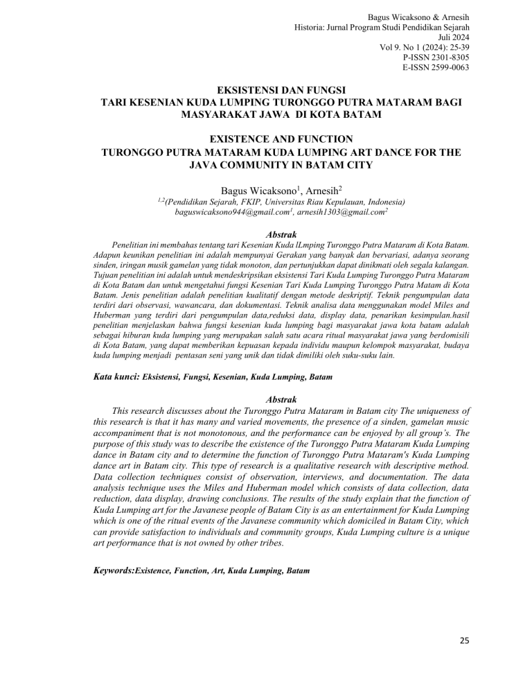 Bagus Wicaksono & Arnesih Historia: Jurnal Program Studi Pendidikan Sejarah Juli 2024 Vol 9. No 1 (2024): 25-39 P-ISSN 2301-8305 E-ISSN 2599-0063 EKSISTENSI DAN FUNGSI TARI KESENIAN KUDA LUMPING TURONGGO PUTRA MATARAM BAGI MASYARAKAT JAWA DI KOTA BATAM EXISTENCE AND FUNCTION TURONGGO PUTRA MATARAM KUDA LUMPING ART DANCE FOR THE JAVA COMMUNITY IN BATAM CITY Bagus Wicaksono1, Arnesih2 1,2 (Pendidikan Sejarah, FKIP, Universitas Riau Kepulauan, Indonesia) [email protected], [email protected] Abstrak Penelitian ini membahas tentang tari Kesenian Kuda lLmping Turonggo Putra Mataram di Kota Batam. Adapun keunikan penelitian ini adalah mempunyai Gerakan yang banyak dan bervariasi, adanya seorang sinden, iringan musik gamelan yang tidak monoton, dan pertunjukkan dapat dinikmati oleh segala kalangan. Tujuan penelitian ini adalah untuk mendeskripsikan eksistensi Tari Kuda Lumping Turonggo Putra Mataram di Kota Batam dan untuk mengetahui fungsi Kesenian Tari Kuda Lumping Turonggo Putra Matam di Kota Batam. Jenis penelitian adalah penelitian kualitatif dengan metode deskriptif. Teknik pengumpulan data terdiri dari observasi, wawancara, dan dokumentasi. Teknik analisa data menggunakan model Miles and Huberman yang terdiri dari pengumpulan data,reduksi data, display data, penarikan kesimpulan.hasil penelitian menjelaskan bahwa fungsi kesenian kuda lumping bagi masyarakat jawa kota batam adalah sebagai hiburan kuda lumping yang merupakan salah satu acara ritual masyarakat jawa yang berdomisili di Kota Batam, yang dapat memberikan kepuasan kepada individu maupun kelompok masyarakat, budaya kuda lumping menjadi pentasan seni yang unik dan tidak dimiliki oleh suku-suku lain. Kata kunci: Eksistensi, Fungsi, Kesenian, Kuda Lumping, Batam Abstrak This research discusses about the Turonggo Putra Mataram in Batam city The uniqueness of this research is that it has many and varied movements, the presence of a sinden, gamelan music accompaniment that is not monotonous, and the performance can be enjoyed by all group’s. The purpose of this study was to describe the existence of the Turonggo Putra Mataram Kuda Lumping dance in Batam city and to determine the function of Turonggo Putra Mataram's Kuda Lumping dance art in Batam city. This type of research is a qualitative research with descriptive method. Data collection techniques consist of observation, interviews, and documentation. The data analysis technique uses the Miles and Huberman model which consists of data collection, data reduction, data display, drawing conclusions. The results of the study explain that the function of Kuda Lumping art for the Javanese people of Batam City is as an entertainment for Kuda Lumping which is one of the ritual events of the Javanese community which domiciled in Batam City, which can provide satisfaction to individuals and community groups, Kuda Lumping culture is a unique art performance that is not owned by other tribes. Keywords:Existence, Function, Art, Kuda Lumping, Batam 25 Bagus Wicaksono & Arnesih Historia: Jurnal Program Studi Pendidikan Sejarah Juli 2024 Vol 9. No 1 (2024): 25-39 P-ISSN 2301-8305 E-ISSN 2599-0063 PENDAHULUAN Setiap komunitas yang ada di masyarakat baik dalam kelompok yang ada di desa maupun di kota, selalu didapati adanya kebudayaan yang tumbuh di dalamnya. Kebudayaan tersebut juga memiliki corak yang khas, terutama bagi kebudayaan yang dibawa oleh masyarakat dari luar komunitas tersebut. Ciri khas yang dibawa oleh orang dari luar kelompok seringkali tidak disadari oleh individu tersebut. Sebaliknya justru mereka dapat melihat ciri khas dari kebudayaan lain yang berbeda. Kebudayaan dengan corak khas yang berbeda dikarenakan oleh berbagai faktor, yang salah satunya karena adanya unsur kecil (dalam bentuk unsur kebudayaan fisik) yang khas, atau kebudayaan tersebut disusun oleh pranata-pranata pola sosial khusus, atau juga karena menganut budaya dengan tema yang khusus. Sebaliknya, corak khas mungkin pula disebabkan karena adanya kompleks unsur-unsur yang lebih besar, sehingga tampak berbeda dari kebudayaan-kebudayaan lain. Kebudayaan dalam suatu daerah telah dipetakan oleh para ahli antropologi yang dikelompokan berdasarkan pada persamaan unsur atau ciri dari kebudayaan yang mencolok. Beragam suku bangsa yang ada di seluruh belahan dunia dapat dengan mudah dikelompokan berdasarkan persamaan unsur kebudayaan, sehingga memudahkan para ahli antropologi untuk melakukan penelitian komparatif. Unsur kebudayaan fisik, bukanlah salah satu unsur yang dapat dijadikan acuan dalam mengelompokan ciri-ciri kebudayaan dalam daerah kebudayaan, namun juga terdapat unsur kebudayaan abstrak seperti unsur dalam organisasi kemasyarakatan, sistem perekonomian, adat istiadat, upacara keagamaan dan lain-lain. Kehadiran persamaan ciri yang mencolok dalam suatu daerah kebudayaan dapat dikatakan lebih daripada kebudayaan-kebudayaan pusat dan kebudayaan yang bersangkutan, menjadi tipis dalam kebudayaan yang jaraknya semakin jauh dari pusat tersebut. Mengenali bentuk masyarakat dan kebudayaan yanga da di indonesia, wajib diketahui oleh antropolog indonesia. Sebagai gambaran, secara konvensional, ilmu antropologi mengklasifikasikan wilayah papua dan irian jaya termasuk kedalam kebudayaan melanesia, serta dipelajari mendalam melalui antropologi kejuruan dalam 26 Bagus Wicaksono & Arnesih Historia: Jurnal Program Studi Pendidikan Sejarah Juli 2024 Vol 9. No 1 (2024): 25-39 P-ISSN 2301-8305 E-ISSN 2599-0063 melanesia dan oceania. Antropolog indonesia juga harus memusatkan perhatian pada kebudayaan yang ada di wilayah asia tenggara seperti filipina, malaysia dan negara lain yang berdekatan dengan Indonesia. Kebudayaan adalah salah satu bentuk hasil cipta dan karya masyarakat yang dapat ditunjukan ke dalam berbagai macam bentuk. Menurut C. Kluckhohn dalam Soekanto (2010: 154), terdapat tujuh unsur kebudayaan yang dianggap sebagai kebudayaan universal, yaitu peralatan dan perlengkapan hidup, mata pencaharian hidup dan sistemsistem ek