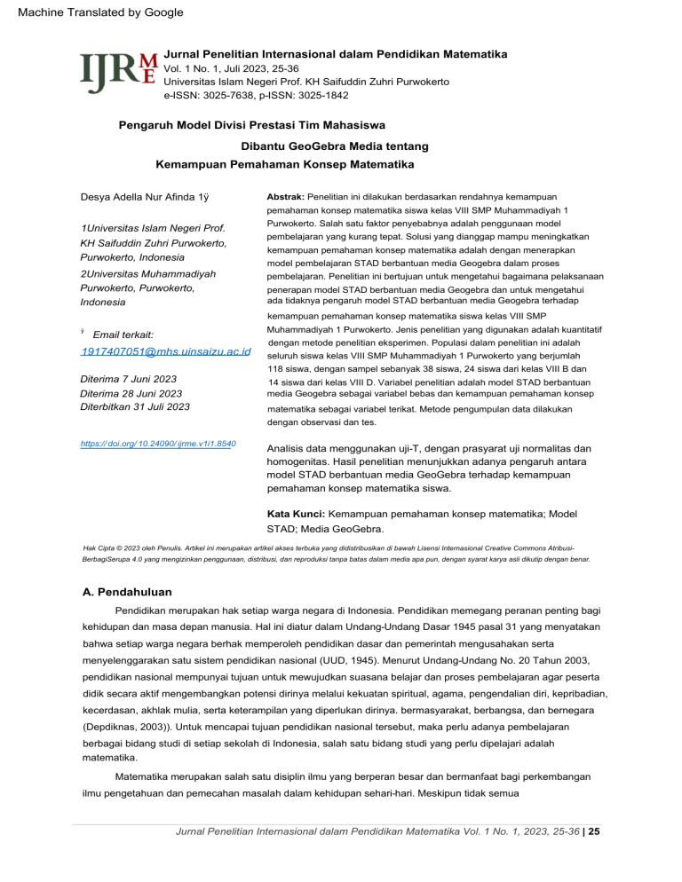 Machine Translated by Google Jurnal Penelitian Internasional dalam Pendidikan Matematika Vol. 1 No. 1, Juli 2023, 25-36 Universitas Islam Negeri Prof. KH Saifuddin Zuhri Purwokerto e-ISSN: 3025-7638, p-ISSN: 3025-1842 Pengaruh Model Divisi Prestasi Tim Mahasiswa Dibantu GeoGebra Media tentang Kemampuan Pemahaman Konsep Matematika Desya Adella Nur Afinda 1ÿ Abstrak: Penelitian ini dilakukan berdasarkan rendahnya kemampuan pemahaman konsep matematika siswa kelas VIII SMP Muhammadiyah 1 1Universitas Islam Negeri Prof. KH Saifuddin Zuhri Purwokerto, Purwokerto, Indonesia 2Universitas Muhammadiyah Purwokerto, Purwokerto, Indonesia Purwokerto. Salah satu faktor penyebabnya adalah penggunaan model pembelajaran yang kurang tepat. Solusi yang dianggap mampu meningkatkan kemampuan pemahaman konsep matematika adalah dengan menerapkan model pembelajaran STAD berbantuan media Geogebra dalam proses pembelajaran. Penelitian ini bertujuan untuk mengetahui bagaimana pelaksanaan penerapan model STAD berbantuan media Geogebra dan untuk mengetahui ada tidaknya pengaruh model STAD berbantuan media Geogebra terhadap kemampuan pemahaman konsep matematika siswa kelas VIII SMP ÿ Muhammadiyah 1 Purwokerto. Jenis penelitian yang digunakan adalah kuantitatif Email terkait: dengan metode penelitian eksperimen. Populasi dalam penelitian ini adalah [email protected] seluruh siswa kelas VIII SMP Muhammadiyah 1 Purwokerto yang berjumlah 118 siswa, dengan sampel sebanyak 38 siswa, 24 siswa dari kelas VIII B dan Diterima 7 Juni 2023 Diterima 28 Juni 2023 Diterbitkan 31 Juli 2023 14 siswa dari kelas VIII D. Variabel penelitian adalah model STAD berbantuan media Geogebra sebagai variabel bebas dan kemampuan pemahaman konsep matematika sebagai variabel terikat. Metode pengumpulan data dilakukan dengan observasi dan tes. https:// doi.org/ 10.24090/ ijrme.v1i1.8540 Analisis data menggunakan uji-T, dengan prasyarat uji normalitas dan homogenitas. Hasil penelitian menunjukkan adanya pengaruh antara model STAD berbantuan media GeoGebra terhadap kemampuan pemahaman konsep matematika siswa. Kata Kunci: Kemampuan pemahaman konsep matematika; Model STAD; Media GeoGebra. Hak Cipta © 2023 oleh Penulis. Artikel ini merupakan artikel akses terbuka yang didistribusikan di bawah Lisensi Internasional Creative Commons AtribusiBerbagiSerupa 4.0 yang mengizinkan penggunaan, distribusi, dan reproduksi tanpa batas dalam media apa pun, dengan syarat karya asli dikutip dengan benar. A. Pendahuluan Pendidikan merupakan hak setiap warga negara di Indonesia. Pendidikan memegang peranan penting bagi kehidupan dan masa depan manusia. Hal ini diatur dalam Undang-Undang Dasar 1945 pasal 31 yang menyatakan bahwa setiap warga negara berhak memperoleh pendidikan dasar dan pemerintah mengusahakan serta menyelenggarakan satu sistem pendidikan nasional (UUD, 1945). Menurut Undang-Undang No. 20 Tahun 2003, pendidikan nasional mempunyai tujuan untuk mewujudkan suasana belajar dan proses pembelajaran agar peserta didik secara aktif mengembangkan potensi dirinya melalui kekuatan spiritual, agama, pengendalian diri, kepribadian, kecerdasan, akhlak mulia, serta keterampilan yang diperlukan dirinya. bermasyarakat, berbangsa, dan bernegara (Depdiknas, 2003)). Untuk mencapai tujuan pendidikan nasional tersebut, maka perlu adanya pembelajaran berbagai bidang studi di setiap sekolah di Indonesia, salah satu bidang studi yang perlu dipelajari adalah matematika. Matematika merupakan salah satu disiplin ilmu yang berperan besar dan bermanfaat bagi perkembangan ilmu pengetahuan dan pemecahan masalah dalam kehidupan sehari-hari. Meskipun tidak semua Jurnal Penelitian Internasional dalam Pendidikan Matematika Vol. 1 No. 1, 2023, 25-36 | 25 Machine Translated by Google Afinda, DAN, Pengaruh Siswa... Masalah matematika merupakan masalah yang kompleks, dan matematika berperan penting dalam penyelesaian masalah. Selain itu, matematika juga merupakan salah satu mata pelajaran utama di setiap jenjang pendidikan (Kamarullah, 2017). Oleh karena itu, penguasaan matematika sangat dibutuhkan di setiap jenjang pendidikan, salah satunya pendidikan menengah. Mengingat pentingnya pembelajaran matematika bagi pendidikan dan kelangsungan hidup, setiap siswa, baik usia dini hingga paruh baya, harus mampu menguasai matematika. Menurut Permendiknas No. 22 Tahun 2006, pembelajaran matematika bertujuan agar peserta didik memiliki kemampuan memahami konsep matematika, menjelaskan keterkaitan antar konsep, dan menerapkan konsep atau algoritma secara fleksibel, akurat, efisien, dan tepat dalam menyelesaikan masalah (BSNP, 2006). Selain itu, tujuan pembelajaran matematika juga tertuang dalam Permendiknas tahun 2003 yang bertujuan agar peserta didik memiliki kemampuan memahami konsep matematika, melakukan penalaran, pemecahan masalah, komunikasi matematika dengan tabel, simbol, diagram, dan lain-lain, serta memiliki sikap menghargai penerapan matematika dalam kehidupan sehari-hari (Depdiknas, 2003). Dari penjelasan tersebut untuk mencapai tujuan pembelajaran matematika, peserta didik harus menguasai beberapa kemampuan, salah satunya adalah kemampuan pemahaman konsep matematika. Pemahaman konseptual merupakan kemampuan dasar yang sangat penting untuk dimiliki siswa. Pentingnya pemahaman konsep dikemukakan oleh Santrock dalam buku Hendriana (2021) yang mengatakan bahwa pemahaman konsep merupakan faktor penting dalam proses pembelajaran. Dalam memahami konsep siswa tidak hanya menghafal konsep yang telah dipelajarinya, tetapi juga mampu mengungkapkan kembali dalam bahasa sendiri atau bentuk lain yang mudah dipahami, memberikan interpretasi data dan mampu menerapkan konsep dalam berbagai pemecahan masalah (Sanjaya, 2009). Pentingnya kemampuan siswa dalam mengungkapkan kembali konsep dalam bahasa sendiri, memberikan interpretasi data, dan menerapkan konsep dalam pemecahan masalah adalah agar siswa dapat membangun pemahaman yang lebih mendalam dan bermakna. Hal ini sejalan dengan pendapat Winarno yang dik