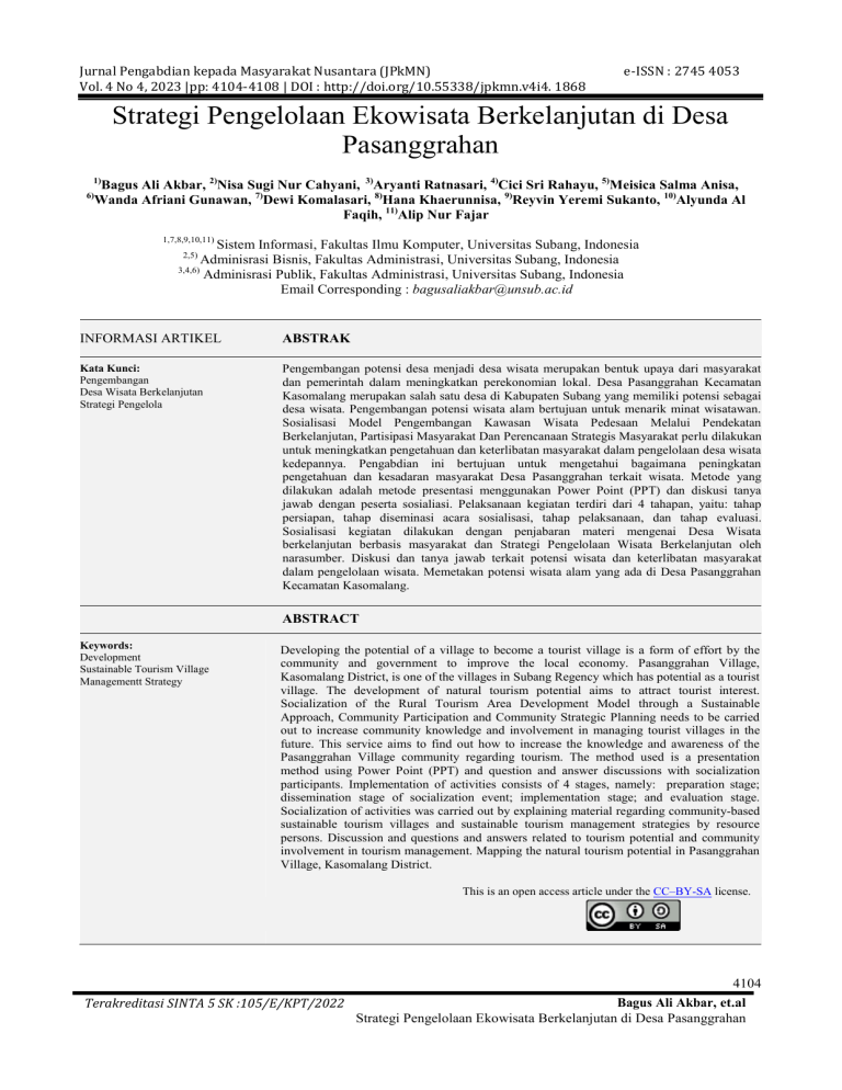 Jurnal Pengabdian kepada Masyarakat Nusantara (JPkMN) Vol. 4 No 4, 2023 |pp: 4104-4108 | DOI : http://doi.org/10.55338/jpkmn.v4i4. 1868 e-ISSN : 2745 4053 Strategi Pengelolaan Ekowisata Berkelanjutan di Desa Pasanggrahan 1) 6) Bagus Ali Akbar, 2)Nisa Sugi Nur Cahyani, 3)Aryanti Ratnasari, 4)Cici Sri Rahayu, 5)Meisica Salma Anisa, Wanda Afriani Gunawan, 7)Dewi Komalasari, 8)Hana Khaerunnisa, 9)Reyvin Yeremi Sukanto, 10)Alyunda Al Faqih, 11)Alip Nur Fajar 1,7,8,9,10,11) Sistem Informasi, Fakultas Ilmu Komputer, Universitas Subang, Indonesia Adminisrasi Bisnis, Fakultas Administrasi, Universitas Subang, Indonesia 3,4,6) Adminisrasi Publik, Fakultas Administrasi, Universitas Subang, Indonesia Email Corresponding : [email protected] 2,5) INFORMASI ARTIKEL ABSTRAK Kata Kunci: Pengembangan Desa Wisata Berkelanjutan Strategi Pengelola Pengembangan potensi desa menjadi desa wisata merupakan bentuk upaya dari masyarakat dan pemerintah dalam meningkatkan perekonomian lokal. Desa Pasanggrahan Kecamatan Kasomalang merupakan salah satu desa di Kabupaten Subang yang memiliki potensi sebagai desa wisata. Pengembangan potensi wisata alam bertujuan untuk menarik minat wisatawan. Sosialisasi Model Pengembangan Kawasan Wisata Pedesaan Melalui Pendekatan Berkelanjutan, Partisipasi Masyarakat Dan Perencanaan Strategis Masyarakat perlu dilakukan untuk meningkatkan pengetahuan dan keterlibatan masyarakat dalam pengelolaan desa wisata kedepannya. Pengabdian ini bertujuan untuk mengetahui bagaimana peningkatan pengetahuan dan kesadaran masyarakat Desa Pasanggrahan terkait wisata. Metode yang dilakukan adalah metode presentasi menggunakan Power Point (PPT) dan diskusi tanya jawab dengan peserta sosialiasi. Pelaksanaan kegiatan terdiri dari 4 tahapan, yaitu: tahap persiapan, tahap diseminasi acara sosialisasi, tahap pelaksanaan, dan tahap evaluasi. Sosialisasi kegiatan dilakukan dengan penjabaran materi mengenai Desa Wisata berkelanjutan berbasis masyarakat dan Strategi Pengelolaan Wisata Berkelanjutan oleh narasumber. Diskusi dan tanya jawab terkait potensi wisata dan keterlibatan masyarakat dalam pengelolaan wisata. Memetakan potensi wisata alam yang ada di Desa Pasanggrahan Kecamatan Kasomalang. ABSTRACT Keywords: Development Sustainable Tourism Village Managementt Strategy Developing the potential of a village to become a tourist village is a form of effort by the community and government to improve the local economy. Pasanggrahan Village, Kasomalang District, is one of the villages in Subang Regency which has potential as a tourist village. The development of natural tourism potential aims to attract tourist interest. Socialization of the Rural Tourism Area Development Model through a Sustainable Approach, Community Participation and Community Strategic Planning needs to be carried out to increase community knowledge and involvement in managing tourist villages in the future. This service aims to find out how to increase the knowledge and awareness of the Pasanggrahan Village community regarding tourism. The method used is a presentation method using Power Point (PPT) and question and answer discussions with socialization participants. Implementation of activities consists of 4 stages, namely: preparation stage; dissemination stage of socialization event; implementation stage; and evaluation stage. Socialization of activities was carried out by explaining material regarding community-based sustainable tourism villages and sustainable tourism management strategies by resource persons. Discussion and questions and answers related to tourism potential and community involvement in tourism management. Mapping the natural tourism potential in Pasanggrahan Village, Kasomalang District. This is an open access article under the CC–BY-SA license. 4104 Bagus Ali Akbar, et.al Terakreditasi SINTA 5 SK :105/E/KPT/2022 Strategi Pengelolaan Ekowisata Berkelanjutan di Desa Pasanggrahan Jurnal Pengabdian kepada Masyarakat Nusantara (JPkMN) Vol. 4 No 4, 2023 |pp: 4104-4108 | DOI : http://doi.org/10.55338/jpkmn.v4i4. 1868 e-ISSN : 2745 4053 I. PENDAHULUAN Pariwisata merupakan salah satu sektor yang mendukung dan sangat berarti terhadap pembangunan (Kustanto, 2019), karena melalui pariwisata dapat diperoleh dana dan jasa bagi pembangunan (Arliman S, 2018), diantaranya dapat dilihat dari bentuk devisa, pajak dan distribusi yang diperoleh dari perusahaanperusahaan yang bergerak dibidang pariwisata (Sapitri, et. al., 2019). Salah satu hal yang diperlukan dalam pengembangan pariwisata adalah keterlibatan maasyarakat (Rasyid et. al., 2021). Masyarakat yang terlibat merupakan partisipasi masyarakat yang berlangsung secara sukarela dan adanya keberlanjutan (Ira & Muhamad, 2020). Dalam pengembangan desa-desa wisata, setidaknya ada tiga pihak yang berperan penting, yaitu wisatawan, penduduk setempat dan pariwisata bisnis atau perantara (Sofianto, 2018). Ketiga faktor tersebut harus sepenuhnya bergabung untuk meninjau pariwisata industri yang dapat memastikan semua pihak (Putri & Suyuthie, 2021). Pengembangan pariwisata yang baik harus memberikan keuntungan ekonomi, sosial dan budaya kepada komunitas di sekitar objek wisata (Mulyana, 2019). Tujuan dari pengembangan desa wisata yaitu untuk memberikan Strategi Pengelolaan Ekowisata Berkelanjutan di Desa Pasanggrahan. Desa Pasanggrahan merupakan salah satu desa yang ada di Kecamatan Kasomalang, Kabupaten Subang, Jawa Barat, yang dijadikan tempat sasaran dalam pengabdian masyarakat bagi mahasiswa, Desa Pasanggrahan merupakan gabungan dari desa Ciupih dan desa Cipatat. Nama Pasanggrahan diangkat oleh nama kampung Pasanggrahan, karena Pasanggrahan merupakan tempat beristirahat dan bermusyawarah yang artinya desa pasanggrahan. Desa Pasanggrahan merupakan salah satu desa wisata dengan kekayaan sumber daya alam yang melimpah serta tercatat sebagai Desa Wisata yang ada di Kabupaten Subang. Desa Wisata Pasanggrahan memiliki tempat wisata yang cukup populer. Wisata tersebut terdiri dari Sumber mata a