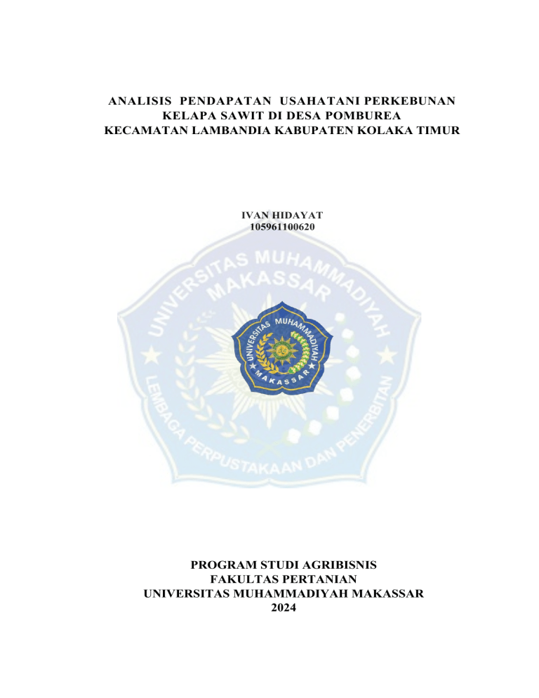 ANALISIS PENDAPATAN USAHATANI PERKEBUNAN KELAPA SAWIT DI DESA POMBUREA KECAMATAN LAMBANDIA KABUPATEN KOLAKA TIMUR IVAN HIDAYAT 105961100620 PROGRAM STUDI AGRIBISNIS FAKULTAS PERTANIAN UNIVERSITAS MUHAMMADIYAH MAKASSAR 2024 i ANALISIS PENDAPATAN USAHATANI PERKEBUNAN KELAPA SAWIT DI DESA POMBUREA KECAMATAN LAMBANDIA KABUPATEN KOLAKA TIMUR SKRIPSI Untuk Memenuhi Sebagai Persyaratan Guna Mencapai Gelar Sarjana Pertanian Agribisnis Strata Satu (S-1) PROGRAM STUDI AGRIBISNIS FAKULTAS PERTANIAN UNIVERSITAS MUHAMMADIYAH MAKASSAR 2024 ii PERNYATAAN MENGENAI SKRIPSI DAN SUMBER INFORMASI Dengan ini menyatakan bahwa skripsi yang berjudul adalah Analisis Pendapatan Usahatani Perkebunan Kelapa Sawit di Desa Pomburea Kecamatan Lambandia Kabupaten Kolaka Timur benar merupakan hasil karya yang belum diajukan dalam bentuk apapun kepada perguruan tinggi manapun. Semua sumber data dan informasi yang berasal atau dikutip dari yang telah diterbitkan maupun yang tidak diterbitkan dari penulis lain telah disebutkan dalam teks dan dicantumkan dalam daftar pustaka dibagian akhir skripsi ini. Makassar,05 Juni 2024 Ivan Hidayat 105961100620 v ABSTRAK Ivan Hidayat. 105961100620. Analisis Pendapatan Usahatani Perkebunan Kelapa Sawit di Desa Pomburea Kecamatan Lambandia Kabupaten Kolaka Timur. Dibimbing oleh Reni Fatmasari Syafruddin dan Asriyanti Syarif. Penelitian ini bertujuan untuk menganalisis pendapatan dan kelayakan usahatani perkebunan kelapa sawit di Desa Pomburea Kecamatan Lambandia Kabupaten Kolaka Timur. Metode pengambilan responden dilakukan secara sample random sampling yang diambil secara acak sederhana dalam penelitian ini jumlah populasi yaitu 140 orang petani yang diambil sebesar 25 % dari populasi, sehingga jumlah responden yang diperoleh sebanyak 35 orang. Kemudian dilakukan analisis data menggunakan pendapatan dan R/C ratio untuk mengetahui pendapatan dan kelayakan usahatani perkebunan kelapa sawit. Hasil penelitian menunjukkan bahwa rata-rata pendapatan petani pada usahatani kelapa sawit adalah sebesar Rp. 26.201.991 Per hektar Per tahun dengan rata rata luas lahan yang dikuasai sebesar 3,94 Ha. Nilai kelayakan R/C Ratio usahatani kelapa sawit sebesar Rp. 3,00 artinya bahwa apabila petani mengeluarkan biaya sebesar Rp. 1 maka diperoleh penerimaan sebesar Rp. 3,00 sehingga petani kelapa sawit menguntungkan atau layak untuk diusahakan. Kata Kunci : Pendapatan, kelayakan, produksi, kelapa sawit vi ABSTRACT Ivan Hidayat. 105961100620. Analysis of Oil Palm Plantation Farming Income in Pomburea Village, Lambandia District, East Kolaka Regency. Supervised by Reni Fatmasari Syafruddin and Asriyanti Syarif. This study aims to analyze the income and feasibility of oil palm plantation farming in Pomburea Village, Lambandia District, East Kolaka Regency. The method of taking respondents was carried out by random sampling which was taken randomly in this study, the population was 140 farmers who were taken as much as 25% of the population, so that the number of respondents obtained was 35 people. Then data analysis was carried out using income and R/C ratio to determine the income and feasibility of oil palm plantation farming. The results of the study showed that the average income of farmers in oil palm farming was Rp. 26,201,991 per hectare with an average land area controlled of 3.94 Ha. The feasibility value of the R/C Ratio of oil palm farming was Rp. 3,00 meaning that if farmers spend Rp. 1, then they will get Rp. 3,00 so that oil palm farmers are profitable or feasible to be cultivated in the next period. Keywords: Income, feasibility, production, oil palm vii PRAKATA Puji dan syukur penulis panjatkan kehadirat allah SWT atas segala rahmat dan hidayah yang tiada henti diberikan kepada hamba-nya. Shalawat dan salam tak lupa penulis kirimkan kepada rasulullah SAW beserta para keluarga, sahabat dan para pengikutnya, sehingga penulis dapat menyelesaikan skripsi yang berjudul “Analisis Pendapatan Usahatani Perkebunan Kelapa Sawit di Desa Pomburea Kecamatan Lambandia Kabupaten Kolaka Timur”. Skripsi ini merupakan tugas akhir yang bertujuan untuk memenuhi syarat dalam memperoleh gelar Sarjana Pertanian pada Fakultas Pertanian Universitas Muhammadiyah Makassar. Penulis menyadari bahwa penyusunan skripsi ini tidak akan terwujud tanpa adanya bantuan dan dorongan dari berbagai pihak. Oleh karena itu pada kesempatan ini penulis menyampaikan ucapan terima kasih kepada: 1. Dr. Reni Fatmasari Syafruddin, S.P., M.Si selaku pembimbing utama dan Ibu Asriyanti Syarif, S.P., M.Si selaku pembimbing pendamping yang senantiasa meluangkan waktunya membimbing dan mengarahkan penulis, sehingga skripsi ini dapat diselesaikan tepat waktu. 2. Dr. Ir. Andi Khaeriyah, M.Pd., IPU. selaku Dekan Fakultas Pertanian Universitas Muhammadiyah Makassar. 3. Dr. Nadir, S.P., M.Si selaku ketua Program Studi Agribisnis Fakultas Pertanian dan Bapak Muh. Ikmal Saleh, S.P., M.Si selaku sekretaris Program Studi Agribisnis Fakultas Pertanian. viii 4. Segenap Dosen Program Studi Agribisnis yang telah memberikan ilmunya kepada penulis. 5. Orang tua dan saudara atas doa dan bimbingan serta kasih sayang dan dukungannya selama ini. 6. Semua pihak yang telah membantu menyelesaikan tugas akhir ini yang tidak bisa disebut satu persatu. Penulis menyadari bahwa dalam penulisan ini masih jauh dari sempurna dan masih banyak kekurangan, sehingga kritik dan saran yang bersifat membangun diharapkan dari semua pihak dapat memberikan manfaat semua pihak. Akhir kata penulis ucapkan banyak terimakasih kepada semua pihak yang terkait dalam penulisan skripsi ini. Makassar, 05 Juni 2024 Ivan Hidayat ix DAFTAR ISI HALAMAN SAMPUL ....................................................................................... i HALAMAN JUDUL .......................................................................................... ii HALAMAN PENGESAHAN ........................................................................... iii PENGESAHAN KOMISI PENGUJI .....................