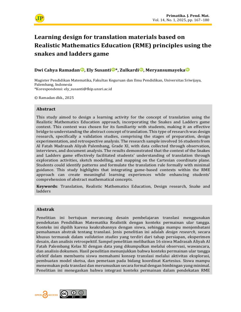 Primatika. J. Pend. Mat. Vol. 14, No. 1, 2025, pp. 167–180 Learning design for translation materials based on Realistic Mathematics Education (RME) principles using the snakes and ladders game Dwi Cahya Ramadan , Ely Susanti *, Zulkardi , Meryansumayeka Magister Pendidikan Matematika, Fakultas Keguruan dan Ilmu Pendidikan, Universitas Sriwijaya, Palembang, Indonesia *Korespondensi: [email protected] © Ramadan dkk., 2025 Abstract This study aimed to design a learning activity for the concept of translation using the Realistic Mathematics Education approach, incorporating the Snakes and Ladders game context. This context was chosen for its familiarity with students, making it an effective bridge to understanding the abstract concept of translation. This type of research was design research, specifically a validation studies, comprising the stages of preparation, design experimentation, and retrospective analysis. The research sample involved 16 students from Al Fatah Madrasah Aliyah Palembang, Grade XI, with data collected through observation, interviews, and document analysis. The results demonstrated that the context of the Snakes and Ladders game effectively facilitated students' understanding of translation through exploration activities, sketch modelling, and mapping on the Cartesian coordinate plane. Students could identify patterns and formulate the translation rule formally with minimal guidance. This study highlights that integrating game-based contexts within the RME approach can create meaningful learning experiences while enhancing students' comprehension of abstract mathematical concepts. Keywords: Translation, Realistic Mathematics Education, Design research, Snake and ladders Abstrak Penelitian ini bertujuan merancang desain pembelajaran translasi menggunakan pendekatan Pendidikan Matematika Realistik dengan konteks permainan ular tangga. Konteks ini dipilih karena keakrabannya dengan siswa, sehingga mampu menjembatani pemahaman abstrak tentang translasi. Jenis penelitian ini adalah design research, secara khusus termasuk dalam validation studies yang terdiri dari tahap persiapan, eksperimen desain, dan analisis retrospektif. Sampel penelitian melibatkan 16 siswa Madrasah Aliyah Al Fatah Palembang Kelas XI dengan data yang dikumpulkan melalui observasi, wawancara, dan analisis dokumen. Hasil penelitian menunjukkan bahwa konteks permainan ular tangga efektif dalam membantu siswa memahami konsep translasi melalui aktivitas eksplorasi, pembuatan model sketsa, dan pemetaan pada bidang koordinat Kartesius. Siswa mampu menemukan pola translasi dan merumuskan secara formal dengan bimbingan yang minimal. Penelitian ini menegaskan bahwa integrasi konteks permainan dalam pendekatan RME 168 Learning design for translation materials based on Realistic Mathematics Education (RME) … dapat menciptakan pembelajaran yang bermakna, sekaligus meningkatkan pemahaman siswa terhadap konsep matematika yang abstrak. Kata kunci: Translasi, Realistic Mathematics Education, Desain penelitian, Ular tangga How to Cite: Ramadan, D. C., Susanti, E., Zulkardi, & Meryansumayeka. (2025). Learning design for translation materials based on Realistic Mathematics Education (RME) principles using the snakes and ladders game. Primatika: Jurnal Pendidikan Matematika, 14(1), 167–180. https://doi.org/10.30872/primatika.v14i1.4857 INTRODUCTION Mathematics is the foundation for various disciplines (Syutaridho et al., 2025). It is a fundamental component of the curriculum that should be provided to all students (Samsinar et al., 2023). Mathematics education should encourage students to actively explore, reflect, and construct knowledge, not just receive facts (Purwati, 2023). This process includes developing critical thinking skills to understand concepts and relationships between concepts, where students are encouraged to gain understanding through experiences with the properties possessed or not possessed by a set of objects (Bhoke, 2020). A topic requiring deep knowledge in mathematics education is geometric transformations (Auliya & Wahyuni, 2024). This study focuses exclusively on the topic of translation. Translation is a topic that discusses the shifting of all points in a figure uniformly in direction and distance (Sutopo & Ratu, 2022). Students’ difficulties often lie in imagining the results of a plane's reflection, rotation, and dilation (Ardinata et al., 2020). These difficulties stem from monotonous teaching methods and the overly abstract nature of the material, making it hard to understand (Nurhayati, 2023). These challenges emphasise the need for more contextual teaching methods that connect mathematical concepts to real-life situations, making them more comprehensible for students. The Realistic Mathematics Education (RME) approach has effectively addressed these issues. RME is an instructional approach in mathematics that originated and was further developed by the Freudenthal Institute in the Netherlands (Da, 2023). RME aims to enhance students' abilities in critical thinking and mathematical creativity (Palinussa et al., 2021). This approach encourages students to explore, discover, and use mathematics to solve problems individually and in groups (Putri & Zulkardi, 2019). To help students better grasp abstract mathematical concepts, mathematics teachers should implement RME in their classrooms (Laurens et al., 2017). The use of the RME approach can enhance learning outcomes (Fauzi et al., 2021). For example, research conducted by Yuniarti (2022) stated that students’ mathematical understanding improves alongside student-constructed results in each RME activity. Further, research by Mufti & Aziz (2024) showed that following the steps of RME can lead to achieving learning objectives. Another study by Lestari et al. (2021) revealed that RME learning designs for translation and reflection topics can help students’ conceptual understanding. https://doi.org/10.30872/primatika.v14i1.4857 Ramada