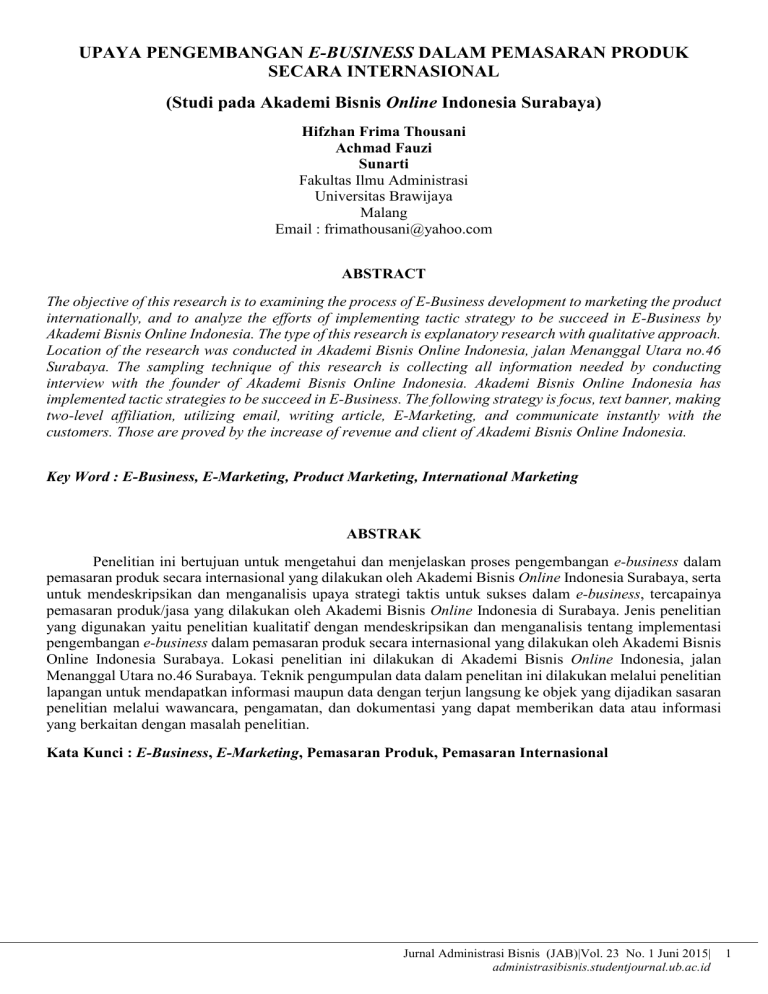 UPAYA PENGEMBANGAN E-BUSINESS DALAM PEMASARAN PRODUK SECARA INTERNASIONAL (Studi pada Akademi Bisnis Online Indonesia Surabaya) Hifzhan Frima Thousani Achmad Fauzi Sunarti Fakultas Ilmu Administrasi Universitas Brawijaya Malang Email : [email protected] ABSTRACT The objective of this research is to examining the process of E-Business development to marketing the product internationally, and to analyze the efforts of implementing tactic strategy to be succeed in E-Business by Akademi Bisnis Online Indonesia. The type of this research is explanatory research with qualitative approach. Location of the research was conducted in Akademi Bisnis Online Indonesia, jalan Menanggal Utara no.46 Surabaya. The sampling technique of this research is collecting all information needed by conducting interview with the founder of Akademi Bisnis Online Indonesia. Akademi Bisnis Online Indonesia has implemented tactic strategies to be succeed in E-Business. The following strategy is focus, text banner, making two-level affiliation, utilizing email, writing article, E-Marketing, and communicate instantly with the customers. Those are proved by the increase of revenue and client of Akademi Bisnis Online Indonesia. Key Word : E-Business, E-Marketing, Product Marketing, International Marketing ABSTRAK Penelitian ini bertujuan untuk mengetahui dan menjelaskan proses pengembangan e-business dalam pemasaran produk secara internasional yang dilakukan oleh Akademi Bisnis Online Indonesia Surabaya, serta untuk mendeskripsikan dan menganalisis upaya strategi taktis untuk sukses dalam e-business, tercapainya pemasaran produk/jasa yang dilakukan oleh Akademi Bisnis Online Indonesia di Surabaya. Jenis penelitian yang digunakan yaitu penelitian kualitatif dengan mendeskripsikan dan menganalisis tentang implementasi pengembangan e-business dalam pemasaran produk secara internasional yang dilakukan oleh Akademi Bisnis Online Indonesia Surabaya. Lokasi penelitian ini dilakukan di Akademi Bisnis Online Indonesia, jalan Menanggal Utara no.46 Surabaya. Teknik pengumpulan data dalam penelitan ini dilakukan melalui penelitian lapangan untuk mendapatkan informasi maupun data dengan terjun langsung ke objek yang dijadikan sasaran penelitian melalui wawancara, pengamatan, dan dokumentasi yang dapat memberikan data atau informasi yang berkaitan dengan masalah penelitian. Kata Kunci : E-Business, E-Marketing, Pemasaran Produk, Pemasaran Internasional Jurnal Administrasi Bisnis (JAB)|Vol. 23 No. 1 Juni 2015| administrasibisnis.studentjournal.ub.ac.id 1 PENDAHULUAN Globalisasi merupakan sebuah fenomena di mana negara-negara di dunia secara langsung maupun tidak langsung mengharapkan terjadinya sebuah interaksi antara masyarakat yang jauh lebih efektif dan efisien dibandingkan dengan saat-saat sebelumnya. Proses interaksi dan komunikasi antar negara-negara akan jauh lebih intens dibandingkan dengan apa yang selama ini pernah terjadi. Keadaan seperti ini menjadi suatu kenyataan bahwa globalisasi telah membuka isolasi batasan antar negara-negara yang selama ini berlaku terutama untuk hal-hal yang berhubungan dengan politik, ekonomi, sosial, budaya, dan hukum akibat sedemikian cepat dan akuratnya informasi mengalir dari suatu tempat ke tempat yang lain. Perkembangan teknologi informasi telah menciptakan banyak terobosan baru di segala bidang. Setiap terobosan baru tersebut telah banyak digunakan dan semakin memudahkan bagi para penggunanya. Berkembangnya sistem komputerisasi mulai dari personal komputer ke laptop hingga ke komputer genggam atau yang lebih dikenal dengan tablet Personal Computer (PC) dan juga terjadinya perubahan dari sistem personal komputer menjadi system jaringan LAN dan WAN yang dapat menghubungkan komputer dalam suatu area tertentu, sampai ke jaringan yang dapat menghubungkan seluruh dunia yang dikenal sebagai internet. Internet telah merubah banyak hal di Indonesia, bukan hanya di Indonesia yang merasakan perubahannya bahkan seluruh dunia merasakan perubahan akibat adanya internet, perubahan tersebut khususnya di dalam pemenuhan kebutuhan akan informasi dan sistem jaringan yang luas mempermudah akses informasi secara cepat dan lebih fleksibel. Berkembangnya teknologi dan informasi membuat informasi semakin mudah didapatkan bahkan dengan berkembangnya informasi yang begitu cepat, kita harus pintar memilah mana informasi yang berguna atau tidak. Penggunaan internet di dunia bisnis sudah berubah fungsi yang awalnya hanya sebagai alat untuk pertukaran informasi secara elektronik saat ini menjadi alat untuk aplikasi strategi bisnis, seperti pemasaran dan pelayanan pelanggan. Pemasaran di internet cederung menembus berbagai rintangan, batas tempat, waktu, dan aturan yang berlaku. Pemasaran yang ada sebelumnya hanyalah memalui kerjasama dengan berbagai pihak lain. Adanya internet, saat ini pemasaran terhadap perusahaan, produk, dan pelayanan menjadi proses yang interaktif. Situs website perusahaan bukan hanya sekedar menyajikan katalog produk dan media promosi, melainkan digunakan untuk berdialog, berkonsultasi, dan berdiskusi dengan konsumen secara online, bulletin boards, kuesioner elektronik, mailing lists, dan pengiriman surat elektronik, sehingga konsumen dapat dilibatkan secara langsung dalam perancangan, pengembangan, pemasaran, dan penjualan produk. TINJAUAN PUSTAKA Pemasaran a. Definisi Kotler dan Armstrong (2003 : 5) menjelaskan bahwa pemasaran adalah “proses pemberian kepuasan kepada konsumen untuk mendapatkan laba. Dua sasaran pemasaran yang utama adalah menarik konsumen baru dengan menjanjikan nilai yang unggul dan mempertahankan konsumen saat ini dengan memberikan kepuasan. Banyak yang menganggap bidang ini identik atau sama dengan bidang penjualan. Sebenarnya pemasaran memiliki arti yang lebih luas daripada penjualan. Bidang penjualan merupakan bagian dari bidang pemasaran, sekaligus merupakan bagian terpenting dari bidang pemasaran itu sendiri. Pemasaran berarti bekerja dengan pasar untuk mewujudkan pertukar
