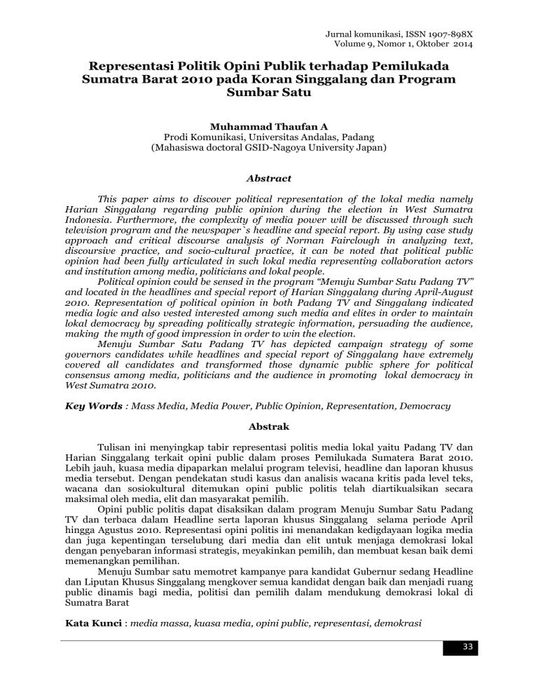 Jurnal komunikasi, ISSN 1907-898X Volume 9, Nomor 1, Oktober 2014 Representasi Politik Opini Publik terhadap Pemilukada Sumatra Barat 2010 pada Koran Singgalang dan Program Sumbar Satu Muhammad Thaufan A Prodi Komunikasi, Universitas Andalas, Padang (Mahasiswa doctoral GSID-Nagoya University Japan) Abstract This paper aims to discover political representation of the lokal media namely Harian Singgalang regarding public opinion during the election in West Sumatra Indonesia. Furthermore, the complexity of media power will be discussed through such television program and the newspaper`s headline and special report. By using case study approach and critical discourse analysis of Norman Fairclough in analyzing text, discoursive practice, and socio-cultural practice, it can be noted that political public opinion had been fully articulated in such lokal media representing collaboration actors and institution among media, politicians and lokal people. Political opinion could be sensed in the program “Menuju Sumbar Satu Padang TV” and located in the headlines and special report of Harian Singgalang during April-August 2010. Representation of political opinion in both Padang TV and Singgalang indicated media logic and also vested interested among such media and elites in order to maintain lokal democracy by spreading politically strategic information, persuading the audience, making the myth of good impression in order to win the election. Menuju Sumbar Satu Padang TV has depicted campaign strategy of some governors candidates while headlines and special report of Singgalang have extremely covered all candidates and transformed those dynamic public sphere for political consensus among media, politicians and the audience in promoting lokal democracy in West Sumatra 2010. Key Words : Mass Media, Media Power, Public Opinion, Representation, Democracy Abstrak Tulisan ini menyingkap tabir representasi politis media lokal yaitu Padang TV dan Harian Singgalang terkait opini public dalam proses Pemilukada Sumatera Barat 2010. Lebih jauh, kuasa media dipaparkan melalui program televisi, headline dan laporan khusus media tersebut. Dengan pendekatan studi kasus dan analisis wacana kritis pada level teks, wacana dan sosiokultural ditemukan opini public politis telah diartikualsikan secara maksimal oleh media, elit dan masyarakat pemilih. Opini public politis dapat disaksikan dalam program Menuju Sumbar Satu Padang TV dan terbaca dalam Headline serta laporan khusus Singgalang selama periode April hingga Agustus 2010. Representasi opini politis ini menandakan kedigdayaan logika media dan juga kepentingan terselubung dari media dan elit untuk menjaga demokrasi lokal dengan penyebaran informasi strategis, meyakinkan pemilih, dan membuat kesan baik demi memenangkan pemilihan. Menuju Sumbar satu memotret kampanye para kandidat Gubernur sedang Headline dan Liputan Khusus Singgalang mengkover semua kandidat dengan baik dan menjadi ruang public dinamis bagi media, politisi dan pemilih dalam mendukung demokrasi lokal di Sumatra Barat Kata Kunci : media massa, kuasa media, opini public, representasi, demokrasi 33 Jurnal komunikasi, Volume 9, Nomor 1, Oktober 2014 Pendahuluan Media massa mainstream terutama surat kabar dan televisi sebelum massifnya media sosial berperan penting dalam hajatan politik di Indonesia. Media massa menyajikan informasi kepada publik luas pelbagai isu politik hangat aktual, menciptakan ruang debat seperti polemik pilkada langsung atau tak langsung seperti saat ini, dan juga mengartikulasikan ragam aspirasi. Strategi komunikasi dan aksi politik membentuk opini publik dalam pemilihan Gubernur, Kepala Daerah dan event politik lainnya sungguh tak dapat lagi dipisahkan dari peran strategis media yang menjadi makin penting. Strategi politik meniscayakan media massa tak hanya menciptakan realitas baru yang politis, mengintensifkan agenda publik tetapi juga dipicu menguatnya nalar media saat ini di era teater debat dan praksis demokrasi di Indonesia. Media massa menjelang momentum politik besar seringkali menampilkan program acara dan rubrik berita kepada masyarakat yang menghadirkan kandidat dan pengamat politik berupa diskusi politik, pidato, iklan politik, debat kandidat, poling opini publik, dan bahkan persoalan pencitraan politik hingga wilayah privasi kontestan politik (Brants and Voltmer, 2011). Media massa dengan segenap sumber daya dan kepentingannya mencoba meragamkan dan mengarahkan opini publik untuk memengaruhi khalayak dalam proses politik (Pawito, 2008; Gurevitch, et al, 2005 ). Tulisan mengenai proses pemilihan Gubernur, Walikota dan Bupati 2010 yang telah berlangsung secara serentak di Sumatara Barat ini penting dan relevan untuk memahami rekam jejak dan karakter hajatan politik di level lokal dalam relasinya dengan media massa lokal untuk membangun argumentasi pentingnya partisipasi politik lokal demi 34 masa depan demokrasi di Sumatra Barat. Pemilihan tersebut menjadi penentu transisi demokrasi lokal yang masih sangat krusial untuk tak terjadinya penyimpangan dan kemunduran dalam gaya politik otoriter masa lalu (Zakaria, 2004) dan munculnya elit status quo di level lokal (Hadis, 2005). Di samping pemilihan di level provinsi, kabupaten dan kota yang menggelar Pilkada serentak di Provinsi Sumbar 2010 meliputi Agam, Padang Pariaman, Solok, Solok Selatan, Pesisir Selatan, Tanah Datar, Sijunjung, Limapuluh Kota, Pasaman Barat, Pasaman, Dharmasraya dan Kota Solok serta Bukittinggi. Momentum politik ini memunculkan kandidat-kandidat Gubernur, Walikota dan Bupati yang berkompetisi merebut hati masyarakat (http://www.padangtoday.com). Penelitian kualitatif empiris ini meneliti kasus Koran lokal Harian Singgalang dan program Sumbar satu didasarkan pada metode studi kasus dan wacana kritis dengan perspektif bahwa media massa lokal tersebut memiliki peran demokratis dalam memotret dan mengatur irama politik lokal serta memediasi kedigdayaan elit politik dalam merekonstruksi strategi komunika