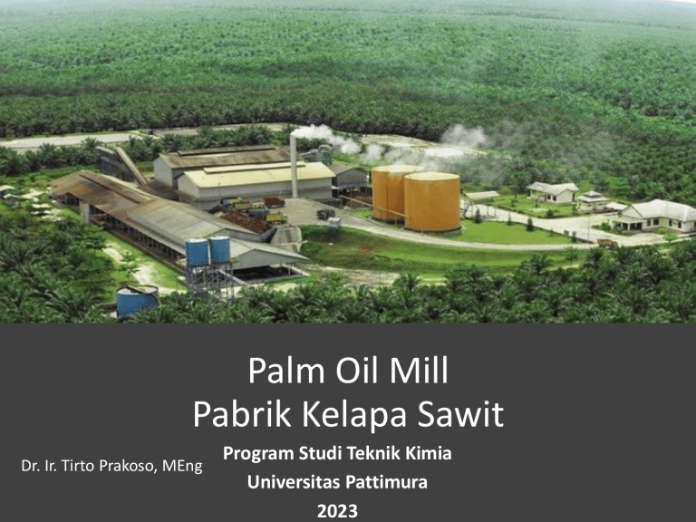 Palm Oil Mill Pabrik Kelapa Sawit Dr. Ir. Tirto Prakoso, MEng Program Studi Teknik Kimia Universitas Pattimura 2023 6 7 Palm Plantation Suasana Pabrik TBS dan Truck TBS dan Lori Lori dan TBS Lori dan Sterilizer Sterilizer Pemasakan Buah dan Pressing Pressing Clarification Palm Oil (before clarification) Tangki storage CPO CPO Transportation Feeder Red Palm Oil Refined Palm Olein LAMPIRAN Kolam POME Fasilitas POME menjadi Biogas