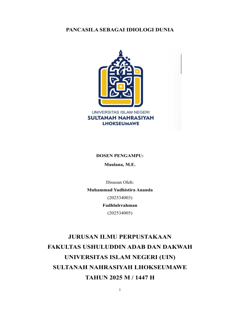 PANCASILA SEBAGAI IDIOLOGI DUNIA DOSEN PENGAMPU: Maulana, M.E. Disusun Oleh: Muhammad Yudhistira Ananda (202534003) Fadhlulrrahman (202534005) JURUSAN ILMU PERPUSTAKAAN FAKULTAS USHULUDDIN ADAB DAN DAKWAH UNIVERSITAS ISLAM NEGERI (UIN) SULTANAH NAHRASIYAH LHOKSEUMAWE TAHUN 2025 M / 1447 H i KATA PENGANTAR Puji dan syukur penulis panjatkan ke hadirat Tuhan Yang Maha Esa, karena atas rahmat dan karunia-Nya, makalah ini dapat diselesaikan dengan baik dan tepat waktu. Makalah ini disusun sebagai salah satu tugas kelompok untuk memenuhi salah satu syarat dalam ”Pendidikan Pancasila”, dengan judul " Pancasila Sebagai Idiologi Dunia". Penulis menyadari bahwa makalah ini masih jauh dari sempurna. Oleh karena itu, penulis sangat mengharapkan saran dan kritik yang membangun dari pembaca demi perbaikan di masa yang akan datang. Ucapan terima kasih penulis sampaikan kepada semua pihak yang telah membantu dalam proses penyusunan makalah ini, terutama kepada bapak Maulana, M.E. serta rekan-rekanyang turut memberikan dukungan dan masukan yang berharga. Semoga makalah ini dapat memberikan manfaat dan wawasan tambahan bagi membaca Makalah ini disusun untuk memenuhi tugas yang telah diberikan kepada kami, yakni oleh bapak Maulana pada mata kuliah Pengantar Ilmu Perpustakaan. Makalah ini diberi judul “Pancasila Sebagai Idiologi Dunia” Semoga makalah ini dapat memberikan manfaat bagi pembaca dalam memahami “Pancasila Sebagai Idiologi Dunia” Lhokseumawe, 15 September 2025 Penulis ii DAFTAR ISI KATA PENGANTAR ......................................................................................................... ii DAFTAR ISI ....................................................................................................................... iii BAB I PENDAHULUAN .................................................................................................. 1 1.1 LATAR BELAKANG................................................................................................ 1 1.2 RUMUS MASALAH ................................................................................................ 1 1.3 TUJUAN PENULISAAN ........................................................................................ 1 BAB II PEMBAHASAAN ................................................................................................ 2 2.1 Pengertian Pancasila Dan Ideologi Dunia.................................................................... 2 2.1.1 Pancasila ............................................................................................................. 2 2.1.2 Ideologi .............................................................................................................. 3 2.1.3. Ideologi di Dunia ............................................................................................... 4 1. Ideologi Liberalis ............................................................................................... 4 2. Ideologi Komunis ............................................................................................... 5 3. Ideologi Pancasila............................................................................................... 5 2.2 Landasan Historis dan Filosofi ..................................................................................... 8 2.3 Relevansi Pancasila dalam Konteks Global .................................................................. 9 2.4 Potensi Pancasila sebagai Alternatif Idiologi Dunia .................................................... 9 2.4.1 Ketahanan Ideologi Pancasila ............................................................................. 10 2.4.2 Implementasi nilai-nilai Pancasila di era globalisasi .......................................... 10 2.5 Pembandingan Ideologi Pancasila Liberalisme dan Komunisme ................................ 11 1) Ideologi Pancasila............................................................................................... 11 2) Ideologi Liberalisme........................................................................................... 11 2.6 Keunggulan Ideologi Pancasila Dibandingkan dengan Ideologi Bangsa Lain ............ 12 BAB III PENUTUP ........................................................................................................... 14 3.1 Kesimpulan .................................................................................................................. 14 DAFTAR PUSTAKA ........................................................................................................ 15 iii BAB I PENDAHULUAN 1.1 Latar Belakang Dunia pada abad ke-21 tengah menyaksikan suatu gelombang krisis ideologi (politik) yang berlangsung begitu masif. Krisis ini mula-mula terjadi di negara-negara yang menjadi episentrum pergulatan ideologi besar dunia, seperti Eropa dan Amerika Serikat. Krisis terus menyebar ke seantero jagat. Kapitalisme, liberalisme, sosialisme dan komunisme sebagai representasi ideologi besar dunia kini mulai disangsikan. Terbukti, ideologi-ideologi tersebut gagal merespons dinamika perkembangan dan kebutuhan umat manusia dewasa ini. Pancasila sebagai produk dari sintesis kreatif para perumusnya akan mampu menjadi solusi di tengah krisis yang melanda ideologi politik dunia hari ini. Tanpa melebih-lebihkan relevansi Pancasila saat ini, “ideologi terbuka” ini selayaknya menjadi penawar terbaik dari berbagai konsep “jalan tengah” mana pun.1 1.2 Rumusan masalah 1. Apa pengertian dan makna Pancasila sebagai ideologi? 2. Bagaimana sejarah dan perkembangan Pancasila sebagai dasar negara dan ideologi bangsa Indonesia? 3. Apa saja nilai-nilai universal yang terkandung dalam Pancasila sehingga berpotensi menjadi ideologi dunia? 1.3 Tujuan Penulisaan 1. Menjelaskan pengertian dan makna Pancasila sebagai ideologi 2. Mengkaji nilai-nilai universal yang terkandung dalam Pancasila yang memungkinkan diterima secara global. 3. Menganalisis relevansi Pancasila dalam menghadapi ta
