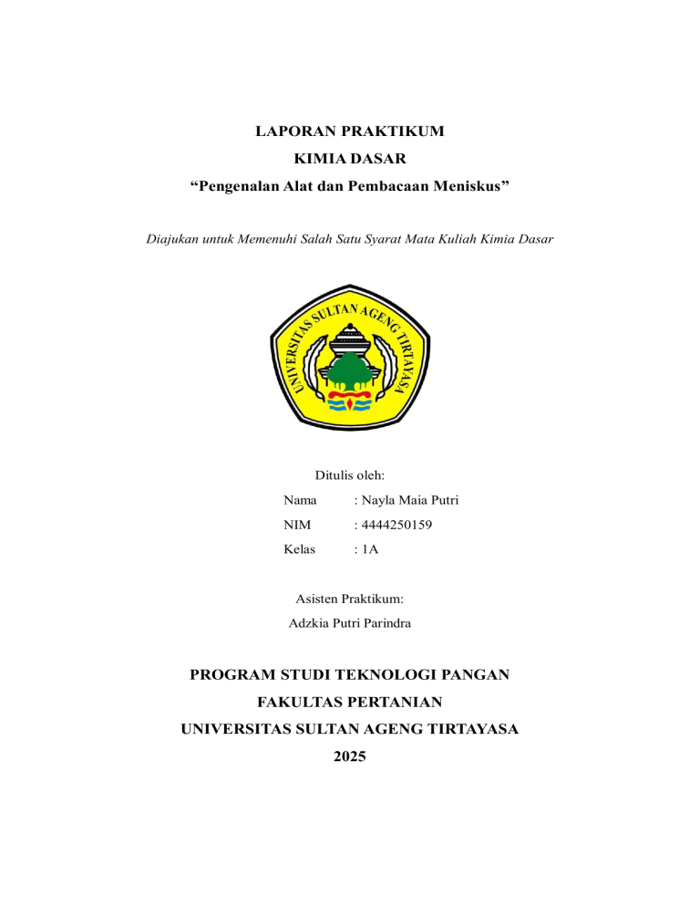 LAPORAN PRAKTIKUM KIMIA DASAR “Pengenalan Alat dan Pembacaan Meniskus” Diajukan untuk Memenuhi Salah Satu Syarat Mata Kuliah Kimia Dasar Ditulis oleh: Nama : Nayla Maia Putri NIM : 4444250159 Kelas : 1A Asisten Praktikum: Adzkia Putri Parindra PROGRAM STUDI TEKNOLOGI PANGAN FAKULTAS PERTANIAN UNIVERSITAS SULTAN AGENG TIRTAYASA 2025 BAB 1 PENDAHULUAN 1.1 Latar Belakang Laboratorium merupakan tempat kegiatan mahasiswa, dosen, peneliti dan sebagainya, melakukan kegiatan percobaan. Percobaan dilakukan dengan berbagai bahan kimia, peralatan penunjang dan instrumentasi khusus yang mampu menyebabkan terjadinya kecelakaan jika tidak tepat dalam prosedur yang digunakan (Budimarwanti, dan SI, 2011) laboratorium adalah tempat yang tertutup dan sterill, bahan-bahan kimia dan alat-alat untuk melakukan praktikum tersedia di laboratorium, orang tidak bisa sembarangan masuk kedalam laboratorium, ada beberapa peraturan yang harus ditaati saat masuk kedalam laboratorium. Alat atau perkakas adalah benda yang yang digunakan untuk mempermudah pekerjaan kita sehari-hari, begitupun peralatan yang tersedia di dalam laboratorium berguna untuk mempermudah pekerjaan yang dilakukan. Penggunaan alat laboratorium tidak hanya asal digunakan tetapi butuh keterampilan, ketelitian, dan kecermatan untuk menggunakan fungsi dari alat-alat laboratorium. Pengaturan alat dan bahan dalam laboratorium juga bertujuan untuk mengurangi resiko bahaya seperti kecelakaan (Ramadhani, 2020) Termasuk pembacaan meniskus, pembacaan meniskus adalah sebuah proses penting dalam pengukuran volume pada alat ukur, seperti buret dan gelas ukur. Meniskus adalah kurva yang terlihat dibagian atas cairan sebagai respons terhadap wadahnya, Meniskus dapat berupa cekung dan cembung, tergantung pada tegangan permukaan cairan dan adhesi ke dinding wadah. Meniskus dapat terjadi karena adanya kohesi-adhesi. Kohesi adalah gaya tarik menarik dua partikel atau lebih dari partikel yang sejenis. Mengakibatkan sebuah zat tidak dapat menempel pada zat lain. Sedangkan Adhesi adalah gaya tarik-menarik dua partikel atau lebih dari partikel yang tidak sejenis. 1.2 Tujuan Adapun tujuan “Pengenalan Alat” sebagai berikut: 1. Mahasiswa diharapkan mampu menyebutkan peralatan yang terdapat di laboratorium, menggambarkan, dan menjelaskan fungsinya masing-masing. 2. Mahasiswa diharapkan mampu menjelaskan perbedaan meniskus atas dan bawah untuk larutan bening dan berwarna. BAB 2 METODE PRAKTIKUM 2.1 Alat dan Bahan Adapun alat yang digunakan pada kegiatan praktikum “Pengenalan Alat” yaitu gelas ukur, beaker glass, pipet ukur, pipet tetes, spatula, labu erlenmeyer, buret, batang pengaduk, klem dan statif, labu ukur, corong, corong pemisah, cawan petri, cawan porselein, cawan alumunium, bunsen, bulb pipet, pompa pipet, botol semprot, tabung reaksi, rak tabung reaksi, ph meter, neraca analitik, hotplate, krustang, desikator, lemari asam, duran, termometer raksa, penjepit, mortar dan alu, mikropipet dan tip, dan pinset. Sedangkan bahan yang digunakan pada kegiatan praktikum “Pengenalan Alat” yaitu KMnO4 0,1% dan Aquades. 2.2 Prosedur Kerja Adapun prosedur kerja pada kegiatan praktikum yang berjudul “Pengenalan Alat” yaitu sebagai berikut: 2.2.1. Prosedur Pengenalan Alat Dipersiapkan alat-alat laboratorium Digambar, diberi nama dan disebutkan fungsi alat-alat tersebut Dijelaskan cara penggunaan neraca analitik, hotplate, dan lemari asam. 2.2.2. Prosedur Pembacaan Meniskus Aquades Dibilas buret dengan aquades Aquades Dimasukkan aquades kedalam buret Dibaca meniskus bawahnya. Dikeluarkan aquades dari dalam buret *** KMnO4 0,1% Dibilas buret dengan aquades KMnO4 0,1% Dimasukkan KMnO4 kedalam buret Dibaca meniskus atasnya Dikeluarkan KMnO4 0,1% dari buret Dibilas buret dengan aquades BAB III HASIL PENGAMATAN DAN PEMBAHASAN 3.1 Hasil Pengamatan 3.2 Pembahasan