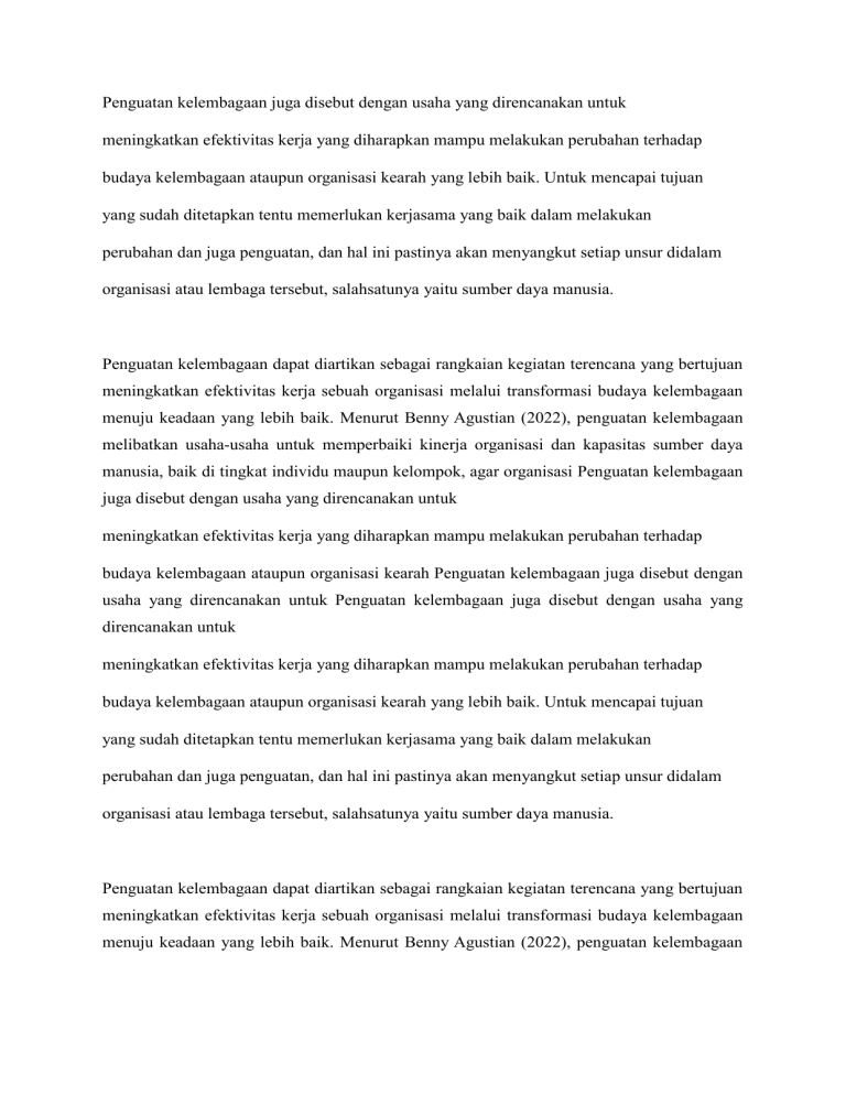 Penguatan kelembagaan juga disebut dengan usaha yang direncanakan untuk meningkatkan efektivitas kerja yang diharapkan mampu melakukan perubahan terhadap budaya kelembagaan ataupun organisasi kearah yang lebih baik. Untuk mencapai tujuan yang sudah ditetapkan tentu memerlukan kerjasama yang baik dalam melakukan perubahan dan juga penguatan, dan hal ini pastinya akan menyangkut setiap unsur didalam organisasi atau lembaga tersebut, salahsatunya yaitu sumber daya manusia. Penguatan kelembagaan dapat diartikan sebagai rangkaian kegiatan terencana yang bertujuan meningkatkan efektivitas kerja sebuah organisasi melalui transformasi budaya kelembagaan menuju keadaan yang lebih baik. Menurut Benny Agustian (2022), penguatan kelembagaan melibatkan usaha-usaha untuk memperbaiki kinerja organisasi dan kapasitas sumber daya manusia, baik di tingkat individu maupun kelompok, agar organisasi Penguatan kelembagaan juga disebut dengan usaha yang direncanakan untuk meningkatkan efektivitas kerja yang diharapkan mampu melakukan perubahan terhadap budaya kelembagaan ataupun organisasi kearah Penguatan kelembagaan juga disebut dengan usaha yang direncanakan untuk Penguatan kelembagaan juga disebut dengan usaha yang direncanakan untuk meningkatkan efektivitas kerja yang diharapkan mampu melakukan perubahan terhadap budaya kelembagaan ataupun organisasi kearah yang lebih baik. Untuk mencapai tujuan yang sudah ditetapkan tentu memerlukan kerjasama yang baik dalam melakukan perubahan dan juga penguatan, dan hal ini pastinya akan menyangkut setiap unsur didalam organisasi atau lembaga tersebut, salahsatunya yaitu sumber daya manusia. Penguatan kelembagaan dapat diartikan sebagai rangkaian kegiatan terencana yang bertujuan meningkatkan efektivitas kerja sebuah organisasi melalui transformasi budaya kelembagaan menuju keadaan yang lebih baik. Menurut Benny Agustian (2022), penguatan kelembagaan melibatkan usaha-usaha untuk memperbaiki kinerja organisasi dan kapasitas sumber daya manusia, baik di tingkat individu maupun kelompok, agar organisasi meningkatkan efektivitas kerja yang diharapkan mampu melakukan perubahan terhadap budaya kelembagaan ataupun organisasi kearah yang lebih baik. Untuk mencapai tujuan yang sudah ditetapkan tentu memerlukan kerjasama yang baik dalam melakukan perubahan dan juga penguatan, dan hal ini pastinya akan menyangkut setiap unsur didalam organisasi atau lembaga tersebut, salahsatunya yaitu sumber daya manusia. Penguatan kelembagaan dapat diartikan sebagai rangkaian kegiatan terencana yang bertujuan meningkatkan efektivitas kerja sebuah organisasi melalui transformasi budaya kelembagaan menuju keadaan yang lebih baik. Menurut Benny Agustian (2022), penguatan kelembagaan melibatkan usaha-usaha untuk memperbaiki kinerja organisasi dan kapasitas sumber daya manusia, baik di tingkat individu maupun kelompok, agar organisasi yang lebih baik. Untuk mencapai tujuan yang sudah ditetapkan tentu memerlukan kerjasama yang baik dalam melakukan perubahan dan juga penguatan, dan hal ini pastinya akan menyangkut setiap unsur didalam organisasi atau lembaga tersebut, salahsatunya yaitu sumber daya manusia. Penguatan kelembagaan dapat diartikan sebagai rangkaian kegiatan terencana yang bertujuan meningkatkan efektivitas kerja sebuah organisasi melalui transformasi budaya kelembagaan menuju keadaan yang lebih baik. Menurut Benny Agustian (2022), penguatan kelembagaan melibatkan usaha-usaha untuk memperbaiki kinerja organisasi dan kapasitas sumber daya manusia, baik di tingkat individu maupun kelompok, agar organisasi dapat bekerja lebih produktif, efisien, dan adaptif. Agustian juga menekankan bahwa proses ini mencakup seluruh komponen organisasi — mulai dari pimpinan, pengurus, hingga anggota — karena perubahan kelembagaan tidak mungkin berhasil tanpa keterlibatan aktif semua unsur tersebut. Salah satu elemen paling krusial dalam upaya ini adalah sumber daya manusia, karena kualitas, komitmen, dan kemampuan SDM yang terlibat akan sangat menentukan apakah lembaga tersebut mampu berkembang secara mandiri dan berkelanjutan.