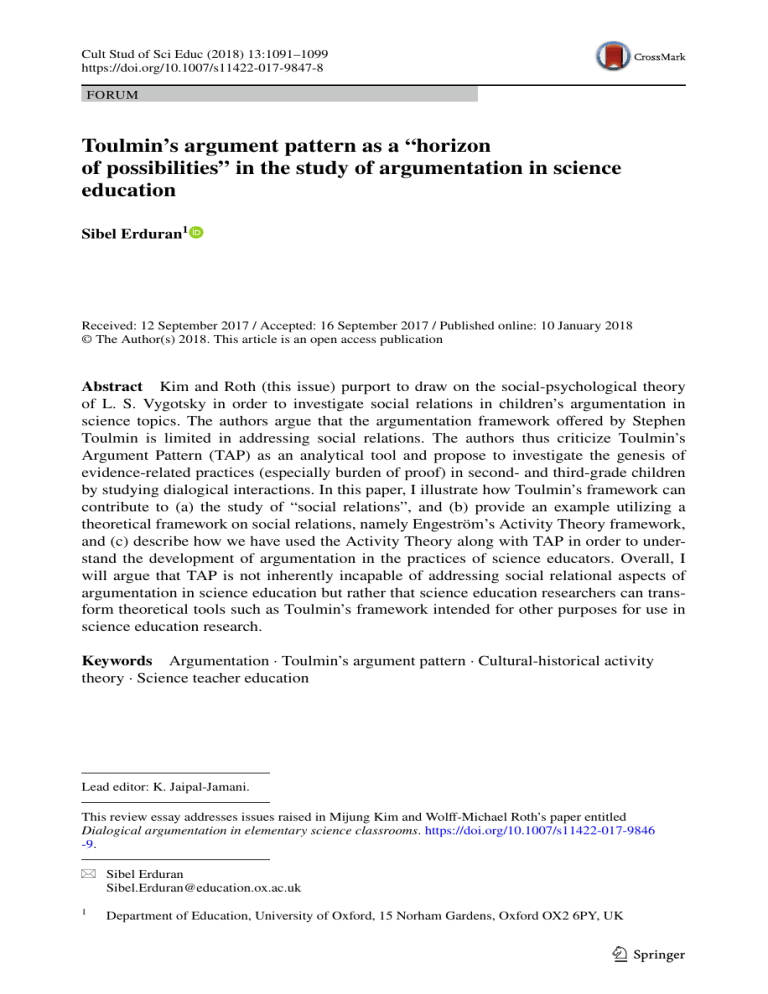 Cult Stud of Sci Educ (2018) 13:1091–1099 https://doi.org/10.1007/s11422-017-9847-8 FORUM Toulmin’s argument pattern as a “horizon of possibilities” in the study of argumentation in science education Sibel Erduran1 Received: 12 September 2017 / Accepted: 16 September 2017 / Published online: 10 January 2018 © The Author(s) 2018. This article is an open access publication Abstract Kim and Roth (this issue) purport to draw on the social-psychological theory of L. S. Vygotsky in order to investigate social relations in children’s argumentation in science topics. The authors argue that the argumentation framework offered by Stephen Toulmin is limited in addressing social relations. The authors thus criticize Toulmin’s Argument Pattern (TAP) as an analytical tool and propose to investigate the genesis of evidence-related practices (especially burden of proof) in second- and third-grade children by studying dialogical interactions. In this paper, I illustrate how Toulmin’s framework can contribute to (a) the study of “social relations”, and (b) provide an example utilizing a theoretical framework on social relations, namely Engeström’s Activity Theory framework, and (c) describe how we have used the Activity Theory along with TAP in order to understand the development of argumentation in the practices of science educators. Overall, I will argue that TAP is not inherently incapable of addressing social relational aspects of argumentation in science education but rather that science education researchers can transform theoretical tools such as Toulmin’s framework intended for other purposes for use in science education research. Keywords Argumentation · Toulmin’s argument pattern · Cultural-historical activity theory · Science teacher education Lead editor: K. Jaipal-Jamani. This review essay addresses issues raised in Mijung Kim and Wolff-Michael Roth’s paper entitled Dialogical argumentation in elementary science classrooms. https://doi.org/10.1007/s11422-017-9846 -9. * Sibel Erduran [email protected] 1 Department of Education, University of Oxford, 15 Norham Gardens, Oxford OX2 6PY, UK 13 1092 S. Erduran Kim and Roth (this issue) claim to draw on the social-psychological theory of L. S. Vygotsky in order to investigate children’s argumentation as social relations. They do so by investigating the genesis of evidence-related practices (especially burden of proof) in second- and third-grade children. The findings show “(a) a capacity of connecting claim and evidence/responding to the burden of proof and critical move varies and (b) that teachers play a significant role to emphasize the importance of evidence but experience the difficulties of removing children’s favored ideas during the turn taking of argumentative dialogue”. The authors argue that the argumentation framework offered by Stephen Toulmin is incapable of addressing social relations. Authors thus criticize Toulmin’s Argument Pattern (TAP) as an analytical tool and propose to investigate the genesis of evidence-related practices (especially burden of proof) in second- and third-grade children by studying dialogical interactions. In this paper, I want to illustrate the affordances that Toulmin’s framework have for the purposes of science education research particularly in the context of social relations surrounding argumentation. I will do so by (a) questioning what is meant by “social relations”, and (b) provide an example utilizing a theoretical framework on social relations, namely Engeström’s Activity Theory framework, and (c) illustrate how we have utilized the TAP framework in relation to an Activity Theory analysis. Overall, I will argue that TAP is not inherently incapable of addressing social relational aspects of argumentation in science education but rather science education researchers can potentially transform theoretical tools intended for other purposes for use in science education. Critique of Toulmin’s argument pattern: is it justified? Many authors including Kim and Roth (this issue) discuss how science education researchers have attempted to understand students’ argumentation skills through various applications of argumentation in conversational and written arguments. Kim and Roth illustrate how many studies on argumentation adapted TAP to develop and analyze students’ understandings of argumentation structures and levels of reasoning (e.g. Erduran, Simon, Osborne 2004). Toulmin (1958) proposed a definition of argument based on the components of claims, grounds, warrants, backing for warrants, rebuttals, and modal qualifiers (Toulmin 1958). In reviewing Toulmin’s framework, Kim and Roth (this issue) provide a series of criticisms to highlight why TAP is not suitable as a framework for their purposes of identifying social relational aspects of argumentation. For example, they cite that TAP (a) is linear and technical when adapted as a sole analytical framework in research (Macagno and Konstantinidou 2013); (b) presented difficulties in the ambiguity of coding schemes (Kelly and Takao 2002); (c) proved to be problematic for analyzing students’ argumentation encountering difficulties in coding between data and warrants and warrants and backings (Erduran, Simon, Osborne 2004); (d) does not sufficiently explain the dynamics of epistemic and social criteria of argumentation (Nussbaum 2011). Simply coding students’ argumentation with TAP schemes makes it a challenge to understand the criteria of claim acceptance or rejection, implicit premises and standpoints, and the dynamics of social interactions and presumption that are often present in argumentative discussions (Nielsen 2013). The authors continue that As a result, analyzing with TAP schemes and any analytical models for high-level writing skills might not sufficiently explain how children learn to evaluate evidence, persuade and are convinced by others, and reach conclusions when their ideas are 13 Toulmin
