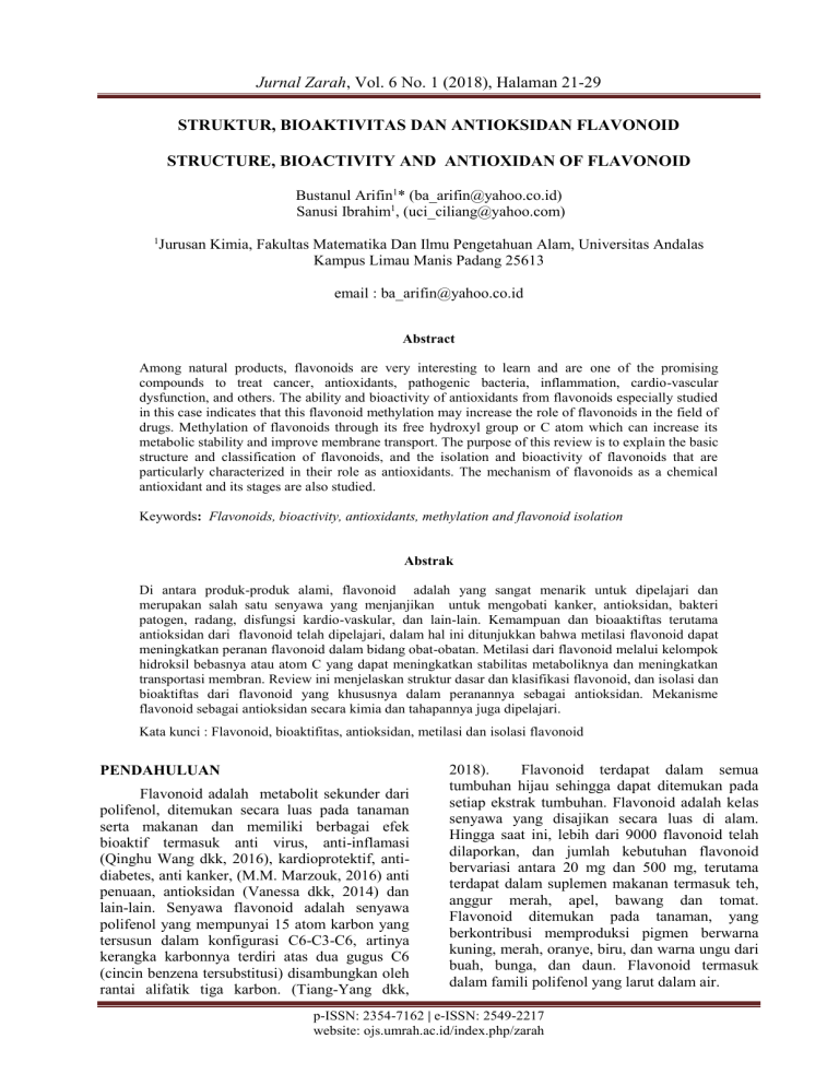 Jurnal Zarah, Vol. 6 No. 1 (2018), Halaman 21-29 STRUKTUR, BIOAKTIVITAS DAN ANTIOKSIDAN FLAVONOID STRUCTURE, BIOACTIVITY AND ANTIOXIDAN OF FLAVONOID Bustanul Arifin1* ([email protected]) Sanusi Ibrahim1, ([email protected]) 1 Jurusan Kimia, Fakultas Matematika Dan Ilmu Pengetahuan Alam, Universitas Andalas Kampus Limau Manis Padang 25613 email : [email protected] Abstract Among natural products, flavonoids are very interesting to learn and are one of the promising compounds to treat cancer, antioxidants, pathogenic bacteria, inflammation, cardio-vascular dysfunction, and others. The ability and bioactivity of antioxidants from flavonoids especially studied in this case indicates that this flavonoid methylation may increase the role of flavonoids in the field of drugs. Methylation of flavonoids through its free hydroxyl group or C atom which can increase its metabolic stability and improve membrane transport. The purpose of this review is to explain the basic structure and classification of flavonoids, and the isolation and bioactivity of flavonoids that are particularly characterized in their role as antioxidants. The mechanism of flavonoids as a chemical antioxidant and its stages are also studied. Keywords: Flavonoids, bioactivity, antioxidants, methylation and flavonoid isolation Abstrak Di antara produk-produk alami, flavonoid adalah yang sangat menarik untuk dipelajari dan merupakan salah satu senyawa yang menjanjikan untuk mengobati kanker, antioksidan, bakteri patogen, radang, disfungsi kardio-vaskular, dan lain-lain. Kemampuan dan bioaaktiftas terutama antioksidan dari flavonoid telah dipelajari, dalam hal ini ditunjukkan bahwa metilasi flavonoid dapat meningkatkan peranan flavonoid dalam bidang obat-obatan. Metilasi dari flavonoid melalui kelompok hidroksil bebasnya atau atom C yang dapat meningkatkan stabilitas metaboliknya dan meningkatkan transportasi membran. Review ini menjelaskan struktur dasar dan klasifikasi flavonoid, dan isolasi dan bioaktiftas dari flavonoid yang khususnya dalam peranannya sebagai antioksidan. Mekanisme flavonoid sebagai antioksidan secara kimia dan tahapannya juga dipelajari. Kata kunci : Flavonoid, bioaktifitas, antioksidan, metilasi dan isolasi flavonoid PENDAHULUAN Flavonoid adalah metabolit sekunder dari polifenol, ditemukan secara luas pada tanaman serta makanan dan memiliki berbagai efek bioaktif termasuk anti virus, anti-inflamasi (Qinghu Wang dkk, 2016), kardioprotektif, antidiabetes, anti kanker, (M.M. Marzouk, 2016) anti penuaan, antioksidan (Vanessa dkk, 2014) dan lain-lain. Senyawa flavonoid adalah senyawa polifenol yang mempunyai 15 atom karbon yang tersusun dalam konfigurasi C6-C3-C6, artinya kerangka karbonnya terdiri atas dua gugus C6 (cincin benzena tersubstitusi) disambungkan oleh rantai alifatik tiga karbon. (Tiang-Yang dkk, 2018). Flavonoid terdapat dalam semua tumbuhan hijau sehingga dapat ditemukan pada setiap ekstrak tumbuhan. Flavonoid adalah kelas senyawa yang disajikan secara luas di alam. Hingga saat ini, lebih dari 9000 flavonoid telah dilaporkan, dan jumlah kebutuhan flavonoid bervariasi antara 20 mg dan 500 mg, terutama terdapat dalam suplemen makanan termasuk teh, anggur merah, apel, bawang dan tomat. Flavonoid ditemukan pada tanaman, yang berkontribusi memproduksi pigmen berwarna kuning, merah, oranye, biru, dan warna ungu dari buah, bunga, dan daun. Flavonoid termasuk dalam famili polifenol yang larut dalam air. p-ISSN: 2354-7162 | e-ISSN: 2549-2217 website: ojs.umrah.ac.id/index.php/zarah 22 | Jurnal Zarah, Vol. 6 No. 1 (2018) Bioaktif flavonoid dianggap sebagai fitokimia terpenting dalam makanan, yang memiliki manfaat biologis bagi manusia secara luas. Cara biotransformasi mikroba untuk menghasilkan flavonoid menjadi perhatian yang besar karena menghasilkan flavonoid baru, yang tidak ada di alam. Reaksi utama selama biotransformasi mikroba adalah hidroksilasi, dehidroksilasi, O-metilasi, O-demethylation, glycosylation, deglycosylation, dehydrogenation, hydrogenation, siklisasi dan reduksi karbonil. Cunninghamella, Penicillium, dan Strain Aspergillus sangat populer untuk biotransformasi flavonoid dan mereka dapat melakukan hampir semua reaksi dengan hasil yang sangat baik. Aspergillus niger adalah salah satu mikroorganisme yang paling banyak digunakan dalam fllavonoid biotransformation; Sebagai contoh, A. niger dapat merubah flavanon ke flanel-4-ol, 2'-hydroxydihydrokalcon, flavon, 3-hydroxy flavon, 6-hydroxy flanonon, dan 4'hydroxy flavonon. Hydroxylation flavon oleh mikroba biasanya terjadi pada posisi orto gugus hidroksil pada cincin A dan posisi C-4 dari cincin B dan mikroba hidroksilasi umum. (Hui Cao dkk, 2015) Flavonoid dalam bentuk glikosilasi atau metilasi pada tanaman, struktur-strukturnya lebih stabil, mudah didapatkan serta mudah dalam bioaktivitasnya. Glikosilasi flavonoid telah didapatkan dengan peralatan biologi, glycosyltransferase, di mana enzim mengkatalisis untuk menempelkan molekul gula ke dalam aglycon yang menghasilkan glikosida. (Gantt dkk, 2011 dan Thuan dkk, 2013) Dengan cara yang sama, metilasi kelompok hidroksil pada flavonoid terjadi adanya methyltransferase yang melekat gugus metil ke aglycone untuk membentuk methoksida. Metilasi dapat terjadi melalui atom oksigen atau karbon untuk membentuk senyawa O-metilisasi atau C-metilisasi. Data eksperimen mengungkapkan bahwa metilasi flavonoid mengakibatkan perubahan dramatis dalam farmakologi dan biokimia sifat senyawa metilasi dibandingkan dengan induknya dengan demikian, ini adalah salah satu cara yang paling efektif untuk mengubah produk alami menjadi penemuan obat. (Cao dkk, 2013 dan Walle dkk 2007). Tujuan dari review ini adalah untuk mempelajari struktur, klasifikasi, isolasi dan identifikasi serta sifat bioaktifitas antioksidan dari flvonoid dengan menampilkan beberapa penelitian dan penemuan terbaru terutama bioakitiftas dari flavonoid. Dalam tinjauan ini, dipelajari juga struktur, bioaktivitas dan juga strategi untuk biosintesis flavonoi