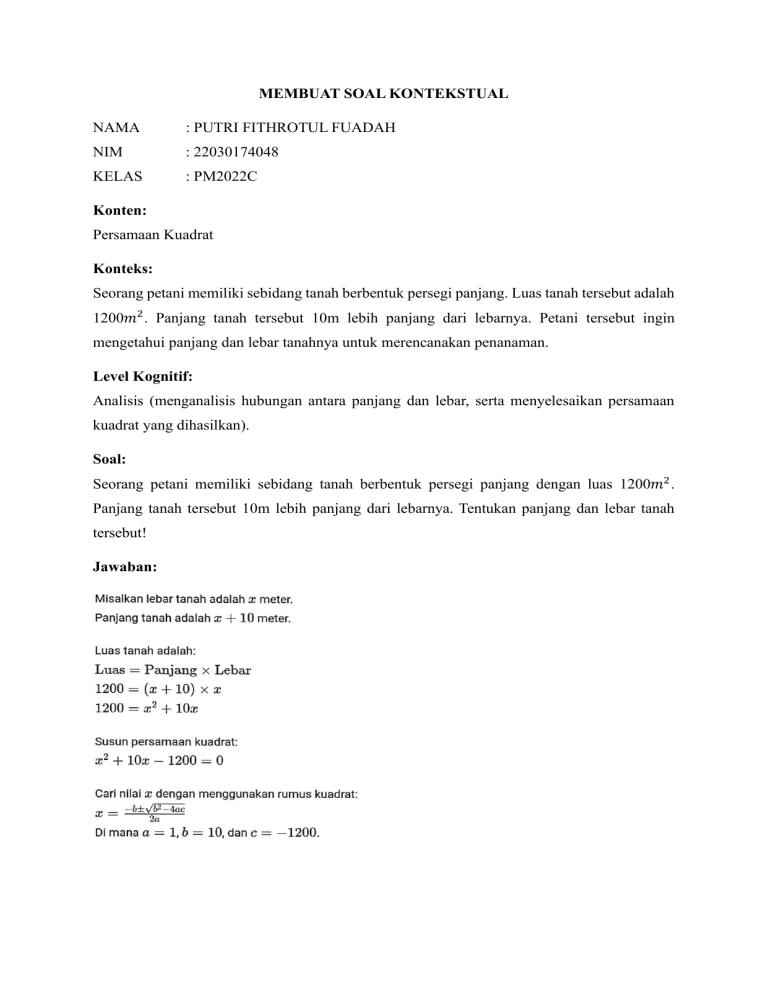 MEMBUAT SOAL KONTEKSTUAL NAMA : PUTRI FITHROTUL FUADAH NIM : 22030174048 KELAS : PM2022C Konten: Persamaan Kuadrat Konteks: Seorang petani memiliki sebidang tanah berbentuk persegi panjang. Luas tanah tersebut adalah 1200𝑚2 . Panjang tanah tersebut 10m lebih panjang dari lebarnya. Petani tersebut ingin mengetahui panjang dan lebar tanahnya untuk merencanakan penanaman. Level Kognitif: Analisis (menganalisis hubungan antara panjang dan lebar, serta menyelesaikan persamaan kuadrat yang dihasilkan). Soal: Seorang petani memiliki sebidang tanah berbentuk persegi panjang dengan luas 1200𝑚2 . Panjang tanah tersebut 10m lebih panjang dari lebarnya. Tentukan panjang dan lebar tanah tersebut! Jawaban: