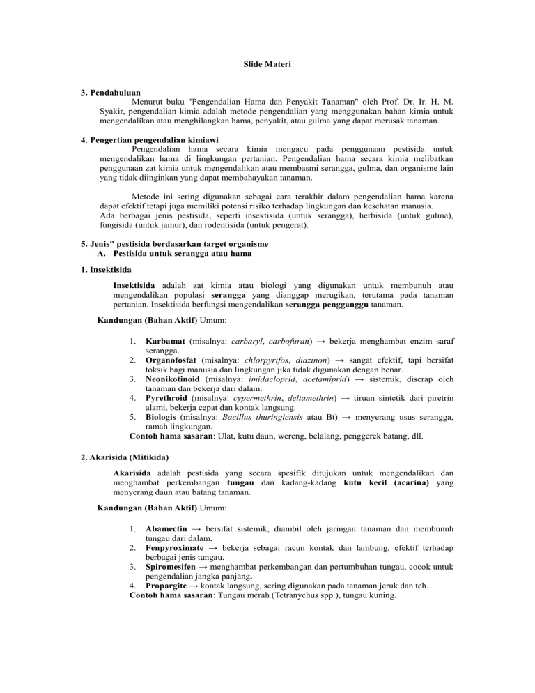 Slide Materi 3. Pendahuluan Menurut buku "Pengendalian Hama dan Penyakit Tanaman" oleh Prof. Dr. Ir. H. M. Syakir, pengendalian kimia adalah metode pengendalian yang menggunakan bahan kimia untuk mengendalikan atau menghilangkan hama, penyakit, atau gulma yang dapat merusak tanaman. 4. Pengertian pengendalian kimiawi Pengendalian hama secara kimia mengacu pada penggunaan pestisida untuk mengendalikan hama di lingkungan pertanian. Pengendalian hama secara kimia melibatkan penggunaan zat kimia untuk mengendalikan atau membasmi serangga, gulma, dan organisme lain yang tidak diinginkan yang dapat membahayakan tanaman. Metode ini sering digunakan sebagai cara terakhir dalam pengendalian hama karena dapat efektif tetapi juga memiliki potensi risiko terhadap lingkungan dan kesehatan manusia. Ada berbagai jenis pestisida, seperti insektisida (untuk serangga), herbisida (untuk gulma), fungisida (untuk jamur), dan rodentisida (untuk pengerat). 5. Jenis" pestisida berdasarkan target organisme A. Pestisida untuk serangga atau hama 1. Insektisida Insektisida adalah zat kimia atau biologi yang digunakan untuk membunuh atau mengendalikan populasi serangga yang dianggap merugikan, terutama pada tanaman pertanian. Insektisida berfungsi mengendalikan serangga pengganggu tanaman. Kandungan (Bahan Aktif) Umum: Karbamat (misalnya: carbaryl, carbofuran) → bekerja menghambat enzim saraf serangga. 2. Organofosfat (misalnya: chlorpyrifos, diazinon) → sangat efektif, tapi bersifat toksik bagi manusia dan lingkungan jika tidak digunakan dengan benar. 3. Neonikotinoid (misalnya: imidacloprid, acetamiprid) → sistemik, diserap oleh tanaman dan bekerja dari dalam. 4. Pyrethroid (misalnya: cypermethrin, deltamethrin) → tiruan sintetik dari piretrin alami, bekerja cepat dan kontak langsung. 5. Biologis (misalnya: Bacillus thuringiensis atau Bt) → menyerang usus serangga, ramah lingkungan. Contoh hama sasaran: Ulat, kutu daun, wereng, belalang, penggerek batang, dll. 1. 2. Akarisida (Mitikida) Akarisida adalah pestisida yang secara spesifik ditujukan untuk mengendalikan dan menghambat perkembangan tungau dan kadang-kadang kutu kecil (acarina) yang menyerang daun atau batang tanaman. Kandungan (Bahan Aktif) Umum: Abamectin → bersifat sistemik, diambil oleh jaringan tanaman dan membunuh tungau dari dalam. 2. Fenpyroximate → bekerja sebagai racun kontak dan lambung, efektif terhadap berbagai jenis tungau. 3. Spiromesifen → menghambat perkembangan dan pertumbuhan tungau, cocok untuk pengendalian jangka panjang. 4. Propargite → kontak langsung, sering digunakan pada tanaman jeruk dan teh. Contoh hama sasaran: Tungau merah (Tetranychus spp.), tungau kuning. 1. 3. Nematisida nematisida adalah bahan kimia yang digunakan untuk membunuh atau menekan aktivitas nematoda parasit, yaitu cacing mikroskopis yang hidup di dalam tanah dan menyerang sistem akar tanaman. Kandungan (Bahan Aktif) Umum: Fosthiazate → nematisida sistemik, diserap oleh akar dan membunuh nematoda di sekitarnya. 2. Oxamyl → racun sistemik, bekerja cepat dan efektif. 3. Carbofuran (juga tergolong karbamat) → sering digunakan sebagai insektisida sekaligus nematisida. 4. Fluopyram → termasuk kelompok fungisida, tapi efektif juga untuk nematoda. Contoh hama sasaran: Nematoda akar (Meloidogyne spp.). 1. 6. Cara kerja pestisida kimia RACUN KONTAK Cara kerja insektisida jenis racun kontak adalah kontak atau bersentuhan langsung, insektisida racun kontak dapat bekerja apabilapengaplikasiannya terkena langsung dengan jasad sasarannya. Insektisida jenis ini sebaiknya diaplikasikan untuk hama yang berada di permukaan tanaman dan tidak efektif untuk hama yang berpindah-pindah dan terbang. RACUN LAMBUNG Racun yang terdapat dalam insektisida racun lambung hanya akan bekerja kalau bagian tanaman yang telah disemprot insektisida termakan oleh hama, dan hama tersebut akan mengalami keracunan. RACUN PERNAFASAN Cara kerja insektisida jenis racun pernafasan ini dapat membunuh serangga jika terhisap melalui organ pernafasannya. Jenis insektisida ini efektif untuk mengendalikan hama yang mobilitas atau perpindahannya tinggi, karena meskipun tidak terkena secara langsung, hama akan tetap mati jika menghirup partikel mikro insektisida yang terbang di udara. RACUN SISTEMIK Cara kerja insektisida dengan mekanisme racun sistemik setelah disemprotkan pada tanaman atau ditaburkan pada tanah maka akan terserap ke dalam jaringan tanaman melalui akar atau daun sehingga dapat membunuh hama yang memakan atau menghisap cairan atau bagian tanaman. Bagian tanaman atau cairan itu berubah menjadi racun lambung bagi serangga, sehingga sangat tepat untuk mengendalikan hama jenis penghisap, ulat dan hama penggerek yang bersembunyi atau berada di dalam batang tanaman. 7. Kelebihan dan kelemahan pestisida kimiawi Kelebihan Pengendalian Secara Kimia Terhadap Hama 1. Efektif dan Cepat: Pengendalian hama secara kimia dapat efektif dan cepat dalam mengendalikan populasi hama. 2. Mudah Digunakan: Pestisida dapat dengan mudah diaplikasikan pada tanaman atau area yang terinfeksi hama. 3. Hasil yang Konsisten: Pengendalian hama secara kimia dapat memberikan hasil yang konsisten dalam mengendalikan populasi hama. Kekurangan Pengendalian Secara Kimia Terhadap Hama 1. Dampak pada Lingkungan: Penggunaan pestisida dapat memiliki dampak negatif pada lingkungan, seperti pencemaran air dan tanah. 2. Dampak pada Kesehatan Manusia: Paparan pestisida dapat memiliki dampak negatif pada kesehatan manusia, seperti keracunan dan gangguan kesehatan lainnya. 3. Resistensi Hama: Penggunaan pestisida yang berlebihan dapat menyebabkan hama menjadi resisten terhadap pestisida. 4. Dampak pada Hewan Lain: Penggunaan pestisida dapat memiliki dampak negatif pada hewan lain, seperti burung dan lebah. 5. Biaya yang Tinggi: Penggunaan pestisida dapat memerlukan biaya yang tinggi, terutama jika digunakan secara terus-menerus. 8. Pestisida nabati sebagai alternatif Pestisida nabati adalah pestisida yang dibuat dari bah