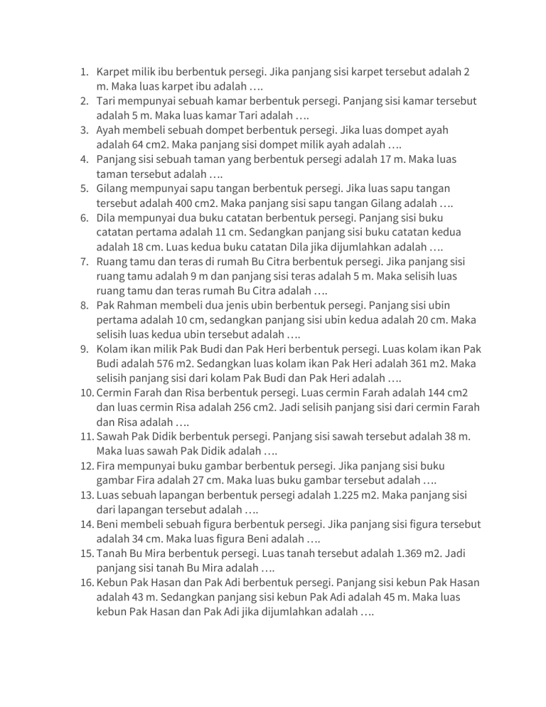 1. Karpet milik ibu berbentuk persegi. Jika panjang sisi karpet tersebut adalah 2 m. Maka luas karpet ibu adalah …. 2. Tari mempunyai sebuah kamar berbentuk persegi. Panjang sisi kamar tersebut adalah 5 m. Maka luas kamar Tari adalah …. 3. Ayah membeli sebuah dompet berbentuk persegi. Jika luas dompet ayah adalah 64 cm2. Maka panjang sisi dompet milik ayah adalah …. 4. Panjang sisi sebuah taman yang berbentuk persegi adalah 17 m. Maka luas taman tersebut adalah …. 5. Gilang mempunyai sapu tangan berbentuk persegi. Jika luas sapu tangan tersebut adalah 400 cm2. Maka panjang sisi sapu tangan Gilang adalah …. 6. Dila mempunyai dua buku catatan berbentuk persegi. Panjang sisi buku catatan pertama adalah 11 cm. Sedangkan panjang sisi buku catatan kedua adalah 18 cm. Luas kedua buku catatan Dila jika dijumlahkan adalah …. 7. Ruang tamu dan teras di rumah Bu Citra berbentuk persegi. Jika panjang sisi ruang tamu adalah 9 m dan panjang sisi teras adalah 5 m. Maka selisih luas ruang tamu dan teras rumah Bu Citra adalah …. 8. Pak Rahman membeli dua jenis ubin berbentuk persegi. Panjang sisi ubin pertama adalah 10 cm, sedangkan panjang sisi ubin kedua adalah 20 cm. Maka selisih luas kedua ubin tersebut adalah …. 9. Kolam ikan milik Pak Budi dan Pak Heri berbentuk persegi. Luas kolam ikan Pak Budi adalah 576 m2. Sedangkan luas kolam ikan Pak Heri adalah 361 m2. Maka selisih panjang sisi dari kolam Pak Budi dan Pak Heri adalah …. 10. Cermin Farah dan Risa berbentuk persegi. Luas cermin Farah adalah 144 cm2 dan luas cermin Risa adalah 256 cm2. Jadi selisih panjang sisi dari cermin Farah dan Risa adalah …. 11. Sawah Pak Didik berbentuk persegi. Panjang sisi sawah tersebut adalah 38 m. Maka luas sawah Pak Didik adalah …. 12. Fira mempunyai buku gambar berbentuk persegi. Jika panjang sisi buku gambar Fira adalah 27 cm. Maka luas buku gambar tersebut adalah …. 13. Luas sebuah lapangan berbentuk persegi adalah 1.225 m2. Maka panjang sisi dari lapangan tersebut adalah …. 14. Beni membeli sebuah figura berbentuk persegi. Jika panjang sisi figura tersebut adalah 34 cm. Maka luas figura Beni adalah …. 15. Tanah Bu Mira berbentuk persegi. Luas tanah tersebut adalah 1.369 m2. Jadi panjang sisi tanah Bu Mira adalah …. 16. Kebun Pak Hasan dan Pak Adi berbentuk persegi. Panjang sisi kebun Pak Hasan adalah 43 m. Sedangkan panjang sisi kebun Pak Adi adalah 45 m. Maka luas kebun Pak Hasan dan Pak Adi jika dijumlahkan adalah …. 17. Ruang perpustakaan dan ruang guru di SD Brilian berbentuk persegi. Panjang sisi ruang perpustakaan adalah 39 m dan panjang sisi ruang guru adalah 31 m. Jadi selisih luas ruang perpustakaan dan ruang guru adalah …. 18. Andi membeli dua kertas berbentuk persegi. Kertas warna merah panjang sisinya 26 cm. Sedangkan kertas warna biru panjang sisinya 36 cm. Maka selisih luas kertas warna merah dan biru adalah …. 19. Ladang Bu Rika dan Bu Sinta berbentuk persegi. Jika luas ladang Bu Rika adalah 1.936 m2 dan luas ladang Bu Sinta adalah 1.024 m2. Maka selisih panjang sisi dari ladang Bu Rika dan Bu Sinta adalah …. 20. Jam dinding dan kalender milik Sofi berbentuk persegi. Luas jam dinding adalah 1.089 cm2 dan luas kalender adalah 2.500 cm2. Jadi selisih panjang sisi jam dinding dan kalender Sofi adalah …. 21. Sandi mempunyai selembar kertas pelangi berbentuk persegi. Panjang sisi kertas pelangi tersebut adalah 62 cm. Maka luas kertas pelangi Sandi adalah …. 22. Lia mempunyai cermin berbentuk persegi. Jika panjang sisi cermin itu adalah 54 cm. Maka luas cermin tersebut adalah …. 23. Kolam ikan milik Pak Harun berbentuk persegi. Jika luas kolam tersebut adalah 5.041 m2. Maka panjang sisi kolam Pak Harun adalah …. 24. Lapangan di Desa Tambakromo berbentuk persegi. Jika panjang sisi lapangan itu adalah 69 m. Maka luas lapangan tersebut adalah …. 25. Bu Tika memiliki sebidang tanah berbentuk persegi. Luas tanah tersebut adalah 3.249 m2. Jadi panjang sisi tanah Bu Tika adalah …. 26. Ardi membeli dua kanvas berbentuk persegi. Panjang sisi kanvas pertama adalah 58 cm. Sedangkan panjang sisi kanvas kedua adalah 73 cm. Maka luas kedua kanvas tersebut jika dijumlahkan adalah …. 27. Sawah Pak Hadi dan Pak Yusuf berbentuk persegi. Jika panjang sisi sawah Pak Hadi adalah 65 m dan panjang sisi sawah Pak Yusuf adalah 72 m. Maka selisih luas sawah Pak Hadi dan Pak Yusuf adalah …. 28. Ulfa mempunyai dua kain berbentuk persegi. Panjang sisi kain warna hijau adalah 74 cm dan panjang sisi kain warna ungu adalah 66 cm. Jadi selisih luas kain warna hijau dan ungu adalah …. 29. Kebun milik Bu Wati dan Bu Ani berbentuk persegi. Luas kebun Bu Wati adalah 3.969 m2. Sedangkan luas kebun Bu Ani adalah 3.025 m2. Maka selisih panjang sisi dari kebun Bu Wati dan Bu Ani adalah …. 30. Lapangan olahraga dan halaman di SD Brilian berbentuk persegi. Jika luas lapangan olahraga adalah 5.184 m2 dan luas halaman adalah 2.916 m2. Maka selisih panjang sisi dari lapangan olahraga dan halaman adalah …. 31. Pak Damar mempunyai sebidang tanah berbentuk persegi. Panjang sisi tanah tersebut adalah 87 m. Jadi luas tanah Pak Damar adalah …. 32. Selembar serbet berbentuk persegi mempunyai panjang sisi 78 cm. Maka luas serbet tersebut adalah …. 33. Juan memiliki sebuah kanvas berbentuk persegi untuk melukis. Jika luas kanvas tersebut adalah 7.056 cm2. Maka panjang sisi kanvas Juan adalah …. 34. Buku gambar milik Nana berbentuk persegi. Panjang sisi buku gambar tersebut adalah 97 cm. Maka luas buku gambar Nana adalah …. 35. Bima mempunyai papan catur berbentuk persegi. Luas papan catur Bima adalah 7.225 cm2. Jadi panjang sisi papan catur tersebut adalah …. 36. Taman bunga dan lapangan di Desa Tambakromo berbentuk persegi. Panjang sisi taman bunga adalah 82 m. Sedangkan panjang sisi lapangan adalah 91 m. Maka luas taman bunga dan lapangan jika dijumlahkan adalah …. 37. Ladang jagung milik Bu Siti dan Bu Yuli berbentuk persegi. Jika panjang sisi ladang jagung Bu Siti adalah 94 m dan p