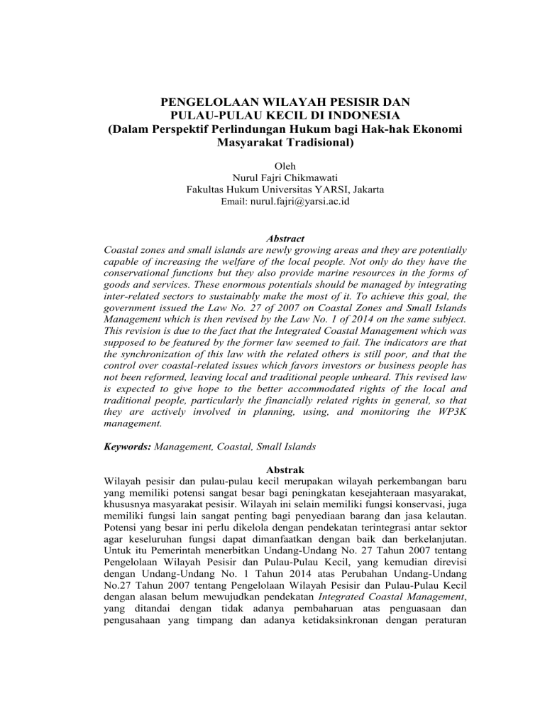 PENGELOLAAN WILAYAH PESISIR DAN PULAU-PULAU KECIL DI INDONESIA (Dalam Perspektif Perlindungan Hukum bagi Hak-hak Ekonomi Masyarakat Tradisional) Oleh Nurul Fajri Chikmawati Fakultas Hukum Universitas YARSI, Jakarta Email: [email protected] Abstract Coastal zones and small islands are newly growing areas and they are potentially capable of increasing the welfare of the local people. Not only do they have the conservational functions but they also provide marine resources in the forms of goods and services. These enormous potentials should be managed by integrating inter-related sectors to sustainably make the most of it. To achieve this goal, the government issued the Law No. 27 of 2007 on Coastal Zones and Small Islands Management which is then revised by the Law No. 1 of 2014 on the same subject. This revision is due to the fact that the Integrated Coastal Management which was supposed to be featured by the former law seemed to fail. The indicators are that the synchronization of this law with the related others is still poor, and that the control over coastal-related issues which favors investors or business people has not been reformed, leaving local and traditional people unheard. This revised law is expected to give hope to the better accommodated rights of the local and traditional people, particularly the financially related rights in general, so that they are actively involved in planning, using, and monitoring the WP3K management. Keywords: Management, Coastal, Small Islands Abstrak Wilayah pesisir dan pulau-pulau kecil merupakan wilayah perkembangan baru yang memiliki potensi sangat besar bagi peningkatan kesejahteraan masyarakat, khususnya masyarakat pesisir. Wilayah ini selain memiliki fungsi konservasi, juga memiliki fungsi lain sangat penting bagi penyediaan barang dan jasa kelautan. Potensi yang besar ini perlu dikelola dengan pendekatan terintegrasi antar sektor agar keseluruhan fungsi dapat dimanfaatkan dengan baik dan berkelanjutan. Untuk itu Pemerintah menerbitkan Undang-Undang No. 27 Tahun 2007 tentang Pengelolaan Wilayah Pesisir dan Pulau-Pulau Kecil, yang kemudian direvisi dengan Undang-Undang No. 1 Tahun 2014 atas Perubahan Undang-Undang No.27 Tahun 2007 tentang Pengelolaan Wilayah Pesisir dan Pulau-Pulau Kecil dengan alasan belum mewujudkan pendekatan Integrated Coastal Management, yang ditandai dengan tidak adanya pembaharuan atas penguasaan dan pengusahaan yang timpang dan adanya ketidaksinkronan dengan peraturan Nurul Fajri Chikmawati, Pengelolaan Wilayah Pesisir Dan …… 397 perundang-undang lainnya. Undang-Undang ini juga dianggap lebih mementingkan aspek investasi dan lebih berpihak kepada dunia usaha sehingga tidak ada ruang bagi masyarakat, khususnya masyarakat nelayan tradisional dan masyarakat adat dalam pengusulan rencana pengelolaan wilayah pesisir dan pulau-pulau kecil. Dengan adanya revisi maka diharapkan hak-hak masyarakat tradisional, khususnya hak-hak ekonomi secara umum diakomodir sejak dalam proses perencanaan, pemanfaatan dan pengawasan serta pengawasan terkait dengan pengelolaan WP3K. Kata kunci: pengelolaan, pesisir, pulau-pulau kecil PENDAHULUAN Kekayaan sumber daya alam dan ekosistemnya ataupun gejala keunikan alam dan atau keindahan alam lainnya yang dimiliki oleh bangsa Indonesia merupakan karunia Tuhan Yang Maha Esa. Potensi sumber daya alam dan ekosistemnya tersebut perlu dikembangkan dan dimanfaatkan bagi sebesarbesarnya kesejahteraan rakyat sehingga tercapai keseimbangan antara perlindungan, pengawetan dan pemanfaatan lestari. Pengelolaan atas sumber daya alam di Indonesia secara konstitusional berpedoman ketentuan Pasal 33 ayat (3) dengan tetap memperhatikan Pasal 28H ayat (1) UUD 1945. Pasal 33 ayat (3) UUD 1945 menetapkan bahwa “Bumi dan air dan kekayaan alam yang terkandung di dalamnya dikuasai oleh Negara dan dipergunakan untuk sebesarbesarnya kemakmuran rakyat” sebagai bentuk pemenuhan atas hak dasar warga Negara sebagaimana diamanatkan dalam Pasal 28H ayat (1) bahwa “Setiap orang berhak hidup sejahtera lahir dan batin, bertempat tinggal, dan mendapatkan lingkungan hidup yang baik dan sehat serta berhak mendapatkan layanan kesehatan”. Dengan demikian dapat dikatakan bahwa pemanfaatan bumi, air dan kekayaan alam yang terkandung didalamnya dilaksanakan secara seimbang tetap memperhatikan prinsip kebersamaan, efisiensi berkeadilan, berkelanjutan, berwawasan lingkungan, kemandirian serta dengan menjaga keseimbangan kemajuan dan kesatuan ekonomi nasional. Undang-Undang Dasar 1945 dewasa ini telah mempertegas perannya, selain merupakan konstitusi politik juga merupakan konstitusi ekonomi. Melalui gagasan demokrasi politik dan ekonomi, 398 ADIL : Jurnal Hukum Vol. 4 No.2 maka seluruh sumberdaya politik dan ekonomi dikuasai oleh rakyat yang berdaulat yang dalam hal-hal tertentu pengurusannya diwakilkan kepada negara1. Sejak kebijakan otonomi daerah diberlakukan, Daerah mulai memperhatikan potensi yang dimilikinya dan yang secara ekonomis dapat dikembangkan untuk meningkatkan kesejahteraan masyarakat. Beberapa daerah di Indonesia yang secara geografis memiliki wilayah pesisir dan pulau-pulau kecil menyadari betapa pentingnya pengelolaan kawasan tersebut untuk berbagai kegiatan baik yang bersifat ekonomis maupun konservasi dengan seimbang dan tepat. Kawasan pesisir dan pulau-pulau kecil memang merupakan wilayah yang memiliki keunikan tersendiri namun rentan terhadap terjadinya konflik kepentingan, ekonomi dan sosial serta berbagai persoalan lingkungan akibat pemanfaatan yang tidak didasarkan pada prinsip ekologis yang merupakan dasar pengelolaan sumberdaya secara berkelanjutan2. Konflik kewenangan di wilayah pesisir dan pulau-pulau kecil dapat muncul ketika terjadi perubahan paradigma dalam pengelolaan sumber daya alam dalam yurisdiksi wilayah pemerintah lokal dalam kerangka desentralisasi kewenangan. Pada sumber daya alam yang sifatnya tidak lintas batas, hal tersebut barangkali tidak akan menimbulkan masalah yang terlalu besar