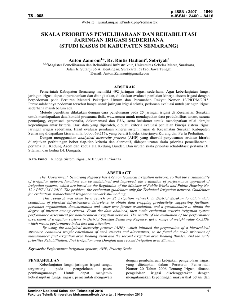 p- ISSN : 2407 – 1846 e-ISSN : 2460 – 8416 TS - 008 Website : jurnal.umj.ac.id/index.php/semnastek SKALA PRIORITAS PEMELIHARAAN DAN REHABILITASI JARINGAN IRIGASI SEDERHANA (STUDI KASUS DI KABUPATEN SEMARANG) 1,2,3 Anton Zamroni1*, Rr. Rintis Hadiani2, Sobriyah3 Magister Pemeliharaan dan Rehabilitasi Infrastruktur, Universitas Sebelas Maret, Surakarta, Jalan Ir. Sutami 36 A, Kentingan, Surakarta, 57126, Jawa Tengah * E-mail: [email protected] ABSTRAK Pemerintah Kabupaten Semarang memiliki 492 jaringan irigasi sederhana. Agar keberlanjutan fungsi jaringan irigasi dapat dipertahankan dan ditingkatkan, dilakukan evaluasi penilaian kinerja sistem irigasi dengan berpedoman pada Perturan Menteri Pekerjaan Umum dan Perumahan Rakyat Nomor 12/PRT/M/2015. Permasalahannya pedoman tersebut hanya untuk jaringan irigasi teknis, pedoman evaluasi untuk jaringan irigasi sederhana masih belum ada. Metode penelitian dilakukan dengan cara penelusuran pada 25 jaringan irigasi di Kecamatan Susukan untuk mendapatkan data kondisi prasarana fisik, wawancara untuk mendapatkan data produktifitas tanam, sarana penunjang, organisasi personalia, dokumentasi dan P3A, serta kuisioner untuk mendapatkan nilai derajat kepentingan antar kriteria. Dari data yang diperoleh, dibuat kriteria evaluasi penilaian kinerja sistem irigasi jaringan irigasi sederhana. Hasil evaluasi penilaian kinerja sistem irigasi di Kecamatan Susukan Kabupaten Semarang didapatkan kisaran nilai bobot 69,21%, yang berarti Indeks kinerjanya Kurang dan Perlu Perhatian. Dengan menggunakan analytical hierarchy process (AHP) yang diawali penyusunan struktur hirarki dilanjutkan perhitungan bobot tiap-tiap kriteria dan alternatif, didapat urutan skala prioritas pemeliharaan : pertama DI. Kedung Asem dan kedua DI. Kedung Bunder. Dan urutan skala prioritas rehabilitasi: pertama DI. Sitaman dan kedua DI. Dungjati. Kata kunci : Kinerja Sistem irigasi, AHP, Skala Prioritas ABSTRACT The Government Semarang Regency has 492 non technical irrigation network. so that the sustainability of irrigation network functions can be maintained and improved, the evaluation of performance appraisal of irrigation systems, which are based on the Regulation of the Minister of Public Works and Public Housing No. 12 / PRT / M / 2015. The problem, the evaluation guidelines only for Technical Irrigation network, Guidelines for evaluation non-technical Irrigation network still nothing. This research was done by a search on 25 irrigation network, in District Susukan to obtain data conditions of physical infrastructure, interviews to obtain data cropping productivity, supporting facilities, personnel organization, documentation and water user farmer association, and a questionnaire to obtain the degree of interest among criteria. From the data obtained, then made evaluation criteria irrigation system performance assessment for non-technical irrigation network. The results of the evaluation of the performance assessment of irrigation systems in District Susukan Semarang Regency, get a range of weight value 69.21%, which means performance index less and Attention. By using the analytical hierarchy process (AHP), which initiated the preparation of a hierarchical structure, continued weight calculation of each criteria and alternatives, so he found the scale priorities of maintenance: first Irrigation area Kedung Asem and the second Irrigation area Kedung Bunder. And the scale priorities Rehabilitation: first Irrigation area Dungjati and second Irrigation area Sitaman. Keywords: Performance Irrigation systems, AHP, Priority Scale PENDAHULUAN Keberlanjutan fungsi jaringan irigasi sangat tergantung pada pengelolaan pasca pembangunannya. Untuk dapat menjamin keberlanjutan fungsi irigasi, pemerintah mengawali dengan pembaharuan kebijakan pengelolaan irigasi yang ditetapkan dalam Peraturan Pemerintah Nomor 20 Tahun 2006 Tentang Irigasi, dimana pengelolaan irigasi diselenggarakan dengan mengutamakan kepentingan masyarakat petani dan Seminar Nasional Sains dan Teknologi 2016 Fakultas Teknik Universitas Muhammadiyah Jakarta , 8 November 2016 1 p- ISSN : 2407 – 1846 e-ISSN : 2460 – 8416 TS - 008 Website : jurnal.umj.ac.id/index.php/semnastek menempatkan perkumpulan petani pemakai air (P3A) sebagai pengambil dan pelaku utama dalam pengelolaan irigasi diwilayahnya. Kabupaten Semarang memiliki 675 Daerah irigasi dengan luas total 32.952 Ha. Secara umum kondisi fisik jaringan irigasinya 25,10% kondisinya baik, 28,24% kondisinya rusak ringan, 31,66% kondisinya rusak sedang dan 15,00% kondisinya rusak berat ( DPU, 2015). Petugas lapangan yang merupakan ujung tombak pelaksana teknis OP irigasi yang terdiri dari Koordinator Wilayah (setingkat kepala UPT), Mantri Irigasi, Petugas Operasi Bendung, Petugas Pintu Air dan pekerja saluran semakin tahun jumlahnya semakin berkurang disebabkan purna tugas dan sampai sekarang belum ada upaya dan payung hukum yang jelas untuk perekrutan petugas/pegawai baru pengganti petugas lapangan yang sudah purna tugas (DPU, 2015). Sumber pendanaan untuk pengelolaan jaringan irigasi selama ini berasal dari Dana Alokasi Khusus (DAK), APBD Kabupaten Semarang, Bantuan Provinsi Jawa Tengah, dan dana hibah Program WISMP (water irrigation system management project). Akan tetapi pendanaannya masih kurang cukup untuk meningkatkan kondisi irigasi agar dapat mencapai kondisi baik lebih dari 70%. Oleh sebab itu dalam rangka mendukung ketahanan pangan nasional dan kedaulatan pangan, Pemerintah Kabupaten Semarang perlu acuan skala prioritas pemeliharaan dan rehabilitasi jaringan irigasi, sehingga kegiatan yang dilaksanakan dapat meningkatkan kinerja sistem irigasi di Kabupaten Semarang walaupun pendanaanya terbatas (DPU, 2015). Dari uraian diatas, maka dapat dirumuskan masalah sebagai berikut : 1. Bagaimanakah kriteria pemantauan dan evaluasi penilaian kinerja sistem irigasi untuk irigasi sederhana di Kabupaten Semarang ? 2. Berapakah range nilai bobot dan indeks kinerja sistem irigasi se