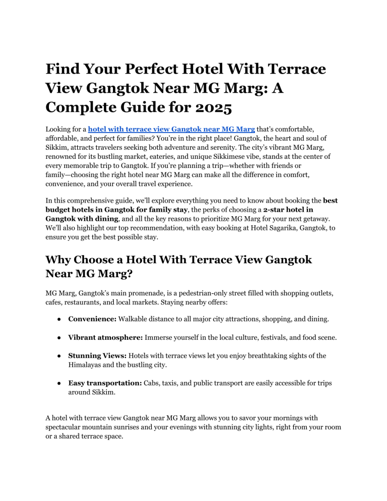 Find Your Perfect Hotel With Terrace View Gangtok Near MG Marg: A Complete Guide for 2025 Looking for a hotel with terrace view Gangtok near MG Marg that’s comfortable, affordable, and perfect for families? You’re in the right place! Gangtok, the heart and soul of Sikkim, attracts travelers seeking both adventure and serenity. The city’s vibrant MG Marg, renowned for its bustling market, eateries, and unique Sikkimese vibe, stands at the center of every memorable trip to Gangtok. If you’re planning a trip—whether with friends or family—choosing the right hotel near MG Marg can make all the difference in comfort, convenience, and your overall travel experience. In this comprehensive guide, we’ll explore everything you need to know about booking the best budget hotels in Gangtok for family stay, the perks of choosing a 2-star hotel in Gangtok with dining, and all the key reasons to prioritize MG Marg for your next getaway. We’ll also highlight our top recommendation, with easy booking at Hotel Sagarika, Gangtok, to ensure you get the best possible stay. Why Choose a Hotel With Terrace View Gangtok Near MG Marg? MG Marg, Gangtok’s main promenade, is a pedestrian-only street filled with shopping outlets, cafes, restaurants, and local markets. Staying nearby offers: ● Convenience: Walkable distance to all major city attractions, shopping, and dining. ● Vibrant atmosphere: Immerse yourself in the local culture, festivals, and food scene. ● Stunning Views: Hotels with terrace views let you enjoy breathtaking sights of the Himalayas and the bustling city. ● Easy transportation: Cabs, taxis, and public transport are easily accessible for trips around Sikkim. A hotel with terrace view Gangtok near MG Marg allows you to savor your mornings with spectacular mountain sunrises and your evenings with stunning city lights, right from your room or a shared terrace space. What Makes MG Marg the Best Place to Stay in Gangtok? MG Marg stands out as the prime location for both first-time visitors and frequent travelers for several reasons: ● Central Location: Proximity to key attractions including the Ropeway, Tsomgo Lake trip points, Enchey Monastery, and local markets. ● Café Culture: Home to some of Gangtok’s best cafes and restaurants serving local delicacies. ● Shopping Hub: Everything from traditional Sikkimese products to fashionable wear, all within walking distance. ● Festive Events: MG Marg hosts several festivals such as the annual Gangtok Food and Culture Festival, ensuring you remain at the heart of all action. Best Budget Hotels in Gangtok for Family Stay Family trips demand safety, comfort, spacious accommodations, and budget-friendly prices. When searching for the best budget hotels in Gangtok for family stay, consider these priorities: ● Family Rooms: Choose hotels that offer interconnected rooms or family suites for extra space and privacy. ● Amenities: Look for on-site dining, Wi-Fi, parking, room service, laundry facilities, and tour assistance. ● Child-Friendly Policies: Some hotels provide extra beds, kid-friendly meals, or special rates for children. ● Cleanliness and Hygiene: Always check reviews and ratings focusing on cleanliness standards, especially for families. Why Choose Hotel Sagarika, Gangtok? Hotel Sagarika stands out among budget options for families. Here’s why it’s a perfect choice for your next holiday: ● Spacious rooms designed for families, with options for extra beds or interconnected suites. ● In-house dining facilities featuring both local and multi-cuisine options. ● A scenic terrace for relaxing and soaking in panoramic views of the valleys and city. ● Prime location just a minute’s walk from MG Marg. ● Attentive staff committed to safety, cleanliness, and hassle-free guest experiences. ● Easy booking with secure payment options available directly on their website. Find a 2-Star Hotel in Gangtok With Dining Staying at a 2-star hotel in Gangtok with dining offers the perfect combination of affordability and essential comforts. Here’s what sets them apart: ● Budget Friendly: Enjoy significant savings on your stay without sacrificing basic facilities. ● Essential Comforts: Clean, comfortable rooms, warm hospitality, and helpful staff. ● On-Site Dining: After a day exploring, relax with a variety of dining options, from local Sikkimese dishes to familiar Indian favorites. ● Terrace Views: Many budget hotels, like Hotel Sagarika, offer terrace spaces to unwind while taking in the mountain scenery. Hotel Sagarika fits the bill with its in-house restaurant, dedicated service, and all the basics you need for a cozy vacation—making it ideal for solo travelers, couples, or families looking for value. Gangtok Hotel Booking Near MG Marg: Why Book Direct? When searching for Gangtok hotel booking near MG Marg, consider booking directly through the hotel’s official website for the following reasons: ● Best Rates: Official hotel websites often provide exclusive discounts and deals. ● Flexible Policies: Enjoy flexible check-in and check-out timing, special family arrangements, and early check-in upon request. ● Authentic Experience: Communicate directly with hotel staff to request local tours, airport pickups, and personalized stays. ● Exclusive Packages: Many hotels, including Hotel Sagarika, offer value-added packages only on their websites. Hotel Sagarika, Gangtok makes online booking easy, secure, and hassle-free, ensuring you get the room of your choice near MG Marg at the best possible rates. Top Features to Expect: Hotel With Terrace View Gangtok Near MG Marg Choosing a hotel with a terrace view near MG Marg guarantees an elevated experience. Not only will you enjoy the beautiful scenery, but you can also utilize the terrace for: ● Morning yoga sessions with views of the Kanchenjunga range. ● Evening tea or coffee, soaking in the lights of the city. ● Picture-perfect photo sessions—