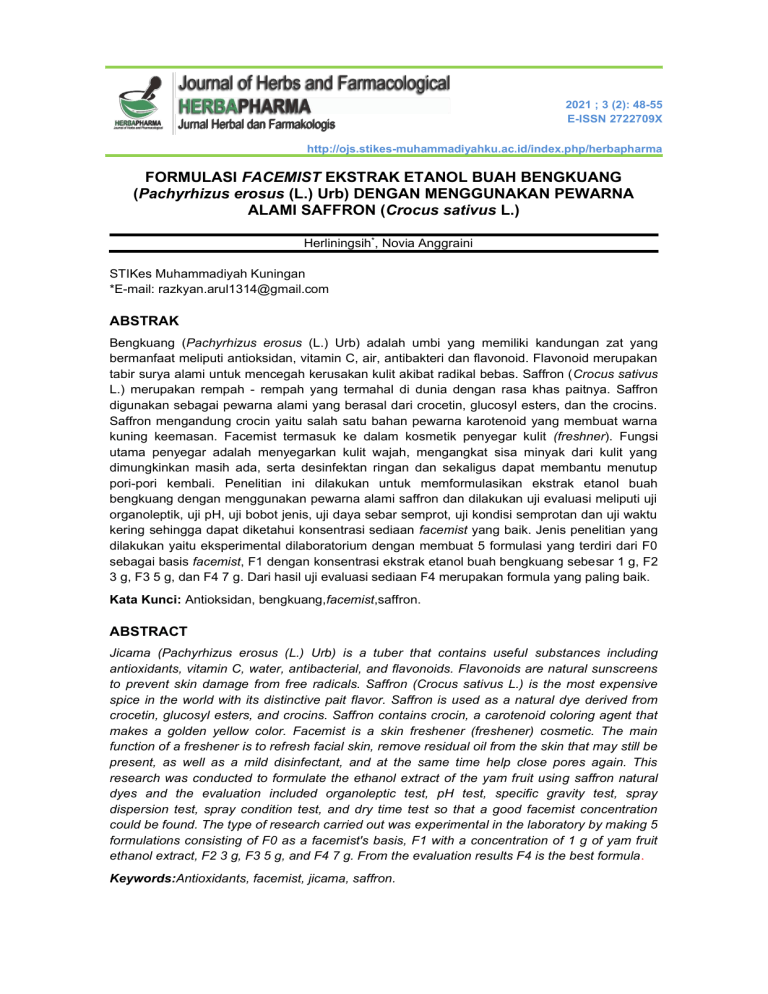 2021 ; 3 (2): 48-55 E-ISSN 2722709X http://ojs.stikes-muhammadiyahku.ac.id/index.php/herbapharma FORMULASI FACEMIST EKSTRAK ETANOL BUAH BENGKUANG (Pachyrhizus erosus (L.) Urb) DENGAN MENGGUNAKAN PEWARNA ALAMI SAFFRON (Crocus sativus L.) Herliningsih*, Novia Anggraini STIKes Muhammadiyah Kuningan *E-mail: [email protected] ABSTRAK Bengkuang (Pachyrhizus erosus (L.) Urb) adalah umbi yang memiliki kandungan zat yang bermanfaat meliputi antioksidan, vitamin C, air, antibakteri dan flavonoid. Flavonoid merupakan tabir surya alami untuk mencegah kerusakan kulit akibat radikal bebas. Saffron (Crocus sativus L.) merupakan rempah - rempah yang termahal di dunia dengan rasa khas paitnya. Saffron digunakan sebagai pewarna alami yang berasal dari crocetin, glucosyl esters, dan the crocins. Saffron mengandung crocin yaitu salah satu bahan pewarna karotenoid yang membuat warna kuning keemasan. Facemist termasuk ke dalam kosmetik penyegar kulit (freshner). Fungsi utama penyegar adalah menyegarkan kulit wajah, mengangkat sisa minyak dari kulit yang dimungkinkan masih ada, serta desinfektan ringan dan sekaligus dapat membantu menutup pori-pori kembali. Penelitian ini dilakukan untuk memformulasikan ekstrak etanol buah bengkuang dengan menggunakan pewarna alami saffron dan dilakukan uji evaluasi meliputi uji organoleptik, uji pH, uji bobot jenis, uji daya sebar semprot, uji kondisi semprotan dan uji waktu kering sehingga dapat diketahui konsentrasi sediaan facemist yang baik. Jenis penelitian yang dilakukan yaitu eksperimental dilaboratorium dengan membuat 5 formulasi yang terdiri dari F0 sebagai basis facemist, F1 dengan konsentrasi ekstrak etanol buah bengkuang sebesar 1 g, F2 3 g, F3 5 g, dan F4 7 g. Dari hasil uji evaluasi sediaan F4 merupakan formula yang paling baik. Kata Kunci: Antioksidan, bengkuang,facemist,saffron. ABSTRACT Jicama (Pachyrhizus erosus (L.) Urb) is a tuber that contains useful substances including antioxidants, vitamin C, water, antibacterial, and flavonoids. Flavonoids are natural sunscreens to prevent skin damage from free radicals. Saffron (Crocus sativus L.) is the most expensive spice in the world with its distinctive pait flavor. Saffron is used as a natural dye derived from crocetin, glucosyl esters, and crocins. Saffron contains crocin, a carotenoid coloring agent that makes a golden yellow color. Facemist is a skin freshener (freshener) cosmetic. The main function of a freshener is to refresh facial skin, remove residual oil from the skin that may still be present, as well as a mild disinfectant, and at the same time help close pores again. This research was conducted to formulate the ethanol extract of the yam fruit using saffron natural dyes and the evaluation included organoleptic test, pH test, specific gravity test, spray dispersion test, spray condition test, and dry time test so that a good facemist concentration could be found. The type of research carried out was experimental in the laboratory by making 5 formulations consisting of F0 as a facemist's basis, F1 with a concentration of 1 g of yam fruit ethanol extract, F2 3 g, F3 5 g, and F4 7 g. From the evaluation results F4 is the best formula. Keywords:Antioxidants, facemist, jicama, saffron. 49 Farmasi 2021;3(2): 48-55 PENDAHULUAN Bengkuang (Pachyrhizus erosus (L.) Urb) adalah umbi yang memiliki kandungan kandungan zat yang bermanfaat. Kandungan zat meliputi antioksidan, vitamin C, air, antibakteri dan flavonoid. Flavonoid merupakan tabir surya alami untuk mencegah kerusakan kulit akibat radikal bebas dan zat fenolik efektif untuk menghambat proses pembentukan melanin (Putra dan Sitiatava, 2012). Dari hasil skrining fitokimia (Apristasari et al., 2018) bengkuang mengandung beberapa senyawa yaitu flavonoid, saponin dan alkaloidSaffron (Crocus Sarivus L.) merupakan rempah - rempah yang termahal di dunia dengan rasa khas pahitnya. Rasa khas pahit dari saffron disebabkan karena zat kimia bernama monoterpene glycoside picrocrocin dan aroma khas saffron karena adanya senyawa volatil aglycone safrana. Saffron digunakan sebagai pewarna alami yang berasal dari crocetin, glucosyl esters, dan the crocins. Saffron mengandung crocin yaitu salah satu bahan pewarna karotenoid yang membuat warna kuning keemasan (Zeka et al., 2015). Senyawa fenolik dan karotenoid yang ada dalam saffron adalah sumber yang paling penting untuk aktivitas antioksidan. Bunga Saffron yang terdiri dari 6 kelopak bunga, 3 benang sari berwarna kuning dan 3 putik bunga. Hal yang membuat bunga saffron mahal terletak pada putik bunga. Dalam bunga saffron putik bunga relatif sedikit untuk menjadi rempah-rempah. Satu kg rempah - rempah saffron membutuhkan sekitar 158.000 300.000 bunga saffron. Saffron mengandung crocetin yang berasal dari hidrolisis crocin. Saffron telah diteliti bisa untuk antioksidan dan saffron telah menyumbang untuk kebutuhan antioksidan yang terus meningkat (Jadouali et al., 2018).Facemist termasuk ke dalam kosmetik penyegar kulit (freshner). Fungsi utama penyegar adalah menyegarkan kulit wajah, mengangkat sisa minyak dari kulit yang dimungkinkan masih ada, serta desinfektan ringan dan sekaligus dapat membantu menutup pori - pori kembali. Penyegar diproduksi sesuai jenis pembersih yang mengacu pada jenis kulit wajah (Apristasari et al.,2018).Dalam penelitian ini dibuat sediaan facemist karena sediaan facemist memiliki kelebihan jika dibandingkan dengan sediaan lainnya. Sediaan facemist mudah digunakan dan dibawa kemana-mana, serta sediaan facemist lebih cepat meresap ke dalam kulit. Hasil penelitian facemist Apristasari (2018) penggunaan ekstrak kubis ungu dan bengkuang menghasilkan warna kuning kecoklatan dengan kadar antioksidan rata-rata sebesar 56%. Oleh karena itu pada penelitian selanjutnya digunakan pewarna alami saffron untuk facemist. Formulasinya diharapkan dapat memberikan warna yang lebih menarik. Selain itu, kandungan fenolik dan flavonoid pada saffron di harapkan dapat menambah efek antioksidan yang dapat ditingkatkan bil