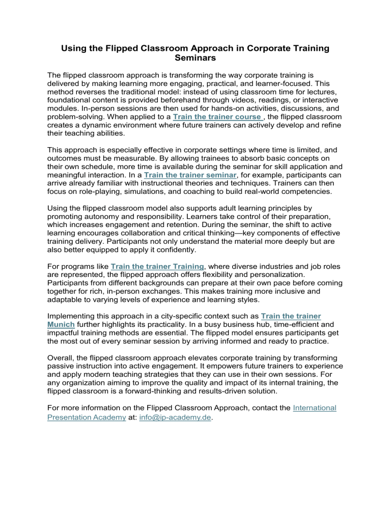 Using the Flipped Classroom Approach in Corporate Training Seminars The flipped classroom approach is transforming the way corporate training is delivered by making learning more engaging, practical, and learner-focused. This method reverses the traditional model: instead of using classroom time for lectures, foundational content is provided beforehand through videos, readings, or interactive modules. In-person sessions are then used for hands-on activities, discussions, and problem-solving. When applied to a Train the trainer course , the flipped classroom creates a dynamic environment where future trainers can actively develop and refine their teaching abilities. This approach is especially effective in corporate settings where time is limited, and outcomes must be measurable. By allowing trainees to absorb basic concepts on their own schedule, more time is available during the seminar for skill application and meaningful interaction. In a Train the trainer seminar, for example, participants can arrive already familiar with instructional theories and techniques. Trainers can then focus on role-playing, simulations, and coaching to build real-world competencies. Using the flipped classroom model also supports adult learning principles by promoting autonomy and responsibility. Learners take control of their preparation, which increases engagement and retention. During the seminar, the shift to active learning encourages collaboration and critical thinking—key components of effective training delivery. Participants not only understand the material more deeply but are also better equipped to apply it confidently. For programs like Train the trainer Training, where diverse industries and job roles are represented, the flipped approach offers flexibility and personalization. Participants from different backgrounds can prepare at their own pace before coming together for rich, in-person exchanges. This makes training more inclusive and adaptable to varying levels of experience and learning styles. Implementing this approach in a city-specific context such as Train the trainer Munich further highlights its practicality. In a busy business hub, time-efficient and impactful training methods are essential. The flipped model ensures participants get the most out of every seminar session by arriving informed and ready to practice. Overall, the flipped classroom approach elevates corporate training by transforming passive instruction into active engagement. It empowers future trainers to experience and apply modern teaching strategies that they can use in their own sessions. For any organization aiming to improve the quality and impact of its internal training, the flipped classroom is a forward-thinking and results-driven solution. For more information on the Flipped Classroom Approach, contact the International Presentation Academy at: [email protected].