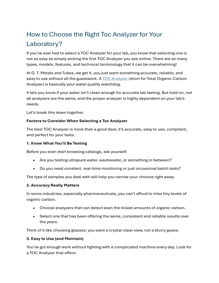 How to Choose the Right Toc Analyzer for Your Laboratory? If you’ve ever had to select a TOC Analyzer for your lab, you know that selecting one is not as easy as simply picking the first TOC Analyzer you see online. There are so many types, models, features, and technical terminology that it can be overwhelming! At G. T. Metals and Tubes, we get it, you just want something accurate, reliable, and easy to use without all the guesswork. A TOC Analyzer (short for Total Organic Carbon Analyzer) is basically your water quality watchdog. It lets you know if your water isn’t clean enough for accurate lab testing. But hold on, not all analyzers are the same, and the proper analyzer is highly dependent on your lab’s needs. Let’s break this down together. Factors to Consider When Selecting a Toc Analyzer The best TOC Analyzer is more than a good deal; it’s accurate, easy to use, compliant, and perfect for your tests. 1. Know What You’ll Be Testing Before you even start browsing catalogs, ask yourself: • Are you testing ultrapure water, wastewater, or something in between? • Do you need constant, real-time monitoring or just occasional batch tests? The type of samples you deal with will help you narrow your choices right away. 2. Accuracy Really Matters In some industries, especially pharmaceuticals, you can’t afford to miss tiny levels of organic carbon. • Choose analyzers that can detect even the tiniest amounts of organic carbon. • Select one that has been offering the same, consistent and reliable results over the years. Think of it like choosing glasses; you want a crystal-clear view, not a blurry guess. 3. Easy to Use (and Maintain) You’ve got enough work without fighting with a complicated machine every day. Look for a TOC Analyzer that offers: • A simple, intuitive interface. • Automated adjustment. • Low maintenance needs. 4. Check for Compliance If your lab is highly regulated, ensure that the analyzer complies with all relevant industry standards. This isn’t just about checking boxes; it’s about not having bad headaches later. 5. Speed and Sample Throughput A quicker analyzer means you get your results in less time. It means more productivity with fewer errors. Why Getting the Right Toc Analyzer is Worth It? TOC Analyzer is not another appliance; the right one is your partner in quality control. Consistent Results: You’ll know you can trust your readings. Cost Savings: Less downtime and fewer repeat tests. Audit Confidence: You’ll breeze through compliance checks. Quick Checklist for Your Decision Before you can press buy, ensure that: • Specify your sample categories and test requirements. • Keep your budget and your features in balance. • Read the reviews of verified customers. • Examine after-sales service. • Select a reliable supplier such as G.T. Metals and Tubes. Final Word Selecting a TOC Analyzer does not have to be traumatic. So long as you can understand your needs, look out to get the proper features, and deal with a reputable supplier, you will come up with an analyzer that will keep your lab running smoothly for years. At G. T. Metals and Tubes, we’ve been helping labs make smart equipment choices for decades, and we know exactly what works in real-world conditions. So take your time, do your homework, and you’ll find the TOC Analyzer that’s perfect for you. For more information and updates, don’t forget to follow us on our LinkedIn Page. FAQs 1. What does a TOC analyzer do? A TOC analyzer finds the level of organic carbon in water to ensure it meets quality standards. 2. What is a TOC analysis? TOC analysis checks water for organic carbon to find out if it’s clean or contaminated. 3. What detector is used in TOC? The TOC analyzers are those that widely utilize the Non-Dispersive Infrared (NDIR) instrument to detect carbon dioxide present in oxidized organic matter. 4. What are the applications of TOC analyzer? TOC analyzers are used in pharmaceuticals, water treatment, research labs, and environmental monitoring for water quality testing.