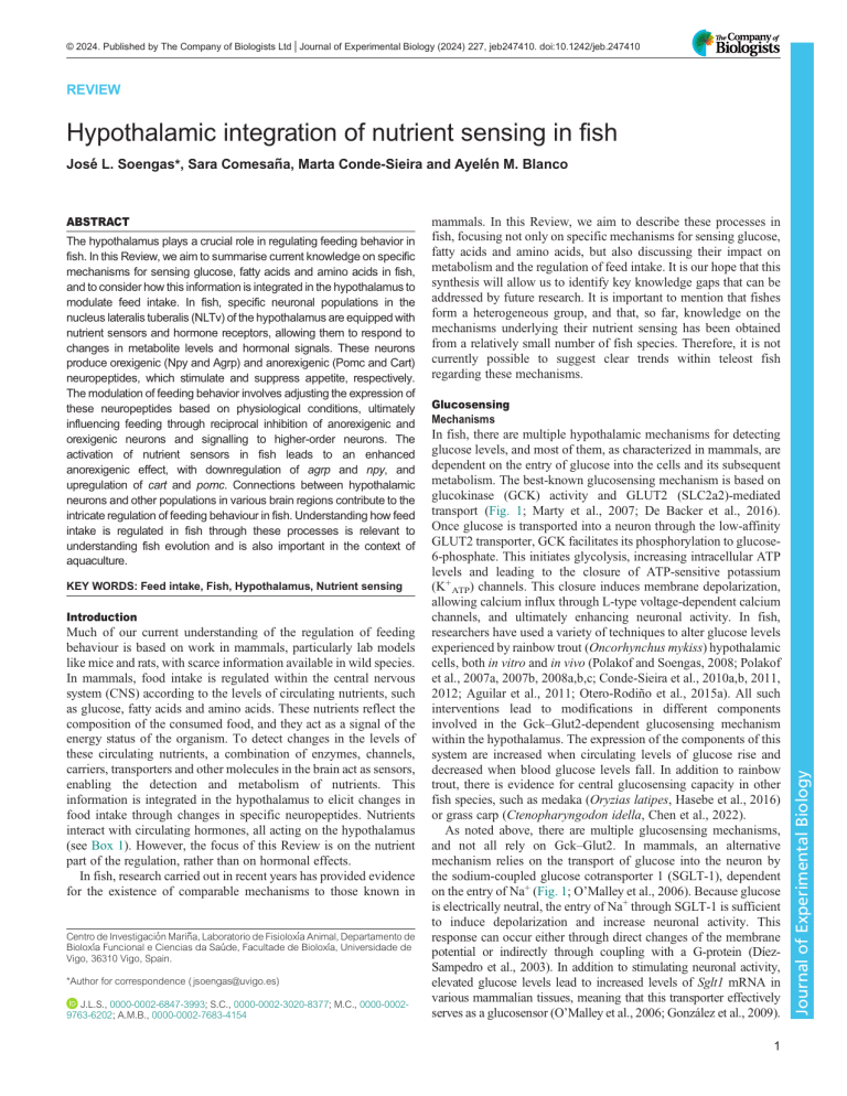 © 2024. Published by The Company of Biologists Ltd | Journal of Experimental Biology (2024) 227, jeb247410. doi:10.1242/jeb.247410 REVIEW Hypothalamic integration of nutrient sensing in fish José L. Soengas*, Sara Comesana, ̃ Marta Conde-Sieira and Ayelé n M. Blanco The hypothalamus plays a crucial role in regulating feeding behavior in fish. In this Review, we aim to summarise current knowledge on specific mechanisms for sensing glucose, fatty acids and amino acids in fish, and to consider how this information is integrated in the hypothalamus to modulate feed intake. In fish, specific neuronal populations in the nucleus lateralis tuberalis (NLTv) of the hypothalamus are equipped with nutrient sensors and hormone receptors, allowing them to respond to changes in metabolite levels and hormonal signals. These neurons produce orexigenic (Npy and Agrp) and anorexigenic (Pomc and Cart) neuropeptides, which stimulate and suppress appetite, respectively. The modulation of feeding behavior involves adjusting the expression of these neuropeptides based on physiological conditions, ultimately influencing feeding through reciprocal inhibition of anorexigenic and orexigenic neurons and signalling to higher-order neurons. The activation of nutrient sensors in fish leads to an enhanced anorexigenic effect, with downregulation of agrp and npy, and upregulation of cart and pomc. Connections between hypothalamic neurons and other populations in various brain regions contribute to the intricate regulation of feeding behaviour in fish. Understanding how feed intake is regulated in fish through these processes is relevant to understanding fish evolution and is also important in the context of aquaculture. KEY WORDS: Feed intake, Fish, Hypothalamus, Nutrient sensing Introduction Much of our current understanding of the regulation of feeding behaviour is based on work in mammals, particularly lab models like mice and rats, with scarce information available in wild species. In mammals, food intake is regulated within the central nervous system (CNS) according to the levels of circulating nutrients, such as glucose, fatty acids and amino acids. These nutrients reflect the composition of the consumed food, and they act as a signal of the energy status of the organism. To detect changes in the levels of these circulating nutrients, a combination of enzymes, channels, carriers, transporters and other molecules in the brain act as sensors, enabling the detection and metabolism of nutrients. This information is integrated in the hypothalamus to elicit changes in food intake through changes in specific neuropeptides. Nutrients interact with circulating hormones, all acting on the hypothalamus (see Box 1). However, the focus of this Review is on the nutrient part of the regulation, rather than on hormonal effects. In fish, research carried out in recent years has provided evidence for the existence of comparable mechanisms to those known in Centro de Investigació n Marina, ̃ Laboratorio de Fisioloxı́a Animal, Departamento de Bioloxı́a Funcional e Ciencias da Saú de, Facultade de Bioloxı́a, Universidade de Vigo, 36310 Vigo, Spain. *Author for correspondence ( [email protected]) J.L.S., 0000-0002-6847-3993; S.C., 0000-0002-3020-8377; M.C., 0000-00029763-6202; A.M.B., 0000-0002-7683-4154 mammals. In this Review, we aim to describe these processes in fish, focusing not only on specific mechanisms for sensing glucose, fatty acids and amino acids, but also discussing their impact on metabolism and the regulation of feed intake. It is our hope that this synthesis will allow us to identify key knowledge gaps that can be addressed by future research. It is important to mention that fishes form a heterogeneous group, and that, so far, knowledge on the mechanisms underlying their nutrient sensing has been obtained from a relatively small number of fish species. Therefore, it is not currently possible to suggest clear trends within teleost fish regarding these mechanisms. Glucosensing Mechanisms In fish, there are multiple hypothalamic mechanisms for detecting glucose levels, and most of them, as characterized in mammals, are dependent on the entry of glucose into the cells and its subsequent metabolism. The best-known glucosensing mechanism is based on glucokinase (GCK) activity and GLUT2 (SLC2a2)-mediated transport (Fig. 1; Marty et al., 2007; De Backer et al., 2016). Once glucose is transported into a neuron through the low-affinity GLUT2 transporter, GCK facilitates its phosphorylation to glucose6-phosphate. This initiates glycolysis, increasing intracellular ATP levels and leading to the closure of ATP-sensitive potassium (K+ ATP) channels. This closure induces membrane depolarization, allowing calcium influx through L-type voltage-dependent calcium channels, and ultimately enhancing neuronal activity. In fish, researchers have used a variety of techniques to alter glucose levels experienced by rainbow trout (Oncorhynchus mykiss) hypothalamic cells, both in vitro and in vivo (Polakof and Soengas, 2008; Polakof et al., 2007a, 2007b, 2008a,b,c; Conde-Sieira et al., 2010a,b, 2011, 2012; Aguilar et al., 2011; Otero-Rodiño et al., 2015a). All such interventions lead to modifications in different components involved in the Gck–Glut2-dependent glucosensing mechanism within the hypothalamus. The expression of the components of this system are increased when circulating levels of glucose rise and decreased when blood glucose levels fall. In addition to rainbow trout, there is evidence for central glucosensing capacity in other fish species, such as medaka (Oryzias latipes, Hasebe et al., 2016) or grass carp (Ctenopharyngodon idella, Chen et al., 2022). As noted above, there are multiple glucosensing mechanisms, and not all rely on Gck–Glut2. In mammals, an alternative mechanism relies on the transport of glucose into the neuron by the sodium-coupled glucose cotransporter 1 (SGLT-1), dependent on the entry of Na+ (F