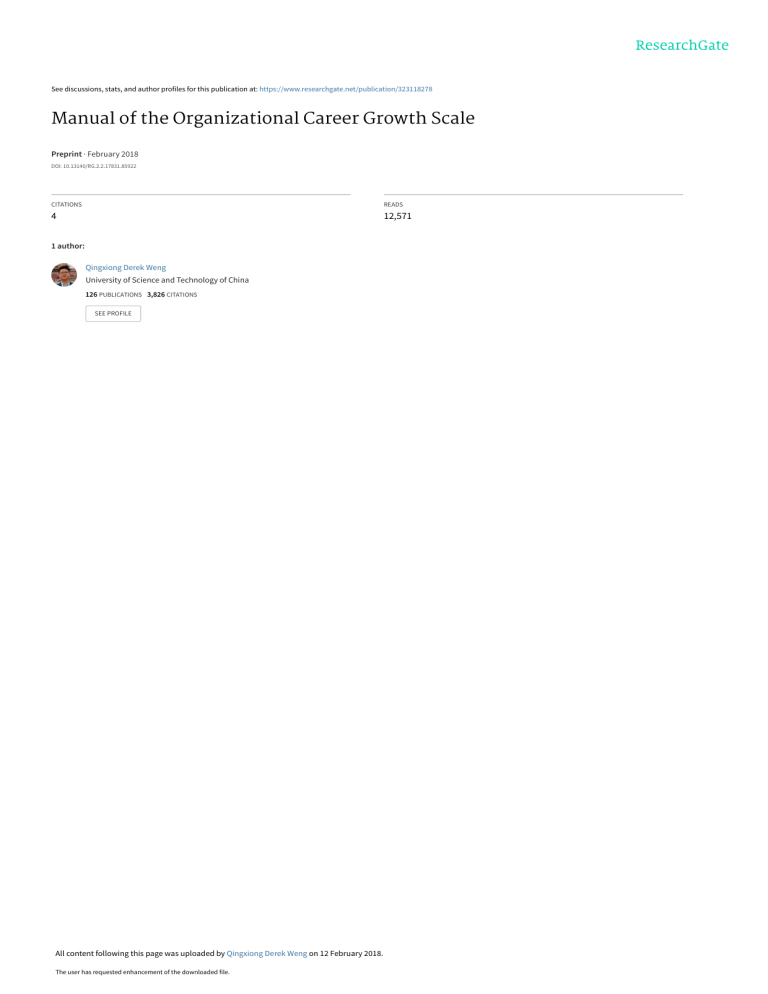 See discussions, stats, and author profiles for this publication at: https://www.researchgate.net/publication/323118278 Manual of the Organizational Career Growth Scale Preprint · February 2018 DOI: 10.13140/RG.2.2.17831.85922 CITATIONS READS 4 12,571 1 author: Qingxiong Derek Weng University of Science and Technology of China 126 PUBLICATIONS 3,826 CITATIONS SEE PROFILE All content following this page was uploaded by Qingxiong Derek Weng on 12 February 2018. The user has requested enhancement of the downloaded file. Manual of the Organizational Career Growth Scale Qingxiong (Derek) Weng University of Science and Technology of China Career development researchers (e.g., see Ng, Eby, Sorensen, & Feldman, 2005; Seibert, Kraimer, & Liden, 2001) have tended to focus on objective and subjective measures of career success over an individual's work life, across organizations. More recently, Weng and McElroy (2012) shifted the focus to organizational career growth, or the degree to which employees experience career growth within their current organization (rather than the assessment of career outcomes across their total work career). This is an important distinction insofar as career development of employees over their total work life is more unpredictable and independent of individual organizational outcomes; while organizational career growth is more regular and more closely associated with individual attitudes and behavior (Weng & Xi, 2010). Research on organizational career growth, therefore, has greater implications and is more relevant to understanding the employee–employer relationship than is career development over an employee's total working career (McElroy & Weng, 2016). Organizational career growth was originally measured using four dimensions: (1) career goal progress, (2) professional ability development, (3) promotion speed, and (4) remuneration growth (Weng, McElroy, Morrow, & Liu, 2010). This multi-dimensional conceptualization implies that career growth is both a function of the employees' efforts and the organization's willingness and ability to reward such efforts. More recently, Weng and McElroy (2012) collapsed these four dimensions to three, because promotion speed and remuneration growth were highly correlated, particularly for employees in managerial positions. Recent studies (e.g., Kim et al., 2016; Spagnoli & Weng, 2017) have showed the cross-cultural validation of this scale. Drawing on social exchange theory, Weng et al. (2010) have argued that employees who perceive having positive career growth tend to reciprocate this to their organization. For example, recent studies have empirically linked career growth to organizational commitment (Weng & McElroy, 2010), turnover intentions (e.g., Chen, Hou, Li, Lovelace, Liu, & Wang, 2015), job satisfaction (Spagnoli, 2017), and employee voice behavior (Wang, Weng, McElroy, Ashkanasy, & Lievens, 2014). Appendix: Scales Career goal progress (1) My present job moves me closer to my career goals. (2) My present job is relevant to my career goals and vocational growth. (3) My present job sets the foundation for the realization of my career goals. (4) My present job provides me with good opportunities to realize my career goals. Professional ability development Email: [email protected] View publication stats (1) My present job encourages me to continuously gain new and job-related skills. (2) My present job encourages me to continuously gain new job-related knowledge. (3) My present job encourages me to accumulate richer work experiences. (4) My present job enables me to continuously improve my professional capabilities. Promotion speed (1) My promotion speed in the present organization is fast. (2) The probability of being promoted in my present organization is high. (3) Compared with previous organizations and attainable jobs, my position in the present one is ideal. (4) Compared with my colleagues, I am being promoted faster. Remuneration growth (1) My salary is growing quickly in my present organization. (2) In this organization, the possibility of my current salary being increased is very large. (3) Compared with my colleagues, my salary has grown more quickly. References Kim, B., Rhee, E., Ha, G., Jung, S. H., Cho, D., Lee, H. K., & Lee, S. M. (2016). Cross-cultural validation of the career growth scale for Korean Employees. Journal of Career Development, 43(1), 26-36. McElroy, J. C., & Weng, Q. (2016). The connections between careers and organizations in the new career era: Questions answered, questions raised. Journal of Career Development, 43(1), 3-10. Ng, T. W., Eby, L. T., Sorensen, K. L., & Feldman, D. C. (2005). Predictors of objective and subjective career success: A meta-analysis. Personnel Psychology, 58, 367-408. Seibert, S. E., Kraimer, M. L., & Liden, R. C. (2001). A social capital theory of career success. Academy of Management Journal, 44, 219-237. Spagnoli, P. (2017). Organizational Socialization Learning, Organizational Career Growth, and Work Outcomes: A Moderated Mediation Model. Journal of Career Development, 0894845317700728. Spagnoli, P., & Weng, Q. (2017). Factorial validity, cross-cultural equivalence, and latent means examination of the organizational career growth scale in Italy and China. The International Journal of Human Resource Management, 1-20. Wang, Q., Weng, Q., McElroy, J. C., Ashkanasy, N. M., & Lievens, F. (2014). Organizational career growth and subsequent voice behavior: The role of affective commitment and gender. Journal of Vocational Behavior, 84, 431–441. Weng, Q. & McElroy, J.C. (2012). Organizational career growth, affective occupational commitment and turnover intentions. Journal of Vocational Behavior, 80, 256-265. Weng, Q., McElroy, J.C., Morrow, P.C. & Liu, R. (2010). The relationship between career growth and organizational commitment. Journal of Vocational Behavior, 77 (3), 391-400. Weng, Q. X., & Xi, Y. M. (2011). Career growth study: Scale development and validity test
