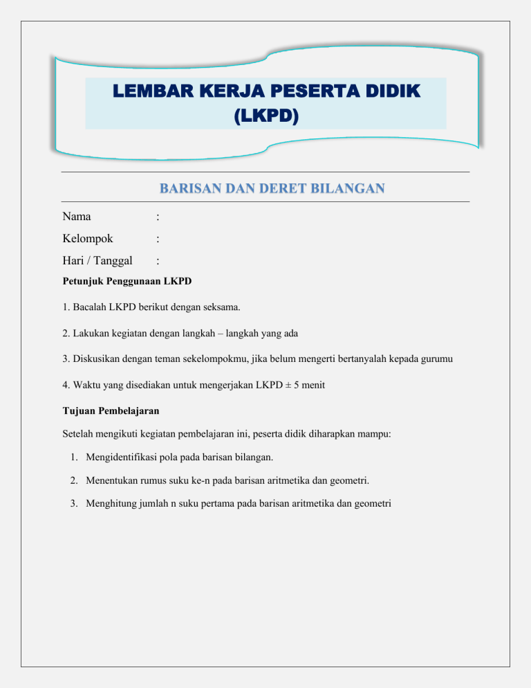 LEMBAR KERJA PESERTA DIDIK (LKPD) BARISAN DAN DERET BILANGAN Nama : Kelompok : Hari / Tanggal : Petunjuk Penggunaan LKPD 1. Bacalah LKPD berikut dengan seksama. 2. Lakukan kegiatan dengan langkah – langkah yang ada 3. Diskusikan dengan teman sekelompokmu, jika belum mengerti bertanyalah kepada gurumu 4. Waktu yang disediakan untuk mengerjakan LKPD ± 5 menit Tujuan Pembelajaran Setelah mengikuti kegiatan pembelajaran ini, peserta didik diharapkan mampu: 1. Mengidentifikasi pola pada barisan bilangan. 2. Menentukan rumus suku ke-n pada barisan aritmetika dan geometri. 3. Menghitung jumlah n suku pertama pada barisan aritmetika dan geometri BARISAN DAN DERET BILANGAN Orientasi Masalah 1 Menemukan Pola Barisan Perhatikan barisan berikut: 7, 11, 15, 19, 23, ... a. Apa pola dari barisan di atas? b. Tentukan rumus suku ke-n (Un) dari barisan tersebut! c. Hitung suku ke-12 dari barisan tersebut! Langkah Penyelesaian Langkah 1 Tuliskan informasi yang diketahui dan ditanyakan pada soal terlebih dahulu. β Informasi yang ditanya: ……………………………………………………………………………………………… ……………………………………………………………………………………………… ……………………………………………………………………………………………… ……………………………………………………………………………………………… β Tentukan pola barisan dari 7,11,15,19,23: ……………………………………………………………………………………………… ……………………………………………………………………………………………… ……………………………………………………………………………………………… ……………………………………………………………………………………………… Langkah 2 Menentukan rumus suku ke-n (πΌπ ) dari barisan diatas dengan rumus πΌπ = π + (π − π) × π. ……………………………………………………………………………………………… ……………………………………………………………………………………………… ……………………………………………………………………………………………… ……………………………………………………………………………………………… Langkah 3 Menyelesaikan dari kedua langkah diatas, kemudian hitung suku ke 12 dari barisan diatas dan rumus yang sudah di dapatkan dari langkah 2. Orientasi Masalah 2 Sebuah bakteri membelah diri menjadi dua setiap 1 jam. Jika awalnya ada 1 bakteri, berapa jumlah bakteri setelah 6 jam? a. Tuliskan barisan jumlah bakteri dari jam ke-1 sampai jam ke-6! b. Tentukan rumus suku ke-n dari barisan tersebut! c. Hitung jumlah seluruh bakteri dari jam ke-1 sampai jam ke-6! Ayo Menyimpulkan Tuliskan apa yang dapat kamu simpulkan dari masalah di atas pada kotak di bawah ini!
