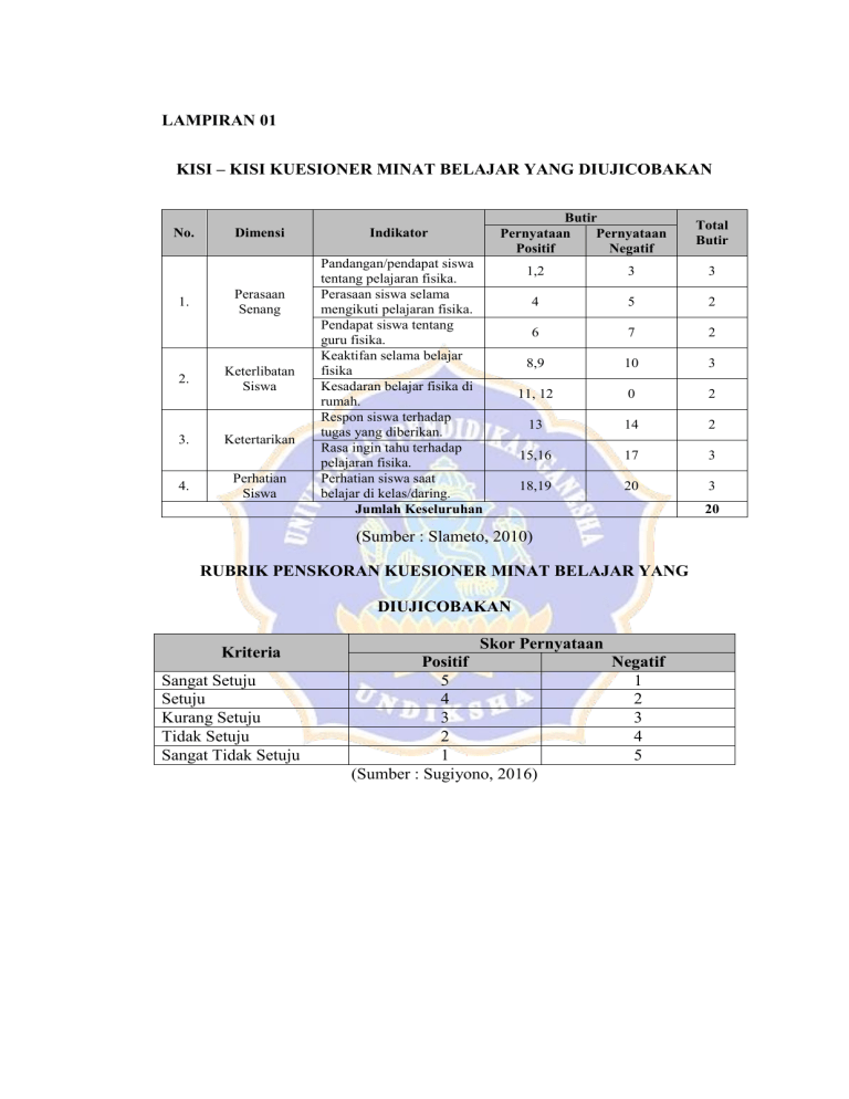 LAMPIRAN 01 KISI – KISI KUESIONER MINAT BELAJAR YANG DIUJICOBAKAN No. 1. 2. 3. 4. Dimensi Perasaan Senang Keterlibatan Siswa Ketertarikan Perhatian Siswa Indikator Butir Pernyataan Pernyataan Positif Negatif Pandangan/pendapat siswa tentang pelajaran fisika. Perasaan siswa selama mengikuti pelajaran fisika. Pendapat siswa tentang guru fisika. Keaktifan selama belajar fisika Kesadaran belajar fisika di rumah. Respon siswa terhadap tugas yang diberikan. Rasa ingin tahu terhadap pelajaran fisika. Perhatian siswa saat belajar di kelas/daring. Jumlah Keseluruhan 1,2 3 3 4 5 2 6 7 2 8,9 10 3 11, 12 0 2 13 14 2 15,16 17 3 18,19 20 3 (Sumber : Slameto, 2010) RUBRIK PENSKORAN KUESIONER MINAT BELAJAR YANG DIUJICOBAKAN Kriteria Sangat Setuju Setuju Kurang Setuju Tidak Setuju Sangat Tidak Setuju Total Butir Skor Pernyataan Positif Negatif 5 1 4 2 3 3 2 4 1 5 (Sumber : Sugiyono, 2016) 20 LAMPIRAN 02 KUESIONER MINAT BELAJAR YANG DIUJICOBAKAN Petunjuk Pengisian Kuesioner : 1. Kuesioner ini berisi pernyataan-pernyataan yang menggambarkan minat belajar siswa dalam hubungannya dengan prestasi belajar fisika. 2. Tuliskan identitas pada tempat yang sudah disediakan. 3. Pilihlah salah satu jawaban yang paling sesuai dengan keadaan anda dengan cara memberi tanda centang (✔) pada salah satu jawaban yang tersedia. Pilihlah jawaban yang sesuai dengan diri anda sendiri. Keterangan SS : Sangat Setuju (pernyataan sesuai dengan keadaan Anda) S : Setuju (pernyataan sesuai keadaan Anda) KS : Kurang Setuju (pernyataan sesuai dengan keadaan Anda) TS : Tidak Setuju (pernyataan sesuai dengan keadaan Anda) STS : Sangat Tidak Setuju (pernyataan sesuai dengan keadaan Anda) No. 1. 2. 3. 4. Nama : ............................................................................................. No Absen : ............................................................................................. Kelas : ............................................................................................. Pernyataan Saya senang belajar fisika karena berkaitan dengan angka dan konsep yang penuh makna. Soal-soal fisika selalu menarik untuk diselesaikan karena berkaitan dengan kehidupan sehari-hari. Fisika adalah mata pelajaran yang rumit karena terdapat banyak rumus. Saya merasa waktu cepat berlalu ketika belajar fisika karena saya sangat menikmatinya. SS Alternatif Jawaban S KS TS STS No. 5. 6. 7. 8. 9. 10. 11. 12. 13. 14. 15. 16. 17. 18. 19. 20. Pernyataan Saya merasa terbebani ketika mendapat tugas fisika Setiap materi fisika yang disampaikan oleh guru, selalu saya pahami dengan baik. Guru mata pelajaran fisika sangatlah galak sehingga saya takut untuk bertanya. Saya selalu memberikan pendapat selama diskusi pelajaran. Saya selalu menjawab soal-soal dengan benar selama diskusi. Saya lebih senang melihat teman berdiskusi dari pada saya ikut berdiskusi. Saya selalu meluangkan waktu membaca kembali materi fisika. Saya mempelajari materi fisika sebelum guru saya membahasnya di kelas. Saya berusaha bertanya kepada guru agar mampu menjawab tugas dengan baik. Saya tidak pernah melakukan latihan soal di rumah karena tidak mengerti cara menyelesaikannya. Saya senang membaca berita/artikel yang berkaitan dengan fisika. Saya selalu membandingkan pernyataan guru dengan referensi/sumber belajar lainnya. Saya tidak terlalu memperdulikan materi pembelajaran yang disampaikan oleh guru karena materi tersebut sulit dipahami. Saya selalu membaca dan mengikuti alur diskusi di grup kelas. Saya selalu membuka file video, gambar, dan soal yang dikirimkan oleh guru dan teman di grup kelas. Saya mencermati grup kelas hanya untuk melakukan absensi. SS Alternatif Jawaban S KS TS STS LAMPIRAN 03 DATA HASIL UJI COBA KUESIONER MINAT BELAJAR NO. RESP . 1 2 3 4 5 6 7 8 9 10 11 12 13 14 15 16 17 18 19 20 21 22 23 24 25 26 27 28 29 30 31 32 33 NOMOR BUTIR 1 2 3 4 5 6 7 8 9 10 11 12 13 14 TOTA L 4 4 4 4 4 3 3 3 2 3 3 4 3 3 3 3 5 4 3 5 4 4 4 3 3 4 4 4 5 5 5 4 5 4 4 4 3 2 3 3 1 2 3 2 3 5 3 3 5 4 5 3 5 3 5 4 4 4 3 4 5 2 5 4 4 3 3 4 3 3 4 3 2 3 2 4 3 4 4 3 3 3 3 4 4 5 4 4 4 4 3 4 4 3 4 4 4 3 4 3 4 2 1 4 3 2 2 2 3 3 4 4 3 3 3 2 3 3 4 4 3 4 3 3 4 4 3 3 5 3 3 4 3 4 3 3 4 3 3 1 1 4 3 4 2 3 4 4 3 4 4 5 4 5 4 5 4 4 5 3 3 4 5 4 4 2 4 3 1 3 3 5 2 3 3 4 3 5 3 5 5 4 5 3 5 3 3 4 5 4 3 4 4 4 3 3 5 4 65 80 58 72 72 62 71 53 47 56 64 65 77 62 65 77 68 88 63 84 68 79 79 74 65 73 78 77 79 80 78 75 81 4 4 3 3 4 3 4 3 2 3 3 4 3 3 3 2 3 4 3 5 4 3 5 3 3 4 4 4 4 5 3 4 4 3 5 1 1 1 2 2 1 2 2 4 2 5 5 2 1 1 5 2 1 2 2 5 2 4 3 1 2 5 3 1 2 4 3 4 4 5 4 3 3 5 3 2 2 3 3 3 2 5 3 5 3 4 3 3 3 4 3 3 4 3 4 4 3 5 4 4 3 4 5 3 3 4 3 3 3 3 3 5 3 5 5 4 5 3 5 3 5 4 2 3 3 3 5 4 5 4 3 4 4 4 3 4 4 3 3 3 2 3 3 4 5 3 3 3 3 3 3 5 4 3 5 3 4 4 4 5 4 3 4 5 5 5 4 1 5 3 2 5 1 4 1 3 1 5 2 1 5 4 5 3 5 3 5 4 5 1 3 4 5 4 5 4 5 5 2 3 2 3 4 3 2 4 1 2 3 4 2 3 4 5 2 4 3 3 4 4 3 3 3 4 4 3 3 3 3 3 5 3 4 2 2 3 4 2 4 1 2 3 3 4 3 4 4 3 3 3 4 3 5 4 3 3 3 4 3 4 3 4 2 4 NO. RESP . 34 35 36 37 38 39 40 41 42 43 44 45 46 47 48 49 50 51 52 53 54 55 56 57 58 59 60 61 62 63 64 65 66 67 68 69 70 71 NOMOR BUTIR 1 2 3 4 5 6 7 8 9 10 11 12 13 14 TOTA L 4 3 4 2 3 3 3 5 5 3 3 4 1 4 3 3 2 3 2 4 3 3 3 2 2 3 4 1 4 3 3 4 3 3 4 4 5 5 5 5 3 4 3 2 3 5 5 5 5 5 1 3 4 4 5 3 5 5 5 5 3 4 5 5 2 3 5 3 3 5 5 4 5 4 4 4 4 4 4 2 4 4 3 5 4 5 3 3 2 3 3 3 4 3 5 4 4 3 1 2 3 3 3 1 3 2 2 3 3 3 4 4 4 5 3 4 3 2 3 4 3 4 3 3 2 3 1 3 3 3 4 2 1 4 4 3 3 2 2 3 3 3 3 2 3 2 3 3 3 3 4 5 4 3 4 2 4 4 4 4 3 5 4 3 1 4 4 4 3 4 4 4 4 4 2 2 3 2 4 3 4 5 2 3 2 3 4 4 5 5 5 3 3 1 4 2 2 3 5 5 3 5 4 3 2 2 3 2 5 3 2 3 1 4 3 3 2 4 3 4 1 3 3 4 3 3 3 1 75 74 72 49 68 71 61 76 76 77 68 74 42 65 58 70 71 56 70 76 73 66 44 56 62 67 68 52 76 70 40 74 63 71 77 72 82 78 4 3 4 2 4 3 4 5 5 3 3 5 2 4 3 3 3 3 4 4 3 4 2 2 3 3 4 3 3 3 2 4 2 3 4 4 5 5 3 2 5 1 2 3 2 1 1 1 2 1 1 2 2 5 4 2 1 1 1 2 1 2 2 2 4 1 2 3 1 5 4 4 5 2 5 5 3 4 4 3 4 2 3 5 4 3 3 3 5 4 2 4 3 3 5 4 4 3 2 4 3 3 3 1 5 5 2 1 3 2 3 4 4 4 5 3 3 4 3 3 3 3 4 3 3 5 1 3 3 3 3 3 3 4 2 2 2 4 3 4 3 3 5 4 2 5 3 4 4 3 4 1 4 4 4 3 3 4 3 4 1 5 5 5 4 4 3 3 3 4 4 4 