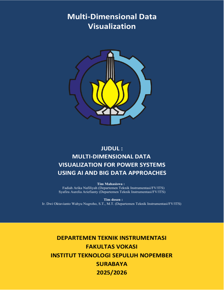 Multi-Dimensional Data Visualization JUDUL : MULTI-DIMENSIONAL DATA VISUALIZATION FOR POWER SYSTEMS USING AI AND BIG DATA APPROACHES Tim Mahasiswa : Fadiah Arika Nafiliyah (Departemen Teknik Instrumentasi/FV/ITS) Syafira Aurelia Ariefianty (Departemen Teknik Instrumentasi/FV/ITS) Tim dosen : Ir. Dwi Oktavianto Wahyu Nugroho, S.T., M.T. (Departemen Teknik Instrumentasi/FV/ITS) DEPARTEMEN TEKNIK INSTRUMENTASI FAKULTAS VOKASI INSTITUT TEKNOLOGI SEPULUH NOPEMBER SURABAYA 2025/2026 BAB I PENDAHULUAN 1.1. Analisa Situasi IDENTIFIKASI PERMASALAHAN No 1 Permasalahan Sistem tenaga listrik modern, khususnya pada smart grid, menghasilkan data multidimensi yang sangat besar, mencakup parameter waktu, lokasi, tegangan, arus, daya, frekuensi, dan status peralatan. Kompleksitas ini menyebabkan metode visualisasi konvensional dua dimensi tidak mampu merepresentasikan hubungan antar variabel secara efektif, sehingga menyulitkan operator dan analis dalam memahami kondisi sistem secara menyeluruh serta mendeteksi pola dan anomali operasional. 2 Visualisasi data tradisional seperti grafik garis atau diagram batang hanya mampu menampilkan sedikit dimensi data secara bersamaan. Pada sistem tenaga listrik yang kompleks, keterbatasan ini menyebabkan informasi penting seperti korelasi antar variabel dan dinamika sistem tidak teridentifikasi dengan baik, sehingga dapat menurunkan situational awareness operator dan meningkatkan risiko kesalahan analisis. 3 Hingga saat ini, belum terdapat standar visualisasi multidimensi yang terintegrasi dan secara khusus dirancang untuk sistem tenaga listrik skala besar. Akibatnya, banyak penelitian dan implementasi menggunakan pendekatan visualisasi yang berbeda-beda, sehingga menyulitkan integrasi sistem, perbandingan hasil analisis, serta penerapan secara operasional di pusat kendali tenaga listrik. Lokasi Sumber (P/M/D) Smart Grid / Power System Modern (Global, 2020–2024) Jurnal Ilmiah / Konferensi Ilmiah Power System & Power IoT Applications (Global, 2019– 2023) Sistem Distribusi dan Transmisi Tenaga Listrik (Global, 2018–2024) Prosiding Konferensi / Jurnal Internasional Jurnal Ilmiah *P : Perangkat Desa, M : Masyarakat, D : Dinas Instansi Vertikal / Stakeholder PRIORITAS PEMILIHAN PERMASALAHAN No 1. Permasalahan Alasan Pemilihan* Permasalahan ini diprioritaskan karena sistem tenaga listrik modern menghasilkan data yang bersifat multidimensi dan kompleks, sehingga visualisasi dua dimensi tidak lagi mampu menyajikan informasi secara komprehensif. Keterbatasan Keterbatasan visualisasi konvensional dalam tersebut dapat menyulitkan merepresentasikan data multidimensi pada sistem tenaga operator dan analis dalam listrik, sehingga menyulitkan analisis kondisi sistem, memahami kondisi sistem, deteksi anomali, dan pengambilan keputusan operasional. mendeteksi pola maupun anomali, serta mendukung pengambilan keputusan operasional secara cepat dan akurat. Dengan demikian, pengembangan visualisasi data multidimensi menjadi penting untuk meningkatkan efektivitas analisis dan keandalan sistem tenaga listrik. *Uraikan secara rinci mengapa permasalahan diprioritaskan penanganannya 1.2. Perumusan Program No 1 Nama Program Tujuan Program Data Power System Multi-Dimensional yang kompleks dapat Data Visualization disajikan secara for PLN Power lebih jelas, sehingga System memudahkan proses analisis, identifikasi pola, serta deteksi anomali pada sistem tenaga listrik. Waktu Jumlah Dana Unsur yang terlibat 2 Bulan Rp. 300.000 Mahasiswa, Industri 1.3. Penelitian sebelumnya Berdasarkan studi [1], penelitian ini membahas penerapan visualisasi data multidimensi pada sistem tenaga listrik dengan memanfaatkan teknik dimensionality reduction untuk menganalisis data kelistrikan berskala besar. Data yang digunakan mencakup parameter tegangan, arus, daya, dan beban yang dikumpulkan dari sistem monitoring jaringan listrik. Metode t-Distributed Stochastic Neighbor Embedding (t-SNE) digunakan untuk memproyeksikan data berdimensi tinggi ke ruang dua dimensi sehingga pola dan keterkaitan antar variabel dapat divisualisasikan secara lebih intuitif. Hasil penelitian menunjukkan bahwa t-SNE mampu mengungkap pola operasional dan indikasi anomali yang sulit diidentifikasi menggunakan visualisasi konvensional. Studi lain juga dilakukan oleh [2] yang berfokus pada penggunaan Uniform Manifold Approximation and Projection (UMAP) sebagai metode reduksi dimensi untuk visualisasi data sistem tenaga. UMAP diterapkan pada data smart grid dengan volume besar dan dimensi tinggi, serta dibandingkan dengan t-SNE dari sisi kecepatan komputasi dan preservasi struktur data. Hasil penelitian menunjukkan bahwa UMAP lebih efisien dalam pemrosesan data berskala besar dan mampu mempertahankan hubungan global antar data, sehingga lebih sesuai untuk aplikasi visualisasi sistem tenaga listrik secara real-time. Serta di sisi lain, terdapat juga penelitian yang dilakukan oleh [3]. mengombinasikan teknik reduksi dimensi dengan metode clustering Hierarchical Density-Based Spatial Clustering of Applications with Noise (HDBSCAN) untuk mengelompokkan kondisi operasional sistem tenaga. Data yang telah direduksi menggunakan UMAP kemudian dikelompokkan untuk mengidentifikasi kondisi normal dan anomali. Hasil penelitian menunjukkan bahwa kombinasi UMAP dan HDBSCAN mampu meningkatkan kejelasan visualisasi klaster serta membantu analis dalam mendeteksi anomali sistem tenaga secara lebih akurat. Penelitian terbaru [4] mengangkat pemanfaatan arsitektur Big Data dan Delta Lake dalam pengelolaan data sistem tenaga listrik. Delta Lake digunakan sebagai storage layer untuk menyimpan data kelistrikan dalam jumlah besar dengan konsistensi dan keandalan tinggi. Integrasi Delta Lake dengan proses analisis dan visualisasi multidimensi memungkinkan pengolahan data historis dan real-time secara efisien, serta mendukung pembuatan dashboard visualisasi untuk analisis sistem tenaga listrik. 1.4. Teori 1.4.1 Visualisasi Data Multidimensi Visualisasi data multidi