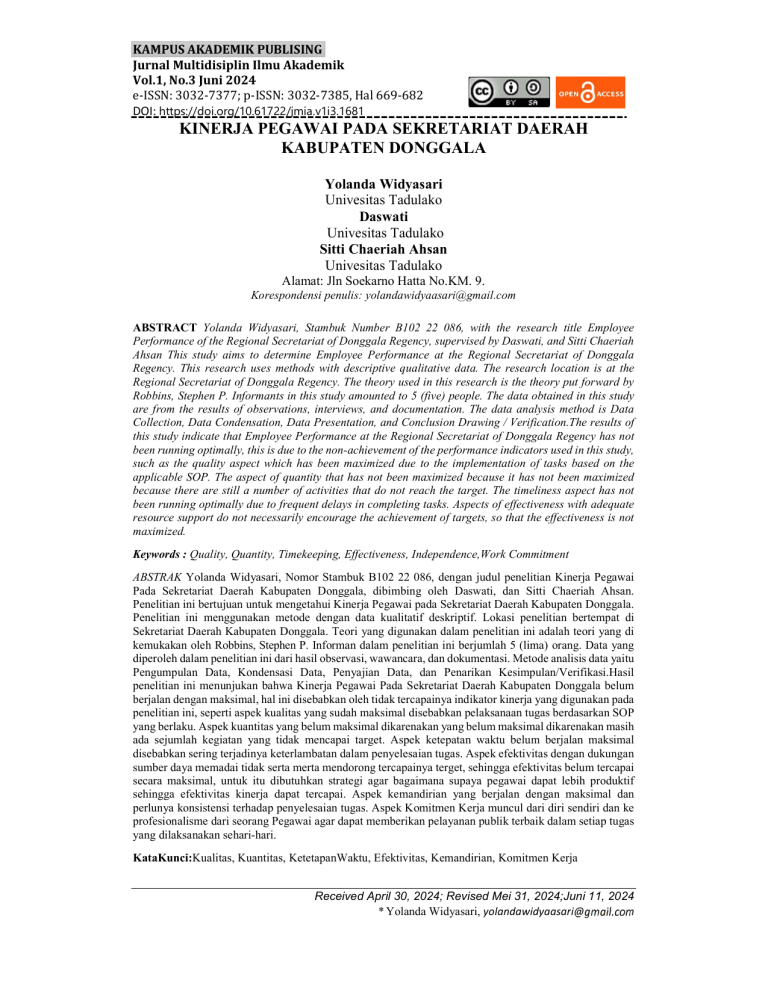 KAMPUS AKADEMIK PUBLISING Jurnal Multidisiplin Ilmu Akademik Vol.1, No.3 Juni 2024 e-ISSN: 3032-7377; p-ISSN: 3032-7385, Hal 669-682 DOI: https://doi.org/10.61722/jmia.v1i3.1681 KINERJA PEGAWAI PADA SEKRETARIAT DAERAH KABUPATEN DONGGALA Yolanda Widyasari Univesitas Tadulako Daswati Univesitas Tadulako Sitti Chaeriah Ahsan Univesitas Tadulako Alamat: Jln Soekarno Hatta No.KM. 9. Korespondensi penulis: [email protected] ABSTRACT Yolanda Widyasari, Stambuk Number B102 22 086, with the research title Employee Performance of the Regional Secretariat of Donggala Regency, supervised by Daswati, and Sitti Chaeriah Ahsan This study aims to determine Employee Performance at the Regional Secretariat of Donggala Regency. This research uses methods with descriptive qualitative data. The research location is at the Regional Secretariat of Donggala Regency. The theory used in this research is the theory put forward by Robbins, Stephen P. Informants in this study amounted to 5 (five) people. The data obtained in this study are from the results of observations, interviews, and documentation. The data analysis method is Data Collection, Data Condensation, Data Presentation, and Conclusion Drawing / Verification.The results of this study indicate that Employee Performance at the Regional Secretariat of Donggala Regency has not been running optimally, this is due to the non-achievement of the performance indicators used in this study, such as the quality aspect which has been maximized due to the implementation of tasks based on the applicable SOP. The aspect of quantity that has not been maximized because it has not been maximized because there are still a number of activities that do not reach the target. The timeliness aspect has not been running optimally due to frequent delays in completing tasks. Aspects of effectiveness with adequate resource support do not necessarily encourage the achievement of targets, so that the effectiveness is not maximized. Keywords : Quality, Quantity, Timekeeping, Effectiveness, Independence,Work Commitment ABSTRAK Yolanda Widyasari, Nomor Stambuk B102 22 086, dengan judul penelitian Kinerja Pegawai Pada Sekretariat Daerah Kabupaten Donggala, dibimbing oleh Daswati, dan Sitti Chaeriah Ahsan. Penelitian ini bertujuan untuk mengetahui Kinerja Pegawai pada Sekretariat Daerah Kabupaten Donggala. Penelitian ini menggunakan metode dengan data kualitatif deskriptif. Lokasi penelitian bertempat di Sekretariat Daerah Kabupaten Donggala. Teori yang digunakan dalam penelitian ini adalah teori yang di kemukakan oleh Robbins, Stephen P. Informan dalam penelitian ini berjumlah 5 (lima) orang. Data yang diperoleh dalam penelitian ini dari hasil observasi, wawancara, dan dokumentasi. Metode analisis data yaitu Pengumpulan Data, Kondensasi Data, Penyajian Data, dan Penarikan Kesimpulan/Verifikasi.Hasil penelitian ini menunjukan bahwa Kinerja Pegawai Pada Sekretariat Daerah Kabupaten Donggala belum berjalan dengan maksimal, hal ini disebabkan oleh tidak tercapainya indikator kinerja yang digunakan pada penelitian ini, seperti aspek kualitas yang sudah maksimal disebabkan pelaksanaan tugas berdasarkan SOP yang berlaku. Aspek kuantitas yang belum maksimal dikarenakan yang belum maksimal dikarenakan masih ada sejumlah kegiatan yang tidak mencapai target. Aspek ketepatan waktu belum berjalan maksimal disebabkan sering terjadinya keterlambatan dalam penyelesaian tugas. Aspek efektivitas dengan dukungan sumber daya memadai tidak serta merta mendorong tercapainya terget, sehingga efektivitas belum tercapai secara maksimal, untuk itu dibutuhkan strategi agar bagaimana supaya pegawai dapat lebih produktif sehingga efektivitas kinerja dapat tercapai. Aspek kemandirian yang berjalan dengan maksimal dan perlunya konsistensi terhadap penyelesaian tugas. Aspek Komitmen Kerja muncul dari diri sendiri dan ke profesionalisme dari seorang Pegawai agar dapat memberikan pelayanan publik terbaik dalam setiap tugas yang dilaksanakan sehari-hari. KataKunci:Kualitas, Kuantitas, KetetapanWaktu, Efektivitas, Kemandirian, Komitmen Kerja Received April 30, 2024; Revised Mei 31, 2024;Juni 11, 2024 * Yolanda Widyasari, [email protected] KINERJA PEGAWAI PADA SEKRETARIAT DAERAH KABUPATEN DONGGALA PENDAHULUAN Terselenggaranya pemerintahan yang baik (Good Governance) merupakan persyaratan bagi setiap pemerintahan untuk mewujudkan kesejahteraan masyarakat yang merupakan tujuan serta cita – cita bangsa. Dalam rangka itu diperlukan pengembangan dan penerapan sistem pertanggungjawaban yang tepat, jelas, terukur dan legitimasi sehingga penyelenggaraan pemerintahan dapat berlangsung secara berdayaguna, berhasil guna, bersih dan bertanggungjawab serta bebas dari korupsi, kolusi dan nepotisme sebagaiamana tertuang dalam Undang – Undang Nomor 23 Tahun 2014 tentang Pemerintahan Daerah, yaitu memberikan kewenangan kepada daerah untuk melakukan pengaturan terhadap daerah masing-masing hal ini selaras dengan Peraturan Pemerintah Nomor 18 Tahun 2016 tentang Perangkat Daerah adalah peraturan yang mengatur tentang pembentukan dan penyusunan perangkat daerah di Indonesia, dimana Peraturan Pemerintah ini dibuat sebagai pedoman bagi pemerintah daerah dalam menyusun organisasi perangkat daerah yang sesuai dengan kebutuhan dan kemampuan daerah serta menghindari tumpang tindih tugas dan fungsi. Peraturan ini bertujuan untuk meningkatkan efisiensi dan efektivitas pemerintahan daerah dalam memberikan pelayanan kepada masyarakat. Definisi kinerja dalam konteks organisasi atau manajemen dapat diartikan sebagai hasil kerja atau prestasi kerja yang dicapai oleh individu atau kelompok dalam suatu organisasi sesuai dengan wewenang dan tanggung jawab masing-masing, guna mencapai tujuan organisasi secara efektif dan efisien. Kinerja mencerminkan seberapa baik individu atau kelompok mampu mencapai tujuan atau target yang telah ditetapkan. Kinerja melibatkan dua aspek utama, yaitu efektivitas (sejauh mana tujuan tercapai) dan efisiensi (seberapa optimal