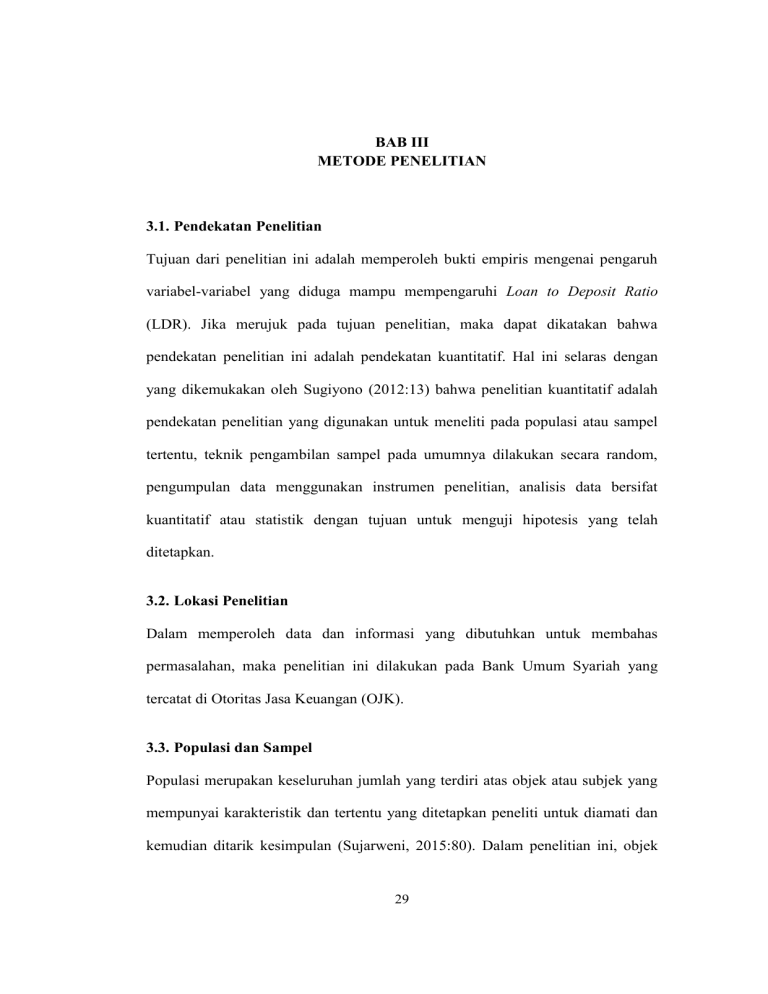 BAB III METODE PENELITIAN 3.1. Pendekatan Penelitian Tujuan dari penelitian ini adalah memperoleh bukti empiris mengenai pengaruh variabel-variabel yang diduga mampu mempengaruhi Loan to Deposit Ratio (LDR). Jika merujuk pada tujuan penelitian, maka dapat dikatakan bahwa pendekatan penelitian ini adalah pendekatan kuantitatif. Hal ini selaras dengan yang dikemukakan oleh Sugiyono (2012:13) bahwa penelitian kuantitatif adalah pendekatan penelitian yang digunakan untuk meneliti pada populasi atau sampel tertentu, teknik pengambilan sampel pada umumnya dilakukan secara random, pengumpulan data menggunakan instrumen penelitian, analisis data bersifat kuantitatif atau statistik dengan tujuan untuk menguji hipotesis yang telah ditetapkan. 3.2. Lokasi Penelitian Dalam memperoleh data dan informasi yang dibutuhkan untuk membahas permasalahan, maka penelitian ini dilakukan pada Bank Umum Syariah yang tercatat di Otoritas Jasa Keuangan (OJK). 3.3. Populasi dan Sampel Populasi merupakan keseluruhan jumlah yang terdiri atas objek atau subjek yang mempunyai karakteristik dan tertentu yang ditetapkan peneliti untuk diamati dan kemudian ditarik kesimpulan (Sujarweni, 2015:80). Dalam penelitian ini, objek 29 30 penelitian yang telah ditentukan adalah bank umum syariah yang telah terdaftar di OJK. Jumlah populasi pada penelitian ini adalah Laporan Keuangan Publikasi Bank Umum Syariah yang tercatat di Otoritas Jasa Keuangan (OJK) periode 2013-2016, dimana tercatat sebanyak 12 Bank Umum Syariah pada periode tersebut. Sebanyak dari 12 Bank Umum Syariah yang tercatat dalam periode diatas hanya ada 8 Bank Umum Syariah yang memiliki laba. Sehingga sebanyak 8 BUS dikalikan periode penelitian sebanyak 4 tahun yang kemudian berjumlah 32 data panel. Tabel 3.1 Sampel Penelitian No 1 2 3 4 5 6 7 8 Nama Bank BNI SYARIAH BANK MEGA SYARIAH BANK MUAMALAT INDONESIA BCA SYARIAH BRI SYARIAH BANK PANIN SYARIAH BANK SYARIAH BUKOPIN BANK TABUNGAN PENSIUNAN SYARIAH Sumber : Otoritas Jasa Keuangan,data diolah. 3.4. Definisi Operasional Variabel Penelitian ini dapat dilaksanakan sesuai dengan yang diharapkan, maka perlu dipahami berbagai unsur-unsur yang menjadi dasar dari suatu penelitian ilmiah yang termuat dalam operasionalisasi variabel penelitian. Secara lebih rinci, operasionalisasi variabel penelitian adalah sebagai berikut : 31 Tabel 3.2 Definisi Operasional Variabel No 1 Variabel Loan To Deposit Ratio (LDR) Konsep Rasio Untuk Mengukur Komposisi Jumlah Kredit Yang Diberikan • Dibandingkan Dengan Jumlah Dana Masyarakat Yang • Berhasil Dihimpun Oleh Bank. (Kasmir, 2014) • 2 Capital Adequacy Ratio (CAR) Rasio kinerja bank yang digunakan untuk mengukur kecukupan modal yang dimiliki bank untuk menunjang aktiva yang mengandung atau menghasilkan risiko, misalnya kredit yang diberikan. (Dendawijaya, 2009). Skala Pengukuran Indikator LDR = Jumlah Kredit Dana Pihak Ketiga Jumlah kredit yang berikandari total DPK yang diperoleh nasabah dan disalurkan kembali ke nasabah lainnya. Data diambil pada Rasio Kinerja Keuangan pada Laporan Keungan pada Bank Umum Syariah Data dalam bentuk persentase. CAR = • • • • x 100% 𝑀𝑜𝑑𝑎𝑙 𝐵𝑎𝑛𝑘 𝐴𝑇𝑀𝑅 Persentase x100% Modal Sendiri Bank Aktiva Tertimbang Menurut Risiko dimana nilai aktiva yang rentan terkena risiko seperti kredit yang diberikan. Data diabil pada Rasio Kinerja Keuangan pada Laporan Keungan Publikasi pada Bank Umum Syariah Data dalam bentuk persentase. Persentase Jumlah Kredit Bermasalah 3 Non Performig Loan (NPL) Perbandingan antara total kredit bermasalah terhadap kredit yang diberikan. (Dendawijaya, 2009) NPL = x 100% Total Kredit • Jumlah kredit macet dibandingkan total kredit. • Data diambil pada Rasio Kinerja Keuangan pada Laporan Keungan Bank Syariah • Data dalam bentuk persentase. ROA = 4 Return On Asset (ROA) Rasio untuk mengukur • kemampuan manajemen bank dalam memperoleh • keuntungan (laba) secara keseluruhan (Dendawijaya, 2009) • Laba Bersih Total Aktiva Persentase x 100% Laba bersih dibandingkan dengan total aktiva yang dimiliki bank. Aktiva produktif yaitu seluruh aset yang dimiliki bank untuk menghasilkan pendapatan seperti kredit. Data diambil pada Rasio Kinerja Keuangan pada Laporan Keungan Bank Umum Syariah Persentase 32 • Data dalam bentuk persentase. Beban Operasional BOPO =Pendapatan Operaional x 100% 5 Biaya Operasional (BOPO) Rasio yang menunjukkan besaran • perbandingan antara beban atau biaya operasional terhadap pendapatan operasional suatu bank pada • periode tertentu. (Dendawijaya, 2009) • Biaya operasional yang digunakan untuk memperoleh pendapatan operasional seperti biaya dana yang harus dibeli atau dikeluarkan bank untuk memperoleh pendapatan. Data diambil pada Rasio Kinerja Keuangan pada Laporan Keungan Bank Umum Syariah Data dalam bentuk persentase. Persentase 3.5. Jenis dan Sumber Data Dalam penelitian ini jenis data yang digunakan adalah data dokumen. Data dokumen merupakan data yang berupa catatan-catatan atau dokumen tertentu. Penelitian ini mengambil data dari laporan keuangan tahunan Bank Umum Syariah Periode 2013-2016. Berdasarkan jenis data yang digunakan, maka sumber data dalam penelitian ini diperoleh dari sumber data sekunder. Data sekunder yaitu sumber data penelitian yang diperoleh secara tidak langsung melalui media perantara, baik yang dipublikasikan dan tidak dipublikasikan. Data sekunder yang digunakan dalam penelitian ini adalah laporan keuangan Bank Umum Syariah pada tahun 2013-2016. Data diperoleh dengan mengakses situs website bank umum syariah terkait. 3.6. Teknik Pengambilan Data Data dalam penelitian ini diambil dengan teknik dokumentasi, yaitu pengumpulan data dilakukan dengan cara mempelajari catatan-catatan atau dokumen-dokumen perusahaan sesuai dengan data yang diperlukan. Pada penelitian ini peneliti 33 terlebih dahulu mengumpulkan laporan keuangan Bank Umum Syariah melalui website publikasi laporan keuangan yang telah disampaikan sebelumnya. Kemudian, penel