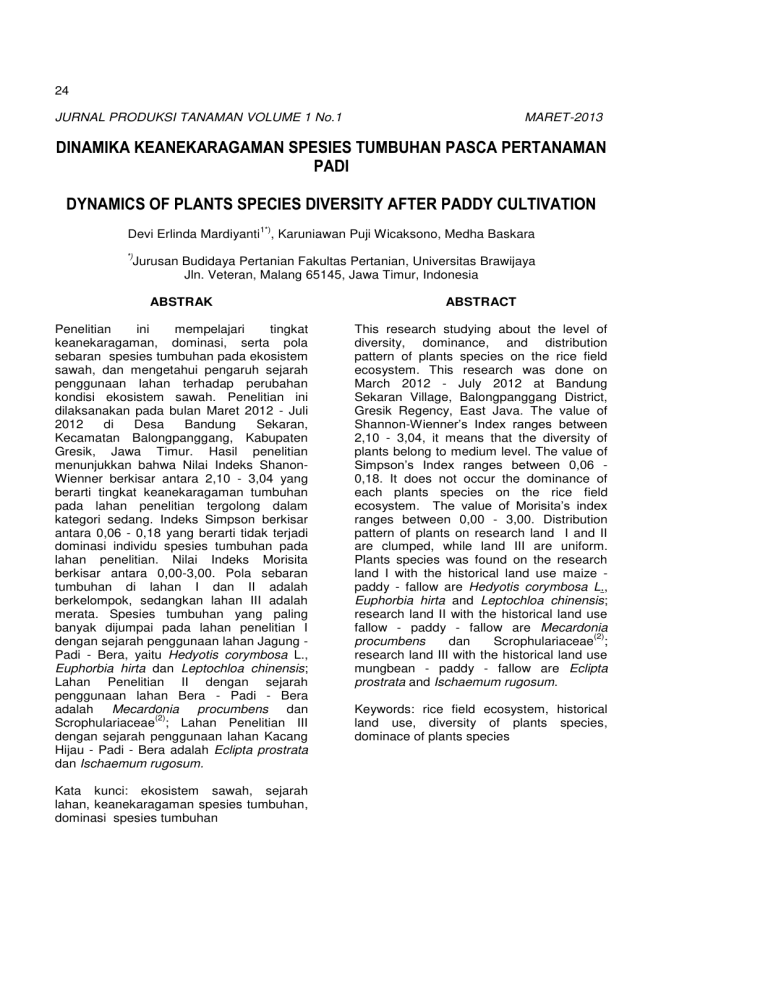 24 JURNAL PRODUKSI TANAMAN VOLUME 1 No.1 MARET-2013 DINAMIKA KEANEKARAGAMAN SPESIES TUMBUHAN PASCA PERTANAMAN PADI DYNAMICS OF PLANTS SPECIES DIVERSITY AFTER PADDY CULTIVATION 1*) Devi Erlinda Mardiyanti , Karuniawan Puji Wicaksono, Medha Baskara *) Jurusan Budidaya Pertanian Fakultas Pertanian, Universitas Brawijaya Jln. Veteran, Malang 65145, Jawa Timur, Indonesia ABSTRAK ABSTRACT Penelitian ini mempelajari tingkat keanekaragaman, dominasi, serta pola sebaran spesies tumbuhan pada ekosistem sawah, dan mengetahui pengaruh sejarah penggunaan lahan terhadap perubahan kondisi ekosistem sawah. Penelitian ini dilaksanakan pada bulan Maret 2012 - Juli 2012 di Desa Bandung Sekaran, Kecamatan Balongpanggang, Kabupaten Gresik, Jawa Timur. Hasil penelitian menunjukkan bahwa Nilai Indeks ShanonWienner berkisar antara 2,10 - 3,04 yang berarti tingkat keanekaragaman tumbuhan pada lahan penelitian tergolong dalam kategori sedang. Indeks Simpson berkisar antara 0,06 - 0,18 yang berarti tidak terjadi dominasi individu spesies tumbuhan pada lahan penelitian. Nilai Indeks Morisita berkisar antara 0,00-3,00. Pola sebaran tumbuhan di lahan I dan II adalah berkelompok, sedangkan lahan III adalah merata. Spesies tumbuhan yang paling banyak dijumpai pada lahan penelitian I dengan sejarah penggunaan lahan Jagung Padi - Bera, yaitu Hedyotis corymbosa L., Euphorbia hirta dan Leptochloa chinensis; Lahan Penelitian II dengan sejarah penggunaan lahan Bera - Padi - Bera adalah Mecardonia procumbens dan (2) Scrophulariaceae ; Lahan Penelitian III dengan sejarah penggunaan lahan Kacang Hijau - Padi - Bera adalah Eclipta prostrata dan Ischaemum rugosum. This research studying about the level of diversity, dominance, and distribution pattern of plants species on the rice field ecosystem. This research was done on March 2012 - July 2012 at Bandung Sekaran Village, Balongpanggang District, Gresik Regency, East Java. The value of Shannon-:LHQQHU¶V ,QGH[ UDQJHV EHWZHHQ 2,10 - 3,04, it means that the diversity of plants belong to medium level. The value of 6LPSVRQ¶V ,QGH[ UDQJHV EHWZHHQ 0,18. It does not occur the dominance of each plants species on the rice field HFRV\VWHP 7KH YDOXH RI 0RULVLWD¶V LQGH[ ranges between 0,00 - 3,00. Distribution pattern of plants on research land I and II are clumped, while land III are uniform. Plants species was found on the research land I with the historical land use maize paddy - fallow are Hedyotis corymbosa L., Euphorbia hirta and Leptochloa chinensis; research land II with the historical land use fallow - paddy - fallow are Mecardonia (2) procumbens dan Scrophulariaceae ; research land III with the historical land use mungbean - paddy - fallow are Eclipta prostrata and Ischaemum rugosum. Kata kunci: ekosistem sawah, sejarah lahan, keanekaragaman spesies tumbuhan, dominasi spesies tumbuhan Keywords: rice field ecosystem, historical land use, diversity of plants species, dominace of plants species 25 Mardiyanti : Dinamika Keanekaragaman Spesies Tumbuhan.......................................................... PENDAHULUAN BAHAN DAN METODE PENELITIAN Makhluk hidup dari berbagai jenis yang hidup secara alami di suatu tempat membentuk kumpulan yang di dalamnya setiap individu menemukan lingkungan yang dapat memenuhi kebutuhan hidupnya. Kelompok yang hidup secara bersama telah menyesuaikan diri dan menghuni suatu tempat alami disebut komunitas. Karakteristik komunitas pada suatu lingkungan adalah keanekaragaman. Makin beranekaragam komponen biotik, maka makin tinggi keanekaragaman. Sebaliknya makin kurang beranekaragaman maka dikatakan keanekaragaman rendah (Riberu, 2002). Keanekaragaman tumbuhan merupakan keanekaragaman spesies tumbuhan yang menempati suatu ekosistem. Indonesia kaya akan keanekaragaman hayati, baik tumbuhan maupun hewan. Sampai dengan tahun 2010 tercatat 38.000 spesies tumbuhan termasuk 27.500 spesies tumbuhan berbunga (Mashud, 2010). Sawah merupakan suatu area yang digunakan manusia sebagai lahan budidaya tanaman pangan untuk memenuhi kebutuhan hidupnya. Ekosistem sawah cenderung memiliki keanekaragaman yang terbatas karena manusia hanya menginginkan tanaman tertentu saja yang hidup di ekosistem tersebut, sementara tanaman lain yang dianggap tidak berguna berusaha dihilangkan. Dengan demikian, keanekaragaman tumbuhan pada ekosistem sawah cenderung terbatas tergantung kegiatan pengelolaan yang dilakukan oleh manusia. Sebelum dijadikan sawah, ekosistem tersebut tentunya mempunyai berbagai macam spesies yang tumbuh didalamnya. Interaksi maupun keanekaragaman spesies sangat penting untuk diamati dalam tujuannya untuk mengetahui dinamika keanekaragaman suatu spesies tumbuhan di habitat alaminya. Selain itu, informasi mengenai keanekaragaman tumbuh-tumbuhan pada ekosistem sawah sangat diperlukan sebagai langkah awal dalam mempelajari kestabilan ekosistem. Penelitian dilaksanakan pada bulan Maret 2012 sampai dengan Juli 2012 di Desa Bandung Sekaran, Kecamatan Balongpanggang, Kabupaten Gresik, Jawa Timur. Penelitian bersifat kuantitatif dengan metode survey. Pemilihan lokasi dilakukan pada lahan sawah bera bekas pertanaman padi. Menggunakan 3 lokasi ekosistem sawah dengan asal mula lahan yang berbeda. Asal mula lahan dilihat dari pola tanam yang diterapkan dalam 1 tahun. Lahan pertama pola tanam yang diterapkan yaitu jagung - padi - bera. Lahan kedua, pola tanam yang diterapkan yaitu bera padi - bera. Sedangkan lahan ketiga, pola tanam yang diterapkan yaitu kacang hijau padi - bera. Pengambilan sampel berdasarkan metode sampling kuadrat dengan petak contoh yang disusun secara acak. Terdapat 3 petak contoh pada masing-masing lahan penelitian. Tumbuhan yang akan muncul diduga hanya sebatas tumbuhan herba sehingga ukuran petak contoh sebesar 1 m x 1 m. Sesuai dengan pernyataan Oosting, 1956 dalam Irwanto yang menyarankan penggunaan kuadrat berukuran 10 x 10 m untuk lapisan pohon, 4 x 4 m untuk lapisan vegetasi berkayu tingkat bawah (undergrowth) sampai tinggi 3 m, dan 1 x 1 m untu