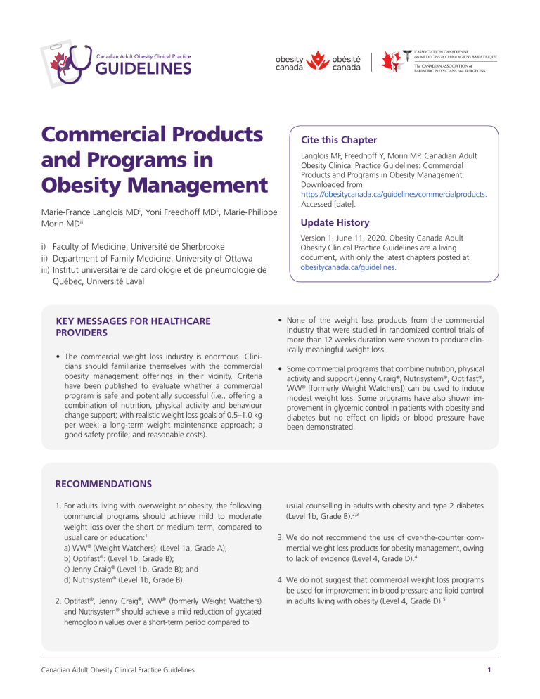 Commercial Products and Programs in Obesity Management Marie-France Langlois MDi, Yoni Freedhoff MDii, Marie-Philippe Morin MDiii i) Faculty of Medicine, Université de Sherbrooke ii) Department of Family Medicine, University of Ottawa iii) Institut universitaire de cardiologie et de pneumologie de Québec, Université Laval KEY MESSAGES FOR HEALTHCARE PROVIDERS • The commercial weight loss industry is enormous. Clinicians should familiarize themselves with the commercial obesity management offerings in their vicinity. Criteria have been published to evaluate whether a commercial program is safe and potentially successful (i.e., offering a combination of nutrition, physical activity and behaviour change support; with realistic weight loss goals of 0.5–1.0 kg per week; a long-term weight maintenance approach; a good safety profile; and reasonable costs). Cite this Chapter Langlois MF, Freedhoff Y, Morin MP. Canadian Adult Obesity Clinical Practice Guidelines: Commercial Products and Programs in Obesity Management. Downloaded from: https://obesitycanada.ca/guidelines/commercialproducts. Accessed [date]. Update History Version 1, June 11, 2020. Obesity Canada Adult Obesity Clinical Practice Guidelines are a living document, with only the latest chapters posted at obesitycanada.ca/guidelines. • None of the weight loss products from the commercial industry that were studied in randomized control trials of more than 12 weeks duration were shown to produce clinically meaningful weight loss. • Some commercial programs that combine nutrition, physical activity and support (Jenny Craig®, Nutrisystem®, Optifast®, WW® [formerly Weight Watchers]) can be used to induce modest weight loss. Some programs have also shown improvement in glycemic control in patients with obesity and diabetes but no effect on lipids or blood pressure have been demonstrated. RECOMMENDATIONS 1. For adults living with overweight or obesity, the following commercial programs should achieve mild to moderate weight loss over the short or medium term, compared to usual care or education:1 a) WW® (Weight Watchers): (Level 1a, Grade A); b) Optifast®: (Level 1b, Grade B); c) Jenny Craig® (Level 1b, Grade B); and d) Nutrisystem® (Level 1b, Grade B). 2. Optifast®, Jenny Craig®, WW® (formerly Weight Watchers) and Nutrisystem® should achieve a mild reduction of glycated hemoglobin values over a short-term period compared to Canadian Adult Obesity Clinical Practice Guidelines usual counselling in adults with obesity and type 2 diabetes (Level 1b, Grade B).2,3 3. We do not recommend the use of over-the-counter commercial weight loss products for obesity management, owing to lack of evidence (Level 4, Grade D).4 4. We do not suggest that commercial weight loss programs be used for improvement in blood pressure and lipid control in adults living with obesity (Level 4, Grade D).5 1 KEY MESSAGES FOR PEOPLE LIVING WITH OBESITY • The commercial weight loss industry is flourishing and is often characterized by unrealistic advertising. Before adhering to a commercial program or using a commercial weight loss product, people with obesity should ensure that the approach is safe and potentially effective (a combination of nutrition, physical activity and behaviour change support; realistic weight loss goals of 0.5–1.0 kg per week; a long-term weight maintenance approach; a good safety profile; and reasonable costs). • People living with overweight or obesity should be leery of weight loss programs that: i) promise weight loss without diet or exercise; ii) promise weight loss while eating as much food as you want; iii) promise reduction of weight Introduction “An intensive study of medical frauds and fads made over a period of nearly twenty years has convinced me that in the whole realm of quackery there is no field that is more easily worked nor one that offers greater financial returns to the medical swindler than that devoted to the exploitation of “cures for obesity” (Arthur J Cramp, MD, 1929).6 The commercial weight loss industry is enormous. The global weight loss and weight management market exceeded $168.95 billion in 2016 and is expected to reach $278.95 billion by 2023.7 Though that number includes medical obesity management, inclusive of behavioural obesity management programs, pharmaceuticals and bariatric surgery, there’s no shortage of commercial obesity management programs, products and promises that consumers can access without prescription or medical counsel. It is as true now as it was in 1929, some “cures for obesity” are undeniably exploitative. While healthcare providers cannot be expected to be familiar with all of the direct-to-consumer obesity management goods and services, developing an awareness of what is readily available to their patients in their local geographic area is worthwhile. It is also worthwhile to gain some familiarity with some of today’s more popular commercial weight loss initiatives. Evidence for these various products and services, however, is at times scant and at other times challenging. It is perhaps most challenging when it comes to the evaluation of obesity management service provision. The efficacy of a service is in some part, if not large part, dependent on the service providers’ skills. Furthermore, with many commercial programs the service being provided changes, and hence what might have been shown to be true for one iteration of a program may not necessarily be applicable to future iterations. Take, for example, WW® (formerly Weight Watchers Canada, now WW Canada Ltd. and WW International Inc.). There have been many studies exploring various aspects of the program’s outcomes. Since 1997, the Weight Watchers® program Canadian Adult Obesity Clinical Practice Guidelines from particular locations on the body; iv) promise overly rapid loss (for example: losing 30 pounds in 30 days); or v) include before and after photos and personal endorsements that seem