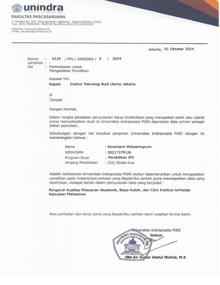 01 Oktober 2024 0129 X Kepala Institut Teknologi Budi Utomo Jakarta 2024 Kiswinarni Widyaningrum 20217379126 Pendidikan IPS Pengaruh Kualitas Pelayanan Akademik, Biaya Kuliah, dan Citra Institusi terhadap Kepuasan Mahasiswa 01 Oktober 2024 0129 X 2024 Kepala Kiswinarni Widyaningrum 20217379126 Pendidikan IPS Pengaruh Kualitas Pelayanan Akademik, Biaya Kuliah, dan Citra Institusi terhadap Kepuasan Mahasiswa 01 Oktober 2024 0129 X 2024 Kepala Kiswinarni Widyaningrum 20217379126 Pendidikan IPS Pengaruh Kualitas Pelayanan Akademik, Biaya Kuliah, dan Citra Institusi terhadap Kepuasan Mahasiswa 01 Oktober 2024 0129 X 2024 Dr. Hasbullah Kiswinarni Widyaningrum 20217379126 Pendidikan IPS Dr. Hasbullah Pengaruh Kualitas Pelayanan Akademik, Biaya Kuliah, dan Citra Institusi terhadap Kepuasan Mahasiswa 01 Oktober 2024 0129 X 2024 Dr. Maman Ahdiat, M.M. Kiswinarni Widyaningrum 20217379126 Pendidikan IPS Dr. Maman Ahdiat, M.M. Pengaruh Kualitas Pelayanan Akademik, Biaya Kuliah, dan Citra Institusi terhadap Kepuasan Mahasiswa Kiswinarni Widyaningrum 20217379126 Pendidikan IPS Pengaruh Kualitas Pelayanan Akademik, Biaya Kuliah, dan Citra Institusi terhadap Kepuasan Mahasiswa Dr. Hasbullah Dr. Maman Ahdiat, M.M.