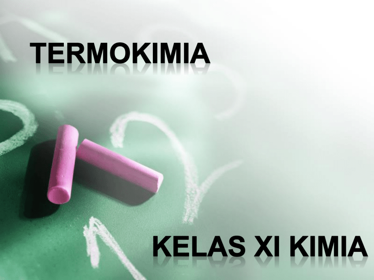 Termokimia Termokimia adalah cabang ilmu kimia yang mempelajari tentang kalor reaksi, yaitu pengukuran kalor yang menyertai reaksi kimia. SISTEM TERMOKIMIA LINGKUNGAN Sistem dan lingkungan Sistem adalah segala sesuatu yang menjadi yang menjadi pusat perhatian dalam mempelajari perubahan energi, sedangkan lingkungan segala sesuatu di luar sistem. Berdasarkan interaksinya dengan lingkungan, sistem ada 3 macam : 1.Sistem terbuka 2.Sistem tertutup 3.Sistem terisolasi Sifat-sifat sistem dan perbedaannya. No Nama Sistem Perpindahan Energi Materi 1 Sistem Terbuka Ya Ya 2 Sistem Tertutup Ya Tidak 3 Sistem Terisolasi Tidak Tidak Energi “Energi tidak dapat diciptakan atau dimusnahkan, hanya dapat di ubah kedalam bentuk energi lainnya” Dalam setiap reaksi kimia selalu terjadi perubahan energi. Satuan-satuan energi : Entalpi Entalpi merupakan energi dalam bentuk kalor yang tersimpan didalam suatu sistem, disimbolkan dengan H. Perubahan entalpi suatu sistem dapat diukur jika sistem mengalami perubahan. Perubahan entalpi (ΔH). ΔH=Hakhir-Hawal Reaksi Eksoterm • Reaksi yang melepaskan kalor atau menghasilkan energi, kalor mengalir dari sistem ke lingkungan (terjadi penurunan entalpi). • Hakhir < Hawal • Hakhir – Hawal < 0 • H bernilai negatif Reaksi Endoterm • Reaksi yang menyerap kalor atau membutuhkan energi, kalor mengalir dari lingkungan ke sistem (terjadi kenaikan entalpi). • Hakhir > Hawal • Hakhir – Hawal > 0 • H bernilai positif Perubahan entalpi standar (ΔH) Perubahan entalpi reaksi yang diukur pada temperatur 25°C (298 K) dan tekanan 1 atm disepakati sebagai perubahan entalp standar, dinyatakan dengan simbol ΔH. Satuan yang digunakan untuk menyatakan perubahan entalpi adalah kJ. Perubahan entalpi dalam molar adalah kJ/mol Entalpi pembentukan standar Perubahan entalpi pada pembentukan 1 mol senyawa dari unsur-unsurnya yang paling stabil, pada keadaan standar. Satuan (SI) ΔHf=…Kj/mol Contoh: Perubahan entalpi pembentukan standar dari gas karbondioksia (CO2) adalah -393,5 kJ/mol. Persamaan termokimianya: C(s) + O2(g) CO2(g) ΔHf= -393,5 kJ/mol Entalpi penguraian standar Perubahan entalpi pada penguraian 1 mol senyawa menjadi unsur-unsurnya, pada keadaan standar. Disimbolkan dengan ΔHd. Contoh: Perubahan entalpi penguraian H2O adalah +286 kJ/mol. Persamaan termokimianya: H2O(l) H2(g) + O2(g) ΔHd= +286 kJ/mol Entalpi pembakaran standar Perubahan entalpi pada pembakaran sempurna 1 mol unsur atau senyawa, pada keadaan standar. Disimbolkan dengan ΔHc. Contoh: Perubahan entalpi pembakaran gas CH4 adalah -802 kJ/mol. Persamaan termokimianya: CH4(g) + O2(g) CO2(g) + 2H2(g) ΔHc= -802 kJ/mol PERSAMAAN TERMOKIMIA Suatu persamaan reaksi kimia yang diikuti dengan nilai perubahan entalpi yang menyertai reaksi tersebut dikenal dengan istilah persamaan termokimia. Contoh soal persamaan termokimia. 1.Tuliskan persamaan termokimia untuk pembentukan 1 mol uap air bila diketahui reaksi sebagai berikut. 2H2O(g) → 2H2(g) + O2(g) ∆H = +489,6 kJ 2H2O(g) → 2H2(g) + O2(g) ∆H = +489,6 kJ Pembahasan. Pada soal diketahui reaksi penguraian, padahal yang ditanyakan adalah reaksi pembentukan, maka reaksinya harus berbalik arah, begitu pula dengan nilai ΔH juga berganti tandanya, yang awalnya positif menjadi negatif. Reaksi yang terjadi merupakan penguraian 2 mol H2O, padahal yang ditanyakan hanya pembentukan 1 mol H2O, maka reaksi serta nilai ΔH juga harus disesuaikan dengan dibagi menjadi 2. 2. Pada pembakaran 1 mol gas metana (CH4) dihasilkan 1 mol gas CO2 dan 2 mol air disertai pelepasan kalor sebesar 890,4 kJ. Tuliskan persamaan termokimianya! Pembahasan. Kalor yang dilepaskan menunjukkan reaksi eksoterm, sehingga ∆H = -890,4 kJ/mol. Persamaan termokimianya ditulis sebagai berikut. CH4(g) + 2O2(g) → CO2(g) + 2H2O(l) ∆H = – 890,4 kJ/mol 3. Pada reaksi antara 1 mol larutan NaHCO3 (soda kue) dengan 1 mol larutan HCl dihasilkan 1 mol larutan NaCl, 1 mol air dan 1 mol gas CO2 disertai penyerapan kalor sebesar 11,8 kJ. Tuliskan persamaan termokimia pada reaksi tersebut! 4. Tuliskan persamaan termokimia proses pembentukan gas karbondioksida jika diketahui ∆H = – 393,5 kJ/mol! 5. Perubahan entalpi penguraian H2O adalah +286 kJ/mol. Tuliskan persamaan termokimianya! 6. Untuk menguraikan 1 mol amonia menjadi gas nitrogen dan hidrogen diperlukan kalor +46 kJ. Tuliskan persamaan termokimianya! 7. Tuliskan persamaan termokimia untuk pembakaran 1 mol gas etena membentuk karbon dioksida dan uap air menghasilkan 142 kJ!