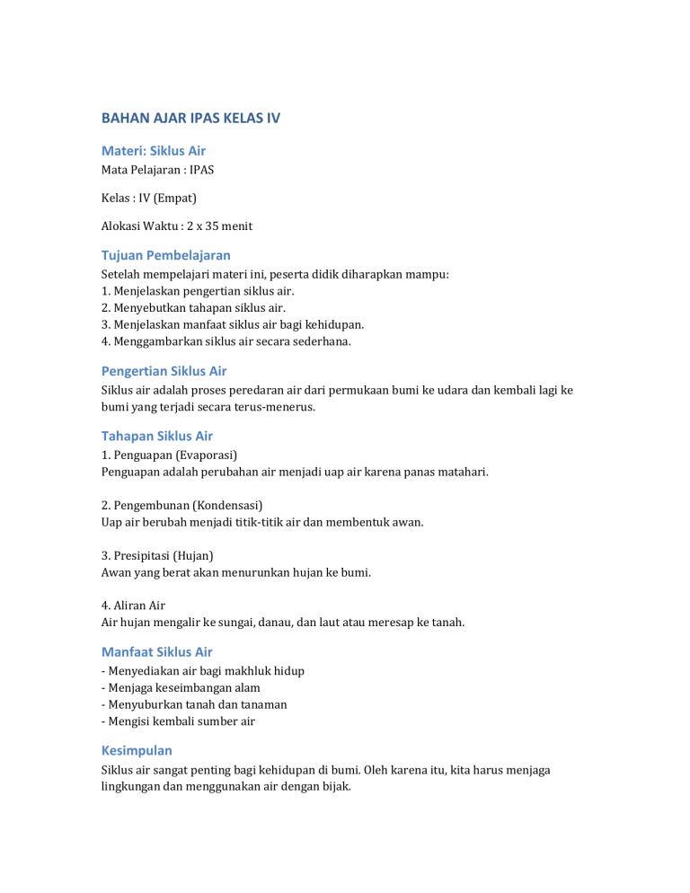 BAHAN AJAR IPAS KELAS IV Materi: Siklus Air Mata Pelajaran : IPAS Kelas : IV (Empat) Alokasi Waktu : 2 x 35 menit Tujuan Pembelajaran Setelah mempelajari materi ini, peserta didik diharapkan mampu: 1. Menjelaskan pengertian siklus air. 2. Menyebutkan tahapan siklus air. 3. Menjelaskan manfaat siklus air bagi kehidupan. 4. Menggambarkan siklus air secara sederhana. Pengertian Siklus Air Siklus air adalah proses peredaran air dari permukaan bumi ke udara dan kembali lagi ke bumi yang terjadi secara terus-menerus. Tahapan Siklus Air 1. Penguapan (Evaporasi) Penguapan adalah perubahan air menjadi uap air karena panas matahari. 2. Pengembunan (Kondensasi) Uap air berubah menjadi titik-titik air dan membentuk awan. 3. Presipitasi (Hujan) Awan yang berat akan menurunkan hujan ke bumi. 4. Aliran Air Air hujan mengalir ke sungai, danau, dan laut atau meresap ke tanah. Manfaat Siklus Air - Menyediakan air bagi makhluk hidup - Menjaga keseimbangan alam - Menyuburkan tanah dan tanaman - Mengisi kembali sumber air Kesimpulan Siklus air sangat penting bagi kehidupan di bumi. Oleh karena itu, kita harus menjaga lingkungan dan menggunakan air dengan bijak.