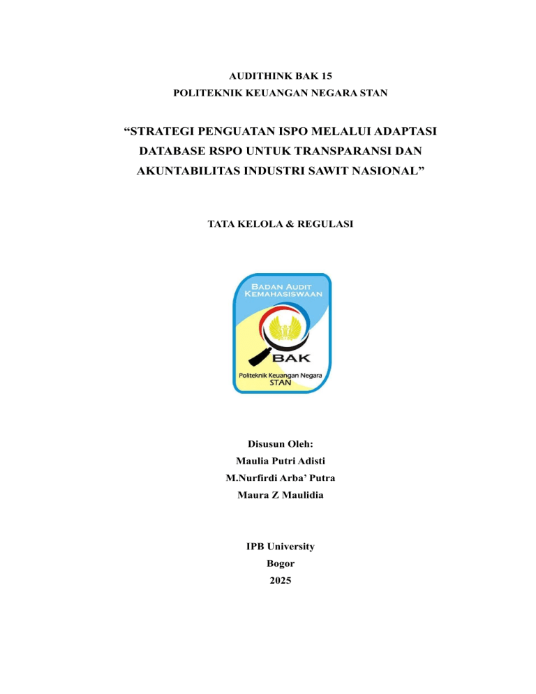 AUDITHINK BAK 15 POLITEKNIK KEUANGAN NEGARA STAN “STRATEGI PENGUATAN ISPO MELALUI ADAPTASI DATABASE RSPO UNTUK TRANSPARANSI DAN AKUNTABILITAS INDUSTRI SAWIT NASIONAL” TATA KELOLA & REGULASI Disusun Oleh: Maulia Putri Adisti M.Nurfirdi Arba’ Putra Maura Z Maulidia IPB University Bogor 2025 PENDAHULUAN “Tidak satu pun permasalahan utama yang dihadapi umat manusia akan terselesaikan tanpa akses informasi” - Christophe Deloire. Pernyataan tersebut mengartikan bahwa tranparansi adalah sebuah media yang sangat penting untuk menyelesaikan masalah yang ada dalam kehidupan. Permasalahan global yang sedang marak terjadi saat ini yaitu terkait masalah lingkungan, dimana penegakan dan antisipasinya belum maksimal termasuk di Indonesia. Sebagai negara yang mempunyai lingkungan hijau yang sangat melimpah, tentu isu lingkungan harus memiliki perhatian khusus. Salah satu permasalahannya yakni terkait dengan perkebunan sawit. Menurut Outlook Kelapa Sawit yang dipublikasikan oleh Kementerian Pertanian, menyampaikan bahwa Indonesia merupakan produsen kelapa sawit terbesar di dunia dengan luas areal sebesar 16,83 juta hektar. Produsen atau perusahaan kelapa sawit tersebut tidak terlebih dari yang namanya sertifikasi seperti Indonesian Sustainable Palm Oil (ISPO) dan juga Roundtable on Sustainable Palm Oil (RSPO). Berdasarkan definisinya, ISPO merupakan kebijakan pemerintah Indonesia yang dibentuk melalui Peraturan Presiden No. 44 Tahun 2020, sedangkan RSPO merupakan inisiatif multi-pihak global yang berdiri sejak 2004 dan bersifat sukarela. Perbedaan mendasar antara keduanya terletak pada orientasi dan kewenangan, ISPO berfungsi sebagai instrumen regulasi nasional, sehingga seluruh perusahaan sawit yang beroperasi di Indonesia wajib mengikuti standar ini. Walaupun demikian, investigasi lapangan mendapati bahwa ekspansi kelapa sawit di sejumlah wilayah seperti Papua dan Kalimantan Tengah, seringkali melanggar standar keberlanjutan meskipun sudah memiliki klaim kepatuhan terhadap ISPO (Mongabay Indonesia & Kaoem Talapak. 2023). Salah satu hal yang melatarbelakangi hal tersebut yaitu publikasi terhadap hasil audit ISPO masih dianggap sebagai data internal perusahaan dan untuk kepentingan pemerintah saja. Grievance Independent milik ISPO tidak terbuka layaknya RSPO yang memiliki sistem pengaduan yang dapat diakses oleh publik. Bagi pelapor, mereka akan mudah memantau layaknya sistem yang dapat berkomunikasi dua arah. ISPO perlu mulai mengimplementasikan sistem Grievance Independent agar sertifikasi ISPO tidak hanya berlaku sebagai label hijau saja, tetapi benar-benar mempertanggungjawabkan terkait dampak dan kelestarian alamnya. PEMBAHASAN Analisis sertifikasi Indonesian Sustainable Palm Oil (ISPO) Sistem audit ISPO menganut tujuh komponen penilaian yang harus dipenuhi oleh perusahaan yang akan diberikan sertifikasi serta oleh petani kecil di masa depan, yaitu: 1) Kepatuhan terhadap izin usaha yang sah, 2) Pelaksanaan pengelolaan perkebunan berdasarkan Good Agricultural Practices (GAP), 3) Melindungi hutan primer dan lahan gambut, 4) Melaksanakan dan memantau pengelolaan lingkungan (misalnya, melindungi keanekaragaman hayati, pengelolaan limbah, dan pencegahan serta mitigasi kebakaran), 5) Menunjukkan tanggung jawab terhadap karyawan, dan 6) Berkontribusi pada pemberdayaan sosial dan ekonomi masyarakat, 7) Komitmen terhadap perbaikan berkelanjutan dalam produksi minyak sawit yang berkelanjutan (Hidayat dkk, 2018). Tujuh komponen yang dianut oleh ISPO tersebut, berdasarkan kriteria dan peraturan lebih rinci yang dikumpulkan dari peraturan kelapa sawit yang ada di lima Kementerian berbeda; Kementerian Pertanian, Lingkungan Hidup dan Kehutanan, Kementerian Agraria dan Tata Ruang, Kementerian Tenaga Kerja dan Transmigrasi, serta Kementerian Kesehatan. Dalam prinsipnya, ISPO mengikuti Peraturan Menteri Pertanian Republik Indonesia Nomor 38 Tahun 2020 tentang Penyelenggaraan Sertifikasi Perkebunan Kelapa Sawit Berkelanjutan Indonesia. Adapun proses dalam mendapatkan sertifikasi ISPO tersebut terdiri dari beberapa tahapan (Tabel 1). Tabel 1. Proses sertifikasi Indonesian Sustainable Palm Oil (ISPO) No Tahap Kegiatan Keterangan Pemohon mengajukan 11. . Permohonan permohonan sertifikasi kepada lembaga sertifikasi terakreditasi. Formulir permohonan diisi, data umum organisasi disampaikan. Lembaga sertifikasi melakukan 22. Audit Kecukupan pemeriksaan dokumen dan kesiapan Memastikan dokumen legalitas, manajemen, dan persyaratan terpenuhi. organisasi sebelum audit lapangan. Verifikasi ke lapangan untuk 33. Audit Lapangan Tahap 1 Audit lapangan harus menilai kesesuaian dilakukan dalam jangka pelaksanaan waktu paling lama 3 terhadap standar bulan sejak perjanjian. ISPO. Hasil audit dianalisis dan 44. Evaluasi dan diputuskan apakah Keputusan Sertifikasi organisasi layak mendapat sertifikat. Sertifikat ISPO 55. Sertifikasi/Penerbitan diterbitkan kepada organisasi jika lolos audit. Organisasi yang “lulus” memenuhi semua persyaratan akan diterbitkan sertifikat ISPO. Sertifikat menjadi bukti bahwa organisasi telah mematuhi standar ISPO. Audit berkala 66. Survei/Audit Pengawasan untuk memastikan Memastikan kontinuitas organisasi tetap kepatuhan dan perbaikan memenuhi standar berkelanjutan. setelah sertifikasi. Organisasi mengikuti audit 77. Audit Ulang/Resertifikasi ulang setelah masa Merupakan tahap berlaku sertifikat pembaruan sertifikasi habis atau bila agar tetap valid. terjadi perubahan signifikan. Sumber: https://mutuhijau.com/layanan/ispo/informasi-proses Komparasi antara ISPO dan RSPO Pada dasarnya, ISPO hadir sebagai inisiatif tandingan pemerintah Indonesia terhadap RSPO (Hidayat dkk, 2018). Namun, sayangnya pemerintah belum menerapkan poin poin lanjutan yang akan membantu menaikkan kesejahteraan pekebun dan ekonomi sawit. Penelitian akan perbandingan antara RSPO, ISPO dan MSPO menunjukkan bahwa ISPO mendapatkan nilai terendah. Berdasarkan aspek pelabelan, tingkat kepercayaan, perlakuan adil bagi petani kecil