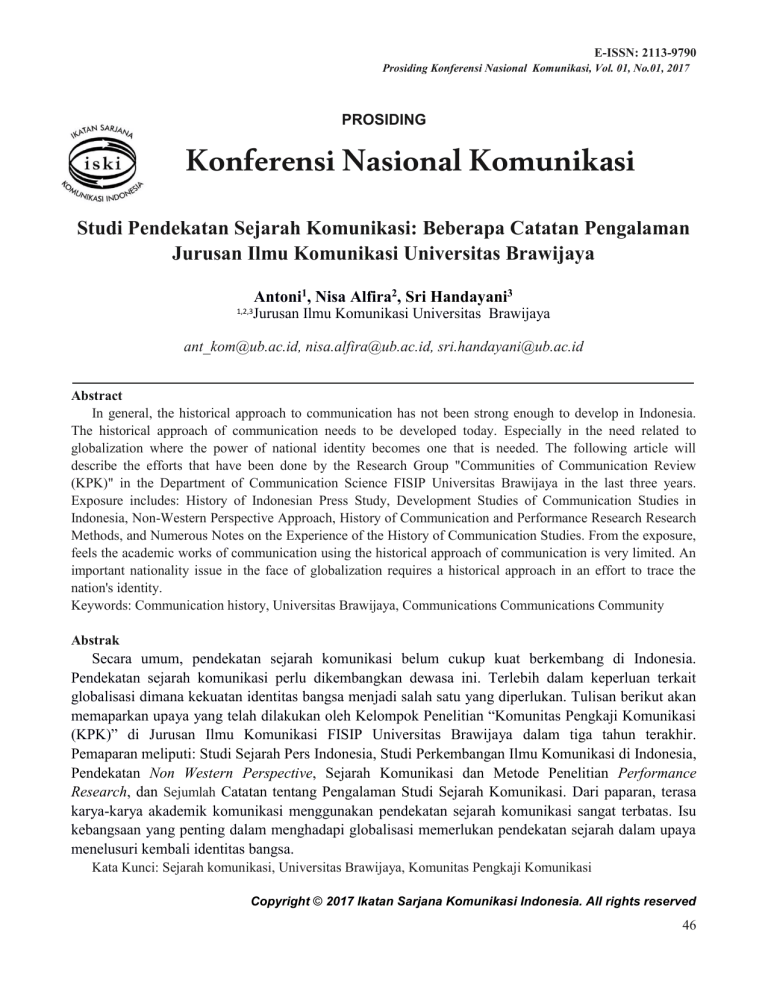 E-ISSN: 2113-9790 Prosiding Konferensi Nasional Komunikasi, Vol. 01, No.01, 2017 PROSIDING Konferensi Nasional Komunikasi Studi Pendekatan Sejarah Komunikasi: Beberapa Catatan Pengalaman Jurusan Ilmu Komunikasi Universitas Brawijaya Antoni1, Nisa Alfira2, Sri Handayani3 1,2,3 Jurusan Ilmu Komunikasi Universitas Brawijaya [email protected], [email protected], [email protected] Abstract In general, the historical approach to communication has not been strong enough to develop in Indonesia. The historical approach of communication needs to be developed today. Especially in the need related to globalization where the power of national identity becomes one that is needed. The following article will describe the efforts that have been done by the Research Group "Communities of Communication Review (KPK)" in the Department of Communication Science FISIP Universitas Brawijaya in the last three years. Exposure includes: History of Indonesian Press Study, Development Studies of Communication Studies in Indonesia, Non-Western Perspective Approach, History of Communication and Performance Research Research Methods, and Numerous Notes on the Experience of the History of Communication Studies. From the exposure, feels the academic works of communication using the historical approach of communication is very limited. An important nationality issue in the face of globalization requires a historical approach in an effort to trace the nation's identity. Keywords: Communication history, Universitas Brawijaya, Communications Communications Community Abstrak Secara umum, pendekatan sejarah komunikasi belum cukup kuat berkembang di Indonesia. Pendekatan sejarah komunikasi perlu dikembangkan dewasa ini. Terlebih dalam keperluan terkait globalisasi dimana kekuatan identitas bangsa menjadi salah satu yang diperlukan. Tulisan berikut akan memaparkan upaya yang telah dilakukan oleh Kelompok Penelitian “Komunitas Pengkaji Komunikasi (KPK)” di Jurusan Ilmu Komunikasi FISIP Universitas Brawijaya dalam tiga tahun terakhir. Pemaparan meliputi: Studi Sejarah Pers Indonesia, Studi Perkembangan Ilmu Komunikasi di Indonesia, Pendekatan Non Western Perspective, Sejarah Komunikasi dan Metode Penelitian Performance Research, dan Sejumlah Catatan tentang Pengalaman Studi Sejarah Komunikasi. Dari paparan, terasa karya-karya akademik komunikasi menggunakan pendekatan sejarah komunikasi sangat terbatas. Isu kebangsaan yang penting dalam menghadapi globalisasi memerlukan pendekatan sejarah dalam upaya menelusuri kembali identitas bangsa. Kata Kunci: Sejarah komunikasi, Universitas Brawijaya, Komunitas Pengkaji Komunikasi Copyright © 2017 Ikatan Sarjana Komunikasi Indonesia. All rights reserved 46 E-ISSN: 2113-9790 Prosiding Konferensi Nasional Komunikasi, Vol. 01, No.01, 2017 Introduction Pendekatan sejarah komunikasi merupakan pendekatan yang dikembangkan oleh Craig dkk. Sekalipun dianggap baru, namun secara praktik sebenarnya sejarah komunikasi termasuk praktik yang telah lampau. Sejarah komunikasi dapat dipahami dalam istilah yang lebih luas, misalny sebagai representasi tertulis, lisan, atau representasi lainnya yang menandakan kejadian dan praktik di masa lalu. “From this perspective, every culture has at least some analogue to communication history— e.g., declarations from the gods or words from the leaders of earlier generations passed down through oral modes and traditions. In traditional societies these acts of remembering were not conceived of as history, nor were the practices understood as “communication,” so the analogy is imperfect. Nonetheless, the scope of communication history potentially reaches out toward the history of humanity writ large.” (Simonson, Peck, Craig, and Jackson, 2013, h. 13) Beberapa bacaan seputar pendekatan sejarah komunikasi seperti Explorations in Communication and History (editor Barbie Zelizer, 2008) dan The Handbook of Communication History (editor: Peter Simonson, Janice Peck, Robert T. Craig, John P. Jackson, Jr, 2013). Dari tradisi Eropa, dapat dilihat karya-karya James Curran. Termasuk yang terbaru, Curran membahas mengenai sejarah internet. Di Indonesia beberapa karya akademik yang dapat ditempatkan terkait pendekatan sejarah komunikasi seperti disertasi Bachtiar Aly (Jerman), disertasi Yuliandre Darwis, skripsi Ignatius Haryanto, dan skripsi Akhmad Zaini Abar (UGM). Dari aspek kepustakaan yang selama ini menjadi rujukan pada Simonson, Michael Schudson, James Curran, Barbie Zelizer, James W. Carey. Sementara dalam kontek Indonesia, Soebagio I.N. merupakan salah satu figur yang penting diapresiasi atas ketekunannya mendokumentasikan perjalanan pers Indonesia selain Abdurahman Surjomihardjo serta Ignatius Haryanto. Beberapa pandangan yang muncul terkait aspek sejarah komunikasi, misal dalam kontek studi pers uang terlalu Jawa sentris. Upaya mencari perspektif di luar Jawa dipandang penting dikembangkan (Haryanto, dalam Sunarti, 2013). Secara umum, pendekatan sejarah komunikasi belum cukup kuat berkembang di Indonesia. Pendekatan sejarah komunikasi perlu dikembangkan dewasa ini. Terlebih dalam keperluan terkait globalisasi dimana kekuatan identitas bangsa menjadi salah satu yang diperlukan. Tulisan berikut akan memaparkan upaya yang telah dilakukan oleh Kelompok Penelitian “Komunitas Pengkaji Komunikasi (KPK)” di Jurusan Ilmu Komunikasi FISIP Universitas Brawijaya dalam tiga tahun terakhir. Jurusan Ilmu Komunikasi (JIK) FISIP UB telah berupaya merintis dan mengembangkan pendekatan sejarah komunikasi dalam 3 tahun terakhir melalui didirikannya kelompok penelitian Komunitas Pengkaji Komunikasi (KPK). Studi dengan pendekatan sejarah komunikasi dilakukan baik melalui payung penelitian dosen maupun skripsi/tesis mahasiswa. Lebih jauh, pada Program Magister Ilmu Komunikasi JIK FISIP UB telah terdapat pula mata kuliah Sejarah Media Massa di Asia dan Indonesia. Hal ini juga telah menunjukkan perhatian terhadap pentingnya pendekatan sejarah komunikasi dikembangkan. Pemaparan be