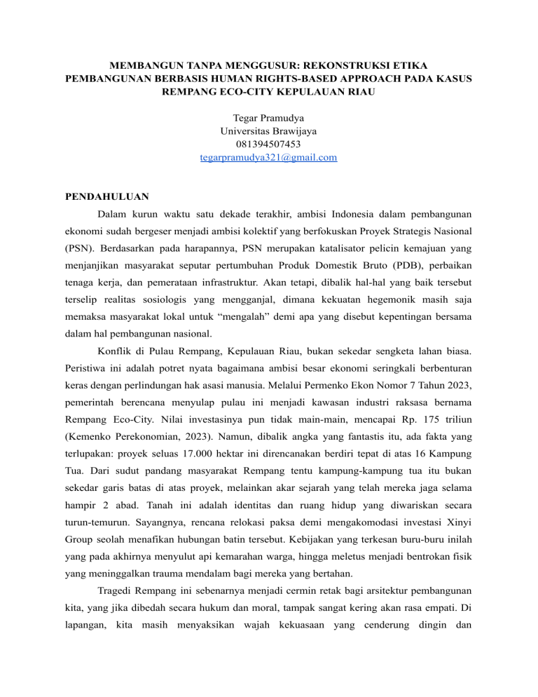 MEMBANGUN TANPA MENGGUSUR: REKONSTRUKSI ETIKA PEMBANGUNAN BERBASIS HUMAN RIGHTS-BASED APPROACH PADA KASUS REMPANG ECO-CITY KEPULAUAN RIAU Tegar Pramudya Universitas Brawijaya 081394507453 [email protected] PENDAHULUAN Dalam kurun waktu satu dekade terakhir, ambisi Indonesia dalam pembangunan ekonomi sudah bergeser menjadi ambisi kolektif yang berfokuskan Proyek Strategis Nasional (PSN). Berdasarkan pada harapannya, PSN merupakan katalisator pelicin kemajuan yang menjanjikan masyarakat seputar pertumbuhan Produk Domestik Bruto (PDB), perbaikan tenaga kerja, dan pemerataan infrastruktur. Akan tetapi, dibalik hal-hal yang baik tersebut terselip realitas sosiologis yang mengganjal, dimana kekuatan hegemonik masih saja memaksa masyarakat lokal untuk “mengalah” demi apa yang disebut kepentingan bersama dalam hal pembangunan nasional. Konflik di Pulau Rempang, Kepulauan Riau, bukan sekedar sengketa lahan biasa. Peristiwa ini adalah potret nyata bagaimana ambisi besar ekonomi seringkali berbenturan keras dengan perlindungan hak asasi manusia. Melalui Permenko Ekon Nomor 7 Tahun 2023, pemerintah berencana menyulap pulau ini menjadi kawasan industri raksasa bernama Rempang Eco-City. Nilai investasinya pun tidak main-main, mencapai Rp. 175 triliun (Kemenko Perekonomian, 2023). Namun, dibalik angka yang fantastis itu, ada fakta yang terlupakan: proyek seluas 17.000 hektar ini direncanakan berdiri tepat di atas 16 Kampung Tua. Dari sudut pandang masyarakat Rempang tentu kampung-kampung tua itu bukan sekedar garis batas di atas proyek, melainkan akar sejarah yang telah mereka jaga selama hampir 2 abad. Tanah ini adalah identitas dan ruang hidup yang diwariskan secara turun-temurun. Sayangnya, rencana relokasi paksa demi mengakomodasi investasi Xinyi Group seolah menafikan hubungan batin tersebut. Kebijakan yang terkesan buru-buru inilah yang pada akhirnya menyulut api kemarahan warga, hingga meletus menjadi bentrokan fisik yang meninggalkan trauma mendalam bagi mereka yang bertahan. Tragedi Rempang ini sebenarnya menjadi cermin retak bagi arsitektur pembangunan kita, yang jika dibedah secara hukum dan moral, tampak sangat kering akan rasa empati. Di lapangan, kita masih menyaksikan wajah kekuasaan yang cenderung dingin dan transaksional: sebuah logika usang yang seolah menghalalkan pengorbanan hak komunitas kecil demi mengejar grafik pertumbuhan ekonomi makro. Padahal, kita sejatinya memiliki opsi untuk menempuh jalan pembangunan yang lebih beradab, di mana ‘investasi’ tidak diletakkan sebagai musuh bagi harkat ‘manusia’. Akar persoalannya terletak pada pengabaian prinsip Free, Prior, and Informed Consent (FPIC). Pada hakikatnya, masyarakat adat berhak memiliki kedaulatan mutlak untuk menerima atau menolak sebuah proyek sejak fase perencanaan, tanpa bayang-bayang intimidasi. Namun, ketika hak fundamental ini diamputasi, masyarakat yang semestinya berperan sebagai aktor utama justru tergilas dan berakhir menjadi korban dari ambisi kemajuan itu sendiri (Komnas HAM, 2023). Berangkat dari realitas tersebut, esai ini ditulis dengan intensi yang melampaui sekadar kritik; tulisan ini menawarkan sebuah peta jalan untuk merajut ulang etika pembangunan bangsa yang kian timpang. Fokus utamanya adalah mengurai konsepsi Human Rights-Based Approach (HRBA) sebuah pendekatan berbasis HAM yang hadir sebagai antitesis bagi model pembangunan yang represif. Melalui kacamata HRBA, kita didorong untuk merombak paradigma: rakyat tidak boleh lagi dipandang sebagai ‘objek’ yang cukup dibungkam dengan kompensasi materi, melainkan sebagai subjek berdaulat yang memegang kendali penuh atas nasib ruang hidupnya. Dengan merefleksikan tragedi Rempang, tulisan ini berikhtiar mencari titik temu agar kearifan lokal dapat hidup berdampingan dalam napas Proyek Strategis Nasional (PSN). Cita-citanya sederhana namun esensial: mewujudkan kemajuan fisik yang inklusif tanpa harus menanggalkan sehelai pun martabat manusia di dalamnya. ISI DAN PEMBAHASAN Konflik agraria di Pulau Rempang tidak boleh dipandang sesempit perlawanan warga terhadap dominasi investor belaka. Jika kita menyelami lebih dalam melalui kacamata sosiologis Johan Galtung, apa yang terjadi di Rempang adalah manifestasi dari ‘Segitiga Kekerasan’ yang nyaris sempurna. Kekerasan fisik yang meletus di lapangan hanyalah puncak gunung es yang kasat mata. Jauh di bawah permukaan, terdapat dua jenis kekerasan lain yang lebih fundamental dan menjadi motor penggerak konflik, yakni kekerasan struktural dan kekerasan budaya (Ramadani et al., 2025). Kekerasan struktural ini bekerja secara senyap melalui kebijakan negara yang memaksakan legalitas hukum tanpa mempedulikan legitimasi sosial. Penegasan BP Batam pada Maret 2025 bahwa Rempang Eco-City tetap masuk dalam RPJMN 2025-2029 seolah menjadi ‘cek kosong’ bagi negara untuk melakukan ekspansi lahan secara sepihak, yang seringkali menggilas hak hidup masyarakat pribumi yang telah menetap disana selama berabad-abad. Dalam perspektif teori konflik Ralf Dahrendorf, kondisi ini menciptakan jurang relasi kuasa yang sangat timpang antara otoritas negara dan warga sipil (Azhar & Oliwidyartiza, 2025). Di sini, instrumen hukum tidak lagi berfungsi sebagai perisai pelindung masyarakat (social defence), melainkan beralih rupa menjadi alat pembenaran bagi ekspansi modal. Akhirnya, masyarakat adat dipaksa berada di posisi subordinat yang harus ‘mengalah’ demi narasi besar pertumbuhan ekonomi. Proses ini tidak hanya merampas ruang hidup, tetapi juga menorehkan luka sejarah yang sangat mendalam bagi identitas dan martabat orang Melayu di kepulauan tersebut. Ironi terbesar dalam proyek ini terletak pada penggunaan label “Eco-City” atau kota ramah lingkungan yang justru kontradiktif dengan realitas lapangan. Data investigatif menunjukkan indikasi kuat praktek Greenwashing. Laporan Komnas Perempuan (2025) mengungkap bahwa konstruksi pemukiman relokasi di Tanjung Banon justru merusak ekosistem mangrove seluas lebih dari 2.800 