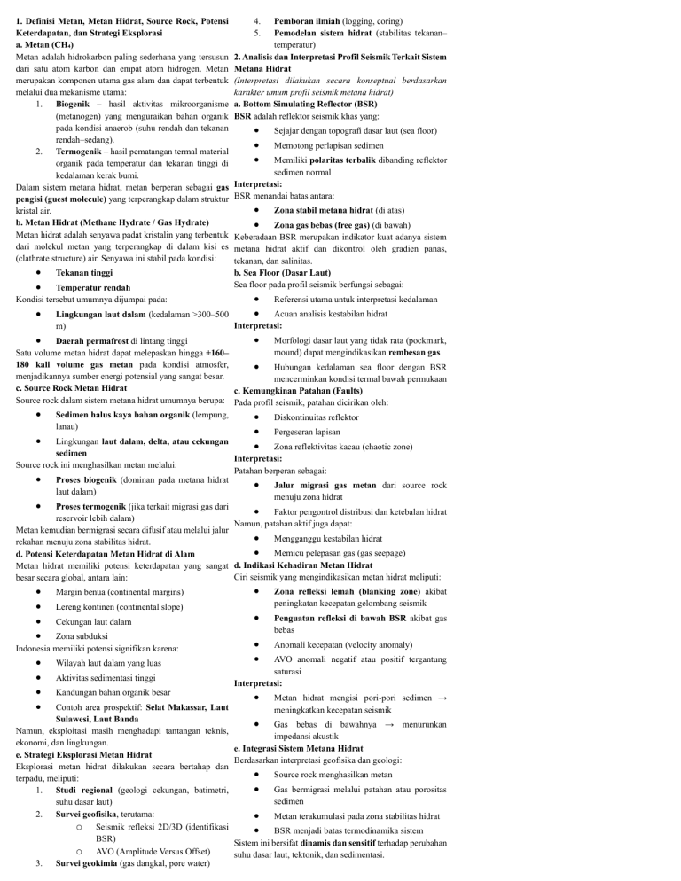 1. Definisi Metan, Metan Hidrat, Source Rock, Potensi 4. Pemboran ilmiah (logging, coring) Keterdapatan, dan Strategi Eksplorasi 5. Pemodelan sistem hidrat (stabilitas tekanan– a. Metan (CHâ‚„) temperatur) Metan adalah hidrokarbon paling sederhana yang tersusun 2. Analisis dan Interpretasi Profil Seismik Terkait Sistem dari satu atom karbon dan empat atom hidrogen. Metan Metana Hidrat merupakan komponen utama gas alam dan dapat terbentuk (Interpretasi dilakukan secara konseptual berdasarkan melalui dua mekanisme utama: karakter umum profil seismik metana hidrat) 1. Biogenik – hasil aktivitas mikroorganisme a. Bottom Simulating Reflector (BSR) (metanogen) yang menguraikan bahan organik BSR adalah reflektor seismik khas yang: pada kondisi anaerob (suhu rendah dan tekanan • Sejajar dengan topografi dasar laut (sea floor) rendah–sedang). • Memotong perlapisan sedimen 2. Termogenik – hasil pematangan termal material • Memiliki polaritas terbalik dibanding reflektor organik pada temperatur dan tekanan tinggi di sedimen normal kedalaman kerak bumi. Dalam sistem metana hidrat, metan berperan sebagai gas Interpretasi: pengisi (guest molecule) yang terperangkap dalam struktur BSR menandai batas antara: • Zona stabil metana hidrat (di atas) kristal air. b. Metan Hidrat (Methane Hydrate / Gas Hydrate) • Zona gas bebas (free gas) (di bawah) Metan hidrat adalah senyawa padat kristalin yang terbentuk Keberadaan BSR merupakan indikator kuat adanya sistem dari molekul metan yang terperangkap di dalam kisi es metana hidrat aktif dan dikontrol oleh gradien panas, (clathrate structure) air. Senyawa ini stabil pada kondisi: tekanan, dan salinitas. • • Tekanan tinggi Temperatur rendah Kondisi tersebut umumnya dijumpai pada: • b. Sea Floor (Dasar Laut) Sea floor pada profil seismik berfungsi sebagai: • • Referensi utama untuk interpretasi kedalaman Acuan analisis kestabilan hidrat Lingkungan laut dalam (kedalaman >300–500 Interpretasi: m) • Morfologi dasar laut yang tidak rata (pockmark, • Daerah permafrost di lintang tinggi mound) dapat mengindikasikan rembesan gas Satu volume metan hidrat dapat melepaskan hingga ±160– 180 kali volume gas metan pada kondisi atmosfer, • Hubungan kedalaman sea floor dengan BSR menjadikannya sumber energi potensial yang sangat besar. mencerminkan kondisi termal bawah permukaan c. Source Rock Metan Hidrat c. Kemungkinan Patahan (Faults) Source rock dalam sistem metana hidrat umumnya berupa: Pada profil seismik, patahan dicirikan oleh: • Sedimen halus kaya bahan organik (lempung, lanau) • • • Diskontinuitas reflektor • • • • Margin benua (continental margins) • Zona refleksi lemah (blanking zone) akibat peningkatan kecepatan gelombang seismik • Penguatan refleksi di bawah BSR akibat gas bebas Anomali kecepatan (velocity anomaly) • • • • Wilayah laut dalam yang luas • • Pergeseran lapisan Lingkungan laut dalam, delta, atau cekungan Zona reflektivitas kacau (chaotic zone) sedimen Interpretasi: Source rock ini menghasilkan metan melalui: Patahan berperan sebagai: • Proses biogenik (dominan pada metana hidrat • Jalur migrasi gas metan dari source rock laut dalam) menuju zona hidrat • Proses termogenik (jika terkait migrasi gas dari • Faktor pengontrol distribusi dan ketebalan hidrat reservoir lebih dalam) Namun, patahan aktif juga dapat: Metan kemudian bermigrasi secara difusif atau melalui jalur • Mengganggu kestabilan hidrat rekahan menuju zona stabilitas hidrat. • Memicu pelepasan gas (gas seepage) d. Potensi Keterdapatan Metan Hidrat di Alam Metan hidrat memiliki potensi keterdapatan yang sangat d. Indikasi Kehadiran Metan Hidrat Ciri seismik yang mengindikasikan metan hidrat meliputi: besar secara global, antara lain: • Lereng kontinen (continental slope) Cekungan laut dalam Zona subduksi Indonesia memiliki potensi signifikan karena: Aktivitas sedimentasi tinggi Kandungan bahan organik besar AVO anomali negatif atau positif tergantung saturasi Interpretasi: • Metan hidrat mengisi pori-pori sedimen → Contoh area prospektif: Selat Makassar, Laut meningkatkan kecepatan seismik Sulawesi, Laut Banda • Gas bebas di bawahnya → menurunkan Namun, eksploitasi masih menghadapi tantangan teknis, impedansi akustik ekonomi, dan lingkungan. e. Integrasi Sistem Metana Hidrat e. Strategi Eksplorasi Metan Hidrat Berdasarkan interpretasi geofisika dan geologi: Eksplorasi metan hidrat dilakukan secara bertahap dan • Source rock menghasilkan metan terpadu, meliputi: • Gas bermigrasi melalui patahan atau porositas 1. Studi regional (geologi cekungan, batimetri, sedimen suhu dasar laut) 2. Survei geofisika, terutama: • Metan terakumulasi pada zona stabilitas hidrat o Seismik refleksi 2D/3D (identifikasi • BSR menjadi batas termodinamika sistem BSR) Sistem ini bersifat dinamis dan sensitif terhadap perubahan o AVO (Amplitude Versus Offset) suhu dasar laut, tektonik, dan sedimentasi. 3. Survei geokimia (gas dangkal, pore water)