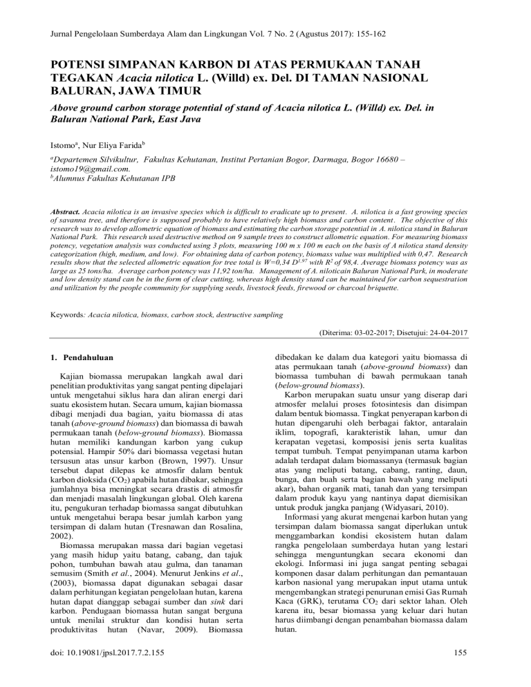 Jurnal Pengelolaan Sumberdaya Alam dan Lingkungan Vol. 7 No. 2 (Agustus 2017): 155-162 POTENSI SIMPANAN KARBON DI ATAS PERMUKAAN TANAH TEGAKAN Acacia nilotica L. (Willd) ex. Del. DI TAMAN NASIONAL BALURAN, JAWA TIMUR Above ground carbon storage potential of stand of Acacia nilotica L. (Willd) ex. Del. in Baluran National Park, East Java Istomoa, Nur Eliya Faridab Departemen Silvikultur, Fakultas Kehutanan, Institut Pertanian Bogor, Darmaga, Bogor 16680 – [email protected]. b Alumnus Fakultas Kehutanan IPB a Abstract. Acacia nilotica is an invasive species which is difficult to eradicate up to present. A. nilotica is a fast growing species of savanna tree, and therefore is supposed probably to have relatively high biomass and carbon content. The objective of this research was to develop allometric equation of biomass and estimating the carbon storage potential in A. nilotica stand in Baluran National Park. This research used destructive method on 9 sample trees to construct allometric equation. For measuring biomass potency, vegetation analysis was conducted using 3 plots, measuring 100 m x 100 m each on the basis of A nilotica stand density categorization (high, medium, and low). For obtaining data of carbon potency, biomass value was multiplied with 0,47. Research results show that the selected allometric equation for tree total is W=0,34 D1,97 with R2 of 98,4. Average biomass potency was as large as 25 tons/ha. Average carbon potency was 11,92 ton/ha. Management of A. niloticain Baluran National Park, in moderate and low density stand can be in the form of clear cutting, whereas high density stand can be maintained for carbon sequestration and utilization by the people community for supplying seeds, livestock feeds, firewood or charcoal briquette. Keywords: Acacia nilotica, biomass, carbon stock, destructive sampling (Diterima: 03-02-2017; Disetujui: 24-04-2017 1. Pendahuluan Kajian biomassa merupakan langkah awal dari penelitian produktivitas yang sangat penting dipelajari untuk mengetahui siklus hara dan aliran energi dari suatu ekosistem hutan. Secara umum, kajian biomassa dibagi menjadi dua bagian, yaitu biomassa di atas tanah (above-ground biomass) dan biomassa di bawah permukaan tanah (below-ground biomass). Biomassa hutan memiliki kandungan karbon yang cukup potensial. Hampir 50% dari biomassa vegetasi hutan tersusun atas unsur karbon (Brown, 1997). Unsur tersebut dapat dilepas ke atmosfir dalam bentuk karbon dioksida (CO2) apabila hutan dibakar, sehingga jumlahnya bisa meningkat secara drastis di atmosfir dan menjadi masalah lingkungan global. Oleh karena itu, pengukuran terhadap biomassa sangat dibutuhkan untuk mengetahui berapa besar jumlah karbon yang tersimpan di dalam hutan (Tresnawan dan Rosalina, 2002). Biomassa merupakan massa dari bagian vegetasi yang masih hidup yaitu batang, cabang, dan tajuk pohon, tumbuhan bawah atau gulma, dan tanaman semusim (Smith et al., 2004). Menurut Jenkins et al., (2003), biomassa dapat digunakan sebagai dasar dalam perhitungan kegiatan pengelolaan hutan, karena hutan dapat dianggap sebagai sumber dan sink dari karbon. Pendugaan biomassa hutan sangat berguna untuk menilai struktur dan kondisi hutan serta produktivitas hutan (Navar, 2009). Biomassa doi: 10.19081/jpsl.2017.7.2.155 dibedakan ke dalam dua kategori yaitu biomassa di atas permukaan tanah (above-ground biomass) dan biomassa tumbuhan di bawah permukaan tanah (below-ground biomass). Karbon merupakan suatu unsur yang diserap dari atmosfer melalui proses fotosintesis dan disimpan dalam bentuk biomassa. Tingkat penyerapan karbon di hutan dipengaruhi oleh berbagai faktor, antaralain iklim, topografi, karakteristik lahan, umur dan kerapatan vegetasi, komposisi jenis serta kualitas tempat tumbuh. Tempat penyimpanan utama karbon adalah terdapat dalam biomassanya (termasuk bagian atas yang meliputi batang, cabang, ranting, daun, bunga, dan buah serta bagian bawah yang meliputi akar), bahan organik mati, tanah dan yang tersimpan dalam produk kayu yang nantinya dapat diemisikan untuk produk jangka panjang (Widyasari, 2010). Informasi yang akurat mengenai karbon hutan yang tersimpan dalam biomassa sangat diperlukan untuk menggambarkan kondisi ekosistem hutan dalam rangka pengelolaan sumberdaya hutan yang lestari sehingga menguntungkan secara ekonomi dan ekologi. Informasi ini juga sangat penting sebagai komponen dasar dalam perhitungan dan pemantauan karbon nasional yang merupakan input utama untuk mengembangkan strategi penurunan emisi Gas Rumah Kaca (GRK), terutama CO2 dari sektor lahan. Oleh karena itu, besar biomassa yang keluar dari hutan harus diimbangi dengan penambahan biomassa dalam hutan. 155 ISSN 2086-4639 | e-ISSN 2460-5824 JPSL Vol. 7 (2): 155-162 Salah satu ekosistem hutan yang kaya akan keanekaragaman hayati, baik flora maupun fauna serta alamnya yang indah adalah Taman Nasional Baluran. Taman Nasional Baluran terbentang dari pantai sampai pegunungan dengan berbagai macam ekosistem. Savana merupakan tipe vegetasi yang dijumpai hampir di seluruh bagian kawasan Taman Nasional Baluran. Namun, saat ini savana tersebut sebagian besar telah terinvasi oleh spesies akasia berduri (Acacia nilotica L. (Willd) ex. Del.). A. nilotica termasuk ke dalam famili leguminoseae, sub famili mimosaidae yang diperkirakan berasal dari India, Pakistan, dan juga banyak ditemukan di Afrika. Spesies A. nilotica yang diintroduksi ke Indonesia merupakan sub spesies indica (Brenan, 1983). Introduksi tumbuhan ini ke Taman Nasional Baluran pada tahun 1969 bertujuan sebagai sekat bakar untuk menghindari menjalarnya api dari savana ke kawasan hutan jati (BTNB, 1999). Menurut BTNB (2013), Taman Nasional Baluran ditetapkan sebagai taman nasional berdasarkan pengumuman Menteri Pertanian pada tanggal 6 Maret 1980. Berdasarkan SK Menteri Kehutanan Nomor: 279/Kpts-VI/1997 tanggal 23 Mei 1997 luas Taman Nasional Baluran adalah 25,000 ha, sedangkan berdasarkan SK. Dirjen PKA Nomor : 187/KptsDJV/1999 tanggal 13 Desembe
