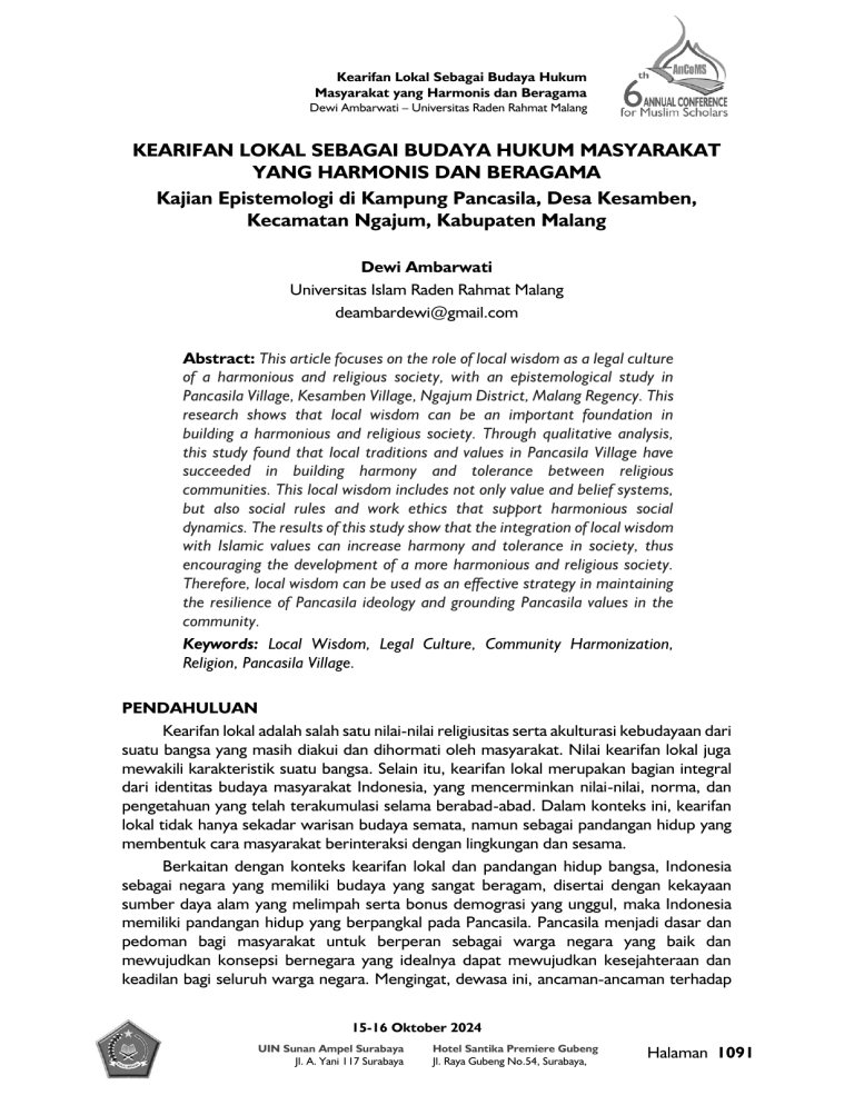 Kearifan Lokal Sebagai Budaya Hukum Masyarakat yang Harmonis dan Beragama Dewi Ambarwati – Universitas Raden Rahmat Malang KEARIFAN LOKAL SEBAGAI BUDAYA HUKUM MASYARAKAT YANG HARMONIS DAN BERAGAMA Kajian Epistemologi di Kampung Pancasila, Desa Kesamben, Kecamatan Ngajum, Kabupaten Malang Dewi Ambarwati Universitas Islam Raden Rahmat Malang [email protected] Abstract: This article focuses on the role of local wisdom as a legal culture of a harmonious and religious society, with an epistemological study in Pancasila Village, Kesamben Village, Ngajum District, Malang Regency. This research shows that local wisdom can be an important foundation in building a harmonious and religious society. Through qualitative analysis, this study found that local traditions and values in Pancasila Village have succeeded in building harmony and tolerance between religious communities. This local wisdom includes not only value and belief systems, but also social rules and work ethics that support harmonious social dynamics. The results of this study show that the integration of local wisdom with Islamic values can increase harmony and tolerance in society, thus encouraging the development of a more harmonious and religious society. Therefore, local wisdom can be used as an effective strategy in maintaining the resilience of Pancasila ideology and grounding Pancasila values in the community. Keywords: Local Wisdom, Legal Culture, Community Harmonization, Religion, Pancasila Village. PENDAHULUAN Kearifan lokal adalah salah satu nilai-nilai religiusitas serta akulturasi kebudayaan dari suatu bangsa yang masih diakui dan dihormati oleh masyarakat. Nilai kearifan lokal juga mewakili karakteristik suatu bangsa. Selain itu, kearifan lokal merupakan bagian integral dari identitas budaya masyarakat Indonesia, yang mencerminkan nilai-nilai, norma, dan pengetahuan yang telah terakumulasi selama berabad-abad. Dalam konteks ini, kearifan lokal tidak hanya sekadar warisan budaya semata, namun sebagai pandangan hidup yang membentuk cara masyarakat berinteraksi dengan lingkungan dan sesama. Berkaitan dengan konteks kearifan lokal dan pandangan hidup bangsa, Indonesia sebagai negara yang memiliki budaya yang sangat beragam, disertai dengan kekayaan sumber daya alam yang melimpah serta bonus demograsi yang unggul, maka Indonesia memiliki pandangan hidup yang berpangkal pada Pancasila. Pancasila menjadi dasar dan pedoman bagi masyarakat untuk berperan sebagai warga negara yang baik dan mewujudkan konsepsi bernegara yang idealnya dapat mewujudkan kesejahteraan dan keadilan bagi seluruh warga negara. Mengingat, dewasa ini, ancaman-ancaman terhadap 15-16 Oktober 2024 UIN Sunan Ampel Surabaya Jl. A. Yani 117 Surabaya Hotel Santika Premiere Gubeng Jl. Raya Gubeng No.54, Surabaya, Halaman 1091 “Enhancing Islamic Values trough Local Wisdom in Keeping Harmony and Tolerance” Dewi Ambarwati – Universitas Raden Rahmat Malang disintegrasi bangsa tentunya sangat beragam. Banyak faktor yang mempengaruhi, baik dari segi internal dan eksternal. Apabila dikaji dari faktor internal, tentu saja berkaitan pada kualitas sumber daya manusia serta bagaimana pola pikir masyarakat terhadap negara. Disisi lain, dari segi eksternal, pengaruh-pengaruh ideologi dan budaya dari negara lain, kecepatan teknologi yang tidak diimbangi dengan adaptasi masyarakat cenderung untuk menjadi salah satu pemicu perpecahan bangsa. Telah dijelaskan sebelumnya, bahwa salah satu faktor penyebab terjadinya disintegrasi bangsa adalah kurangnya pemahaman dan internalisasi nilai-nilai Pancasila sebagai cita hukum bangsa Indonesia. Mengingat Indonesia sebagai negara multikultural, maka idelanya penguatan nilai-nilai Pancasila tersebut dapat dimulai dari kegiatan sosial berbasis kemasyarakatan dengan tujuan meneguhkan semangat Pancasila di dalam kehidupan komunal masyarakat, salah satunya melalui kearifan lokal. Kearifan lokal dari setiap wilayah di Indonesia sangat beragam yang mewakili masing-masing kultural masyarakat. Contohnya adalah tradisi mancoliak anak pada masyarakat adat Silungkang, yang mengandung nilai-nilai agama yang mengajarkan adat memakai, menenggang orang kampung/saling tenggang rasa, berat sama dipikul ringan sama dijinjing, saling menjaga hubungan kekeluargaan, hidup dikandung adat mati dikandung tanah, dapat musibah diimbaukan dapat kebaikan diimbaukan, yang tua dihormati yang muda disayangi yang sebaya dikawani, dan seia sekata1. Kemudian, nilainilai kearifan lokal rumah adat Rungkoh di gampong menggamat yaitu makna Tiang Rumoh adat Rungkoh ini di banggun awalnya untuk memenuhi kebutuhan masyarakat Kluet Tengah. Makna Rumoh Rungko yang menghadap ke arah utara masyarakat gampong percaya bahwa pada saat terbitnya matahari lindu kita tidak dapat terlihat dimana mereka mempercayai agar terhindari dari segala macam penyakit waktu mereka masih hidup di dunia dan terhindar dari malapetaka. Makna dari anak tangga sendiri memiliki jumlah anak tangga yang ganjil masyarakat mempercayai ketika pemilik rumah melaksanakan acara ritual peusijuek yang berjumlah ganjil dimana tepat di pintu adanya gambar pedang, yang memiliki makna ketika masuk ke dalam Rumah Rungkoh hanya orang penting yang boleh memasuki pintu utama. Makna bagian atap samping merendah dan bagian atas meruncing ke atas agar terhindar dari segala macam penyakit dan terhindar dari santet, dimana di atap terdapat kain yang diikat supaya terhindar dari malapetaka2. Upaya untuk meningkatkan kesadaran masyarakat terhadap urgensi kerukunan umat beragama melalui kearifan lokal telah dilaksanakan di Desa Kesamben, Kecamatan Ngajum, Kabupaten Malang. Desa Kesamben memiliki salah satu bagian dari entitas warga desanya yang membentuk suatu komunitas di Desa dan dinamakan Kampung Pancasila. Kampung Pancasila di Desa Kesamben tersebut merupakan inisatif warga desa yang menggunakan nilai-nilai kearifan lokal desa untuk melestarikan budaya setempat melalui musik tradisional, tarian tradisional, pelestarian adat i