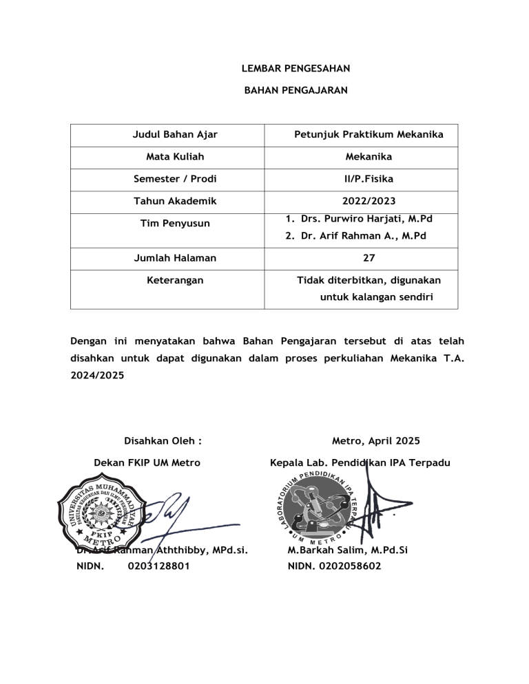 LEMBAR PENGESAHAN BAHAN PENGAJARAN Judul Bahan Ajar Petunjuk Praktikum Mekanika Mata Kuliah Mekanika Semester / Prodi II/P.Fisika Tahun Akademik 2022/2023 Tim Penyusun 1. Drs. Purwiro Harjati, M.Pd 2. Dr. Arif Rahman A., M.Pd Jumlah Halaman 27 Keterangan Tidak diterbitkan, digunakan untuk kalangan sendiri Dengan ini menyatakan bahwa Bahan Pengajaran tersebut di atas telah disahkan untuk dapat digunakan dalam proses perkuliahan Mekanika T.A. 2024/2025 Disahkan Oleh : Dekan FKIP UM Metro Metro, April 2025 Kepala Lab. Pendidikan IPA Terpadu Dr.Arif Rahman Aththibby, MPd.si. M.Barkah Salim, M.Pd.Si NIDN. NIDN. 0202058602 0203128801 BUKU PANDUAN PRAKTIKUM MATA KULIAH MEKANIKA Dosen Pengampu : Drs. Purwiro Harjati, M.Pd Dr. Arif Rahman A., M.Pd Asisten : Sri Mulyani, M.Pd Puja Tria Oktaviana Feby Ayunda Laboratorium Pendidikan Fisika Fakultas Keguruan dan Ilmu Pendidikan Universitas Muhammadiyah Metro TA. Genap 2024/2025 Daftar Isi Halaman Judul .............................................................................................................. i Halaman Pengesahan .................................................................................................. ii Daftar Isi ....................................................................................................................... iii Topik Praktikum I Hukum II Newton .............................................................................. 1 Topik Praktikum II Gerak Sentripetal ............................................................................. 4 Topik Praktikum III Gerak Harmonik pada Bandul Matematis ..................................... 10 Topik Praktikum IV Hukum Kekekalan Momentum ..................................................... 14 Topik Praktikum V Kesetimbangan Benda Tegar ........................................................ 20 Topik Praktikum VI Hukum Hooke ............................................................................. 23 Panduan Praktikum Mekanika PERCOBAAN I HUKUM II NEWTON A. Tujuan Praktikum 1. Mahasiswa mampu menentukan besar percepatan benda (a). 2. Mampu menentukan besar tegangan tali (T) B. Kajian Teori Bila ada resultan gaya yang timbul pada sebuah benda, dapat dipastikan benda tersebut kan bergerak dengan suatu percepatan tertentu. Bila benda semula dalam keadaan diam akan bergerak dipercepat dengan percepatan tertentu, sedangkan bila benda semula bergerak dengan kecepatan tetap akan berubah menjadi gerak dipercepat atau diperlambat. Resultan gaya yang bekerja pada benda yang bermassa konstan adalah setara dengan hasil kali massa benda dengan percepatannya. Pernyataan inilah yang dikenal sebagai Hukum II Newton. Secara matematis hukum tersebut dapat dirumuskan sebagai berikut : Gambar 1. Benda diberi gaya F ∑πΉ = ππ ............................... (1) dimana m adalah massa benda dalam satuan kg, a adalah percepatan benda dalam satuan m/s², dan F adalah resultan gaya yang bekerja pada benda. ο adalah resultan gaya yang menjumlahkan beberapa gaya pada benda. Jika satu benda terletak pada bidang mendatar yang licin dihubungkan dengan benda lain dengan menggunakan seutas tali melalui sebuah katrol, di mana benda yang lain dalam keadaan tergantung tampak seperti gambar 2. Aplikasi Hukum II Newton 1 Panduan Praktikum Mekanika Dalam hal ini kedua benda merupakan satu sistem yang mengalami percepatan sama, maka berdasarkan persamaan Hukum II Newton dapat dinyatakan sebagai berikut: π£ π π΄ π = π‘ = π +π π ................................. (2) π΄ π΅ dengan: a = percepatan sistem (m/s2) mA = massa benda A (kg) mB = massa benda B (kg) g = percepatan gravitasi setempat (m/s2) t = waktu (s) 1 π = π 0 + π£0 π‘ + 2 ππ‘ 2 ...................... (3) Bila benda semula dalam keadaan diam, maka percepatan dapat dituliskan persamaannya sebagai berikut: 2π π = π‘2 ....................................... (4) Besarnya tegangan tali (T) dapat ditentukan dengan meninjau resultan gaya yang bekerja pada masing-masing benda, dan didapatkan persamaan: π = ππ + ππ .............................. (5) C. Alat dan bahan Banyaknya 1. Mobil/troli mekanika dengan massa yang sama 2 2. Rel mobil 1 3. Beban 5 gram – 25 gram 5 4. Tali secukupnya 5. Stopwatch 2 6. Katrol sedang dan dudukannya 1 7. Penggaris 1 meter 1 8. Neraca ohaus 1 2 Panduan Praktikum Mekanika D. Prosedur Percobaan 1. Timbang mobil atau troli (ππ΄ ) dan beban (ππ΅ ) menggunakan neraca sebanyak 5 kali. 2. Anggap massa tali di abaikan karena jauh lebih ringan dibanding dengan massa beban. 3. Buat rangkaian seperti pada gambar Troli (ππ΄ ) Troli (ππ΅ ) Gambar 2. Rangkaian Praktikum 4. Letakkan troli (ππ΄ ) pada jarak 1m dari titik akhir pengukuran. 5. Letakkan beban 5 gram pada mB sehingga massa ππ΅ lebih besar dibandingkan ππ΄ . 6. Ketikan troli sudah mulai bergerak hitung waktunya dengan menggunakan stopwatch. 7. Catat pada tabel pengambilan data. 8. Ulangi langkah 5-7 pada penambahan tiap 5 gram hingga beban bernilai 25 gram E. Tabel Pengambilan Data No. mA (kg) mB (kg) ∑ 3 s (m) t (s) t2 (s2) a (m/s2) T(N) Panduan Praktikum Mekanika PERCOBAAN II GERAK SENTRIPETAL A. Tujuan Praktikum 1. Mahasiswa mampu menentukan hubungan gaya sentripetal (πΉπ ) dengan jari-jari (r). 2. Mahasiswa mampu menentukan hubungan kecepatan linier (π£) dengan jari-jari (r). 3. Mahasiswa mampu menentukan hubungan periode (π) dengan jari-jari (r). B. Kajian Teori Gerak melingkar adalah gerak suatu benda dengan lintasan yang berbentuk lingkaran. Dimana gerak melingkar dapat kita temukan disetiap tempat dan kejadian di kehidupan kita, misalkan saja roda berputar melingkar, jarum jam yang bergerak melingkar, bumi berputar mengelilingi matahari dalam orbit mendekati lingkaran, dan sebagainya. Gerak melingkar yang dipelajari dalam fisika ada dua yaitu gerak melingkar beraturan dan berubah beraturan. Pada materi kelas sepuluh yang dibahas adalah gerak melingkar beraturan yaitu gerak benda dalam 