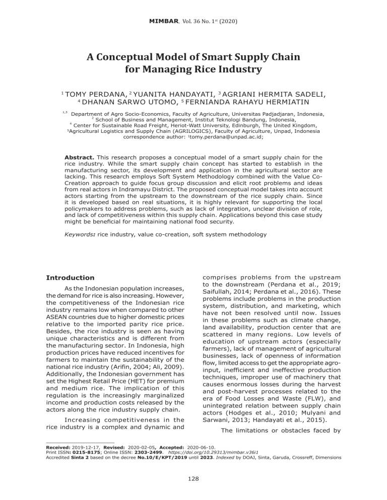 MIMBAR, Vol. 36 No. 1st (2020) A Conceptual Model of Smart Supply Chain for Managing Rice Industry 1 TOMY PERDANA, 2 YUANITA HANDAYATI, 3 AGRIANI HERMITA SADELI, 4 DHANAN SARWO UTOMO, 5 FERNIANDA RAHAYU HERMIATIN 1,3 Department of Agro Socio-Economics, Faculty of Agriculture, Universitas Padjadjaran, Indonesia, 2 School of Business and Management, Institut Teknologi Bandung, Indonesia, 4 Center for Sustainable Road Freight, Heriot-Watt University, Edinburgh, The United Kingdom, 5 Agricultural Logistics and Supply Chain (AGRILOGICS), Faculty of Agriculture, Unpad, Indonesia correspondence author: [email protected]; Abstract. This research proposes a conceptual model of a smart supply chain for the rice industry. While the smart supply chain concept has started to establish in the manufacturing sector, its development and application in the agricultural sector are lacking. This research employs Soft System Methodology combined with the Value CoCreation approach to guide focus group discussion and elicit root problems and ideas from real actors in Indramayu District. The proposed conceptual model takes into account actors starting from the upstream to the downstream of the rice supply chain. Since it is developed based on real situations, it is highly relevant for supporting the local policymakers to address problems, such as lack of integration, unclear division of role, and lack of competitiveness within this supply chain. Applications beyond this case study might be beneficial for maintaining national food security. Keywords: rice industry, value co-creation, soft system methodology Introduction comprises problems from the upstream to the downstream (Perdana et al., 2019; Saifullah, 2014; Perdana et al., 2016). These problems include problems in the production system, distribution, and marketing, which have not been resolved until now. Issues in these problems such as climate change, land availability, production center that are scattered in many regions. Low levels of education of upstream actors (especially farmers), lack of management of agricultural businesses, lack of openness of information flow, limited access to get the appropriate agroinput, inefficient and ineffective production techniques, improper use of machinery that causes enormous losses during the harvest and post-harvest processes related to the era of Food Losses and Waste (FLW), and unintegrated relation between supply chain actors (Hodges et al., 2010; Mulyani and Sarwani, 2013; Handayati et al., 2015). As the Indonesian population increases, the demand for rice is also increasing. However, the competitiveness of the Indonesian rice industry remains low when compared to other ASEAN countries due to higher domestic prices relative to the imported parity rice price. Besides, the rice industry is seen as having unique characteristics and is different from the manufacturing sector. In Indonesia, high production prices have reduced incentives for farmers to maintain the sustainability of the national rice industry (Arifin, 2004; Ali, 2009). Additionally, the Indonesian government has set the Highest Retail Price (HET) for premium and medium rice. The implication of this regulation is the increasingly marginalized income and production costs released by the actors along the rice industry supply chain. Increasing competitiveness in the rice industry is a complex and dynamic and The limitations or obstacles faced by Received: 2019-12-17, Revised: 2020-02-05, Accepted: 2020-06-10. Print ISSN: 0215-8175; Online ISSN: 2303-2499. https://doi.org/10.29313/mimbar.v36i1 Accredited Sinta 2 based on the decree No.10/E/KPT/2019 until 2023. Indexed by DOAJ, Sinta, Garuda, Crossreff, Dimensions 128 MIMBAR, Vol. 36 No. 1st (2020) pp. 128-138 the rice industry actors have resulted in the inability of the actors to develop and improve the competitiveness and marketing of the national rice industry. They have decreased the young generation’s interest in working in the rice industry (Insani et al., 2018;). The problems indirectly encourage the rice industry to increase competitiveness through cost efficiency. Thus, the rice production activities are adjusted based on the development of the needs and desires of consumers, as well as the integration between the actors involved in it (Perdana et al., 2019). The development of integration between actors along the rice industry supply chain requires an inclusive approach and active participation of all stakeholders. Lambert and Cooper (2000) define supply chain management as integration in running business processes by involving multiple actors to provide products based on consumers’ needs. It aims to tackle problems such as overproduction, stock out, to the delivery process, which may be hampered both due to internal and external factors of the company. These problems also occur in agricultural sectors such as the rice industry. According to the purpose of this study, supply chain management literature have proposed a variety of logistics development strategies by paying attention to the right production system, at the right time, at the right place at the right price for the right conditions and the right market (Mentzer et al., 2001; Buurman, 2002). One of the latest advances in the supply chain management literature is the application of a smart supply chain (Wu et al., 2016). Just like other supply chain management concepts (Shukla and Jharkhasria, 2013), the adoption of smart supply chain concepts is, until nowadays, more common in the manufacturing sector (Wu et al., 2016). The study is adopting an intelligent supply chain in the agricultural industry, such as the rice industry, in our case study, which might be more complicated. The use of big data, the Internet of Things (IoT), cloud computing, nanotechnology, sensors, mobile computing, and various other technological innovations are beneficial to assist the rice production process. However, the adoption of these technologies require
