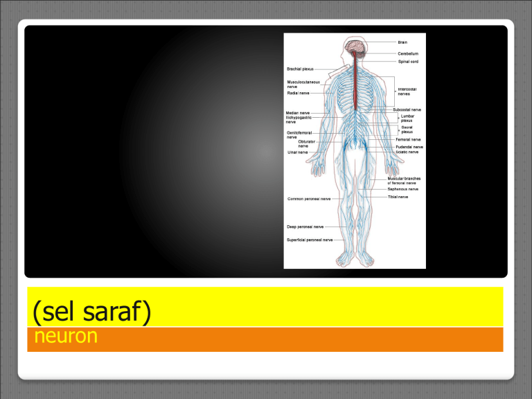 (sel saraf) neuron Neuron membentuk sistem saraf (salah 1 dr 2 sistem kontrol utama tubuh di luar sistem endokrin) Sistem saraf dibentuk oleh jaringan interaktif kompleks 3 jenis dasar sel saraf: neuron aferen (sensory neuron), neuron eferen (motor neuron), antarneuron (interneuron) prolog Fungsi sistem saraf melakukan koord/kontrol thd sebag besar aktv tubuh untuk homeostatis Sistem saraf mengubah jaringan sasaran (sel target) dg keluarkan zat perantara kimiawi (neurotransmiter) shg berinteraksi dg reseptor spesifik pd sel/jaringan sasaran anatomi Badan sel terdapat nukleus & organelorganel sel dendrit sejumlah besar tonjolan badan sel, berbentuk spt akar pohon/ antena perluas permukaan pnerimaan sinyal dari sel saraf lain, bawa sinyal ke arah badan sel Tonjolan tunggal, memanjang, berbentuk pipa menghantarkan potensial aksi menjauhi badan sel & berakhir di sel saraf lain Akson/serat saraf Akson punya cabang²/kolateral sepanjang seratnya. Badan sel tempat keluar akson = bukit akson (axon hillock) Panjang akson mulai < 1 mm (neuron²yg hanya berhubungan dg sel² tetangga) s/d > 1 m (neuron² yg berhub dg bag² sistem saraf yg jauh/dg organ perifer) Ujung akson tdp percabangan cukup banyak (mirip akar pohon) telodendrion Di ujung telodendrion tdp bulatan² kecil (button terminal)/ terminal akson Terminal² keluarkan zat perantara kimiawi yg berpengaruh ke sel lain yg berhub dg terminal tsb Klasifikasi neuron sesuai bentuk cabang Neuron unipolar Punya 1 cabang pada badan saraf, kmd terbelah 2 membentuk spt huruf T. Satu belah sbg dendrit, 1 belah sbg akson. Neuron ini berfungsi sbg sensory neuron (pembawa sinyal dari bag tubuh ke sistem saraf pusat Neuron bipolar Punya 2 cabang pada badan sel saraf di sisi² slng berlawanan, yg 1 sbg dendrit, yg lain sbg akson, bentknya elips. Berfungsi sbg interneuron (hub kan neuron² dlm otak & spinal cord) Neuron multipolar Punya dendrit >1 tp hanya 1 akson, bentuknya multigonal. Fungsinya sbg motoneuron (membawa sinyal dr sistem saraf pusat ke bag lain tubuh, spt otot, kulit, kelenjar)