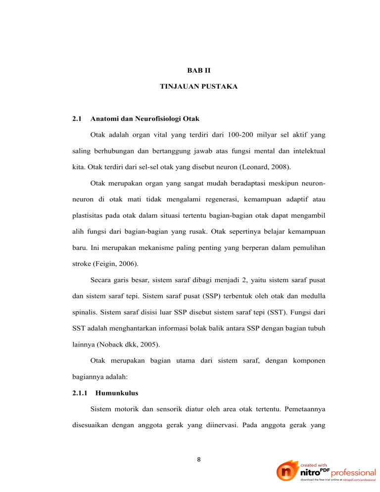 BAB II TINJAUAN PUSTAKA 2.1 Anatomi dan Neurofisiologi Otak Otak adalah organ vital yang terdiri dari 100-200 milyar sel aktif yang saling berhubungan dan bertanggung jawab atas fungsi mental dan intelektual kita. Otak terdiri dari sel-sel otak yang disebut neuron (Leonard, 2008). Otak merupakan organ yang sangat mudah beradaptasi meskipun neuronneuron di otak mati tidak mengalami regenerasi, kemampuan adaptif atau plastisitas pada otak dalam situasi tertentu bagian-bagian otak dapat mengambil alih fungsi dari bagian-bagian yang rusak. Otak sepertinya belajar kemampuan baru. Ini merupakan mekanisme paling penting yang berperan dalam pemulihan stroke (Feigin, 2006). Secara garis besar, sistem saraf dibagi menjadi 2, yaitu sistem saraf pusat dan sistem saraf tepi. Sistem saraf pusat (SSP) terbentuk oleh otak dan medulla spinalis. Sistem saraf disisi luar SSP disebut sistem saraf tepi (SST). Fungsi dari SST adalah menghantarkan informasi bolak balik antara SSP dengan bagian tubuh lainnya (Noback dkk, 2005). Otak merupakan bagian utama dari sistem saraf, dengan komponen bagiannya adalah: 2.1.1 Humunkulus Sistem motorik dan sensorik diatur oleh area otak tertentu. Pemetaannya disesuaikan dengan anggota gerak yang diinervasi. Pada anggota gerak yang 8 9 memiliki tingkat sensitivitas yang peka dan memiliki gerak motorik yang halus, maka memiliki area yang luas. Humunkulus dibagi menjadi 2 macam, yakni humunkulus motorik dan humunkulus sensorik. Humunkulus motorik merupakan area pergerakan tubuh yang dipresentasikan dengan bentuk terbalik di girus presentalis. Mulai dari bawah kearah superior adalah struktur yang berperan dalam proses menelan, lidah, dan daerah wajah. Area berikutnya merupakan daerah luas untuk gerakan jari, terutama ibu jari, tangan, bahu, badan (gambar 2.1). Gerakan pinggul, lutut, pergelangan kaki dipresentasikan di area girus presentalis yang paling tinggi. Humunkulus menggambarkan area otak yang berfungsi untuk menginervasi bagian tubuh tertentu secara kontralateral. Humunkulus motorik berasal dari area motorik primer (area 4 broadman) yang merupakan area otak yang berfungsi untuk mengeksekusi gerakan. Area ini akan membentuk sebuah jalur desenden ke medulla spinalis atau yang biasa disebut traktus piramidalis. Semakin luas area humunkulus, maka semakin komplek pula fungsi area tubuh yang diinervasi olehnya. Apabila area motorik ini mengalami kerusakan, maka akan menyebabkan kelainan pada bagian tubuh yang diinervasi oleh area otak tersebut (Scivoletto, 2007) 10 Gambar 2.1 Humunkulus motorik (Scivoletto, 2007) Selain humunkulus motorik, terdapat humunkulus sensorik (gambar 2.2). Humunkulus ini terletak pada girus possentralis di lobus parietalis di area 1, 2, dan 3 menurut topografi broadman. Area ini merupakan area somatosensorik yang bennanfaat untuk menerima rangsang yang datang dari panca indra. Proses penerimaan impuls oleh area somatosensorik dibagi menjadi 3 orde. Orde pertama, stimulus atau rangsang yang diterima oleh reseptor-reseptor ditingkat perifer dibawa menuju ke posterior horn cell (PHC) di medula spinalis. Orde kedua, membawa impuls dari medulla spinalis menuju thalamus yang dibawa oleh traktus spinotalamikus. Selanjutnya impuls dari thalamus akan dibawa menuju kortek sensorik melalui traktus thalamokortikalis (Wade, 2013). Kelainan yang muncul pada kondisi CP Spastik Diplegia mempunyai ciri ekstremitas bawah dominan mengalami gangguan. Berdasarkan susunan humunkulus pada gambar 2.1, dapat disimpuIkan bahwa CP Spastik Diplegia. mengalami gangguan pada area otak yang mengurusi anggota gerak bawah yang terletak pada sisi superior cerebri (Sherpherd, 2007). 11 Gambar 2.2 Humunkulus sensorik (Sherpherd, 2007) 2.1.2 Area Broadman Otak memiliki banyak fungsi, salah satunya adalah fungsi motorik. Area otak yang mengurusi motorik atau gerakan berasal dari area otak yang terletak di girus presentralis lobus frontalis. Aktivitas tersebut dimediasi oleh tiga area kortek yakni, area motorik primer (area 4 broadman), area premotor (area 6 broadman) dan area motorik tambaban (gambar 2.3). Pada area presentralis yang terletak pada girus presentralis, dibagi menjadi daerah posterior dan anterior. Daerah posterior disebut sebagai area motorik, area motorik primer atau area broadman 4 menempati girus presentalis yang membentang melewati tepi superior masuk ke dalam lobulus parasentalis. Daerah anterior dikenal sebagai area premotorik, area motorik sekunder atau area broadman 6, serta sebagian area 8, 44 dan 45. Fungsi dari area motorik primer adalah untuk menimbulkan gerakan-gerakan individual pada berbagai bagian tubuh. Sedangkan fungsi dari area premotorik adalah untuk menyimpan program aktivitas motorik yang 12 dikumpulkan berdasarkan pengalaman yang lalu. Dengan demikian, area premotorik membuat program aktivitas motorik pada area motorik primer. Area ini terutama berperan untuk mengontrol gerakan postural kasar melalui hubungannya dengan basal ganglia. Area motorik tambahan terletak di girus frontalis medialis pada permukaan medial hemisferium dan di anterior lobulus parasentralis. Area motorik tambahan mentransmisikan informasi dari area lain di kortek dan basal ganglia ke kortrek motorik primer (Gordon,2005). Dalam sistem gerak, beberapa area di otak saling bekerjasama untuk menghasilkan gerakan yang halus terkoordinasi. Gerakan yang terampil dan terkoordinasi dihasilkan dari kerja kortek motorik yang dibantu oleh basal ganglia. Sebuah perencanaan motorik dibuat oleh area premotor yang nantinya akan dieksekusi oleh area motorik primer. Gerakan yang dihasilkan oleh kortek motorik primer masih kasar, sehingga perlu dikontrol oleh area premotor yang berhubungan dengan basal ganglia. Dengan peran dari basal ganglia maka gerakan yang dihasilkan akan lebih terkontrol (Gordon, 2005). Gambar 2.3 Area broadman cerebral cortek (Gordon, 2005) 13 Keterangan gambar 2.3 1. Area gerakan mata dan perubahan pupil 2. Area premotor (bagian dari sirkuit ekstrapiramidal) 3. Area motorik p