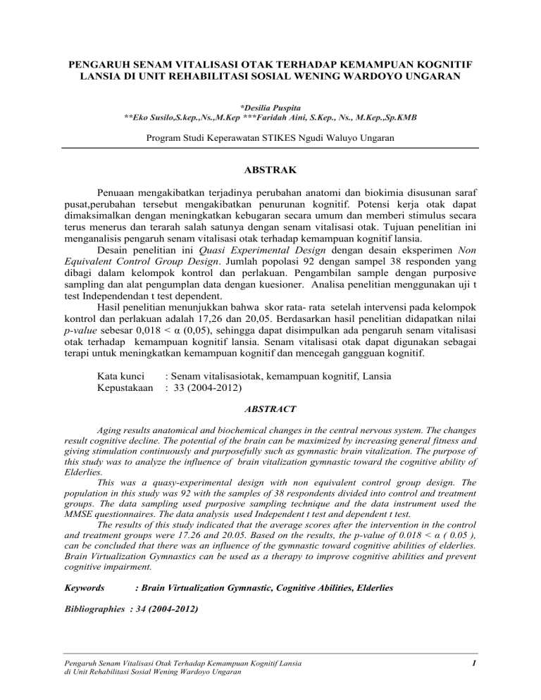 PENGARUH SENAM VITALISASI OTAK TERHADAP KEMAMPUAN KOGNITIF LANSIA DI UNIT REHABILITASI SOSIAL WENING WARDOYO UNGARAN *Desilia Puspita **Eko Susilo,S.kep.,Ns.,M.Kep ***Faridah Aini, S.Kep., Ns., M.Kep.,Sp.KMB Program Studi Keperawatan STIKES Ngudi Waluyo Ungaran ABSTRAK Penuaan mengakibatkan terjadinya perubahan anatomi dan biokimia disusunan saraf pusat,perubahan tersebut mengakibatkan penurunan kognitif. Potensi kerja otak dapat dimaksimalkan dengan meningkatkan kebugaran secara umum dan memberi stimulus secara terus menerus dan terarah salah satunya dengan senam vitalisasi otak. Tujuan penelitian ini menganalisis pengaruh senam vitalisasi otak terhadap kemampuan kognitif lansia. Desain penelitian ini Quasi Experimental Design dengan desain eksperimen Non Equivalent Control Group Design. Jumlah popolasi 92 dengan sampel 38 responden yang dibagi dalam kelompok kontrol dan perlakuan. Pengambilan sample dengan purposive sampling dan alat pengumplan data dengan kuesioner. Analisa penelitian menggunakan uji t test Independendan t test dependent. Hasil penelitian menunjukkan bahwa skor rata- rata setelah intervensi pada kelompok kontrol dan perlakuan adalah 17,26 dan 20,05. Berdasarkan hasil penelitian didapatkan nilai p-value sebesar 0,018 < α (0,05), sehingga dapat disimpulkan ada pengaruh senam vitalisasi otak terhadap kemampuan kognitif lansia. Senam vitalisasi otak dapat digunakan sebagai terapi untuk meningkatkan kemampuan kognitif dan mencegah gangguan kognitif. Kata kunci Kepustakaan : Senam vitalisasiotak, kemampuan kognitif, Lansia : 33 (2004-2012) ABSTRACT Aging results anatomical and biochemical changes in the central nervous system. The changes result cognitive decline. The potential of the brain can be maximized by increasing general fitness and giving stimulation continuously and purposefully such as gymnastic brain vitalization. The purpose of this study was to analyze the influence of brain vitalization gymnastic toward the cognitive ability of Elderlies. This was a quasy-experimental design with non equivalent control group design. The population in this study was 92 with the samples of 38 respondents divided into control and treatment groups. The data sampling used purposive sampling technique and the data instrument used the MMSE questionnaires. The data analysis used Independent t test and dependent t test. The results of this study indicated that the average scores after the intervention in the control and treatment groups were 17.26 and 20.05. Based on the results, the p-value of 0.018 < α ( 0.05 ), can be concluded that there was an influence of the gymnastic toward cognitive abilities of elderlies. Brain Virtualization Gymnastics can be used as a therapy to improve cognitive abilities and prevent cognitive impairment. Keywords : Brain Virtualization Gymnastic, Cognitive Abilities, Elderlies Bibliographies : 34 (2004-2012) Pengaruh Senam Vitalisasi Otak Terhadap Kemampuan Kognitif Lansia di Unit Rehabilitasi Sosial Wening Wardoyo Ungaran 1 PENDAHULUAN Menua merupakan proses yang terus menerus berlanjut secara alamiah Permasalahan yang sering dihadapi lansia seiring dengan berjalannya waktu, akan terjadi penurunan berbagai fungsi organ tubuh. Penurunan fungsi ini disebabkan karena berkurangnya jumlah sel secara anatomis serta berkurangnya aktivitas, asupan nutrisi yang kurang, polusi dan radikal bebas, hal tersebut mengakibatkan semua organ pada proses menua akan mengalami perubahan struktural dan fisiologis, begitu juga otak (Bandiyah, 2009). Otak akan mengalami perubahan fungsi kognitif yaitu kesulitan di dalam mengingat kembali, berkurangnya kemampuan di dalam mengambil keputusan dan bertindak lebih lamban. (Sarwono, 2010). Kondisi yang dihadapi lansia merupakan Penurunan kemampuan memori atau daya ingat (demensia). Demensia akan menjadi krisis kesehatan terbesar di abad ini yang jumlah penderitanya terus bertambah. Berdasarkan sejumlah hasil penelitian di peroleh data bahwa demensia sering kali terjadi pada usia lanjut yang telah berumur kurang lebih 60 tahun. Demensia tersebut dapat di bagi menjadi dua kategori, yaitu: 1) Demensia senilis, 2) Demensia pra senilis. Sekitar 56,8% lansia mengalami demensia dalam bentuk demensia Alzheimer (4% di alami lansia yang telah berusia 75 tahun, 16 % pada usia 85 tahun, dan 32% pada usia 90 tahun) sampai saat ini di perkirakan kurang lebih 30 juta penduduk dunia mengalami demensia dengan berbagai sebab (Santoso, 2002. Gangguan kognitif pada lansia dapat mengakibatkan lansia mengalami gangguan dalam melakukan aktivitas sehari-hari (makan, minum, berpakaian, BAB/BAK, dan lain sebagainya), adanya perubahan emosi dan tingkah laku. Lansia dengan gangguan kognitif akan mengalami ketergantungan di dalam menjalankan semua aktivitasnya karena dia dibantu oleh orang lain, oleh karena itu perlu adanya metode-metode yang dapat digunakan untuk meningkatkan kemampuan kognitif dengan cara meningkatkan stimulasi otak (Bandiyah, 2009). 2 Lumbantobing (2006) mengatakan bahwa untuk mengidentifikasi gangguan kognitif maupun tingkat kognitif yang terjadi pada lansia maka dapat di gunakan kuesioner MiniMental State Examination (MMSE). Tes MMSE terdiri dari 11 item pertanyaan yang terdiri dari orientasi, registrasi, Attensi dan kalkulasi, mengingat kembali, serta bahasa. Hasil ukur dalam penelitian ini kemudian dikategorikan menjadi normal dengan skor 2430, ringan dengan skor 19-23, sedang dengan skor 11-18, berat dengan skor 0-10. Salah satu cara mencegah kemunduran kognitif yaitu melakukan gerakan atau latihan fisik. Secara umum, terdapat dua macam latihan yang dapat meningkatkan potensi kerja otak yakni meningkatkan kebugaran secara umum dan melakukan senam otak ( senam vitalisasi otak). Senam vitalisasi otak adalah sebuah produk latihan kebugaran fisik yang mengkhususkan diri pada upaya mempertahankan kebugaran otak manusia dan mencegah penurunan kognitif. Latihan ini merupakan penyelarasan fungsi gerak, pernafasan, pusat berpikir (memori, imaj