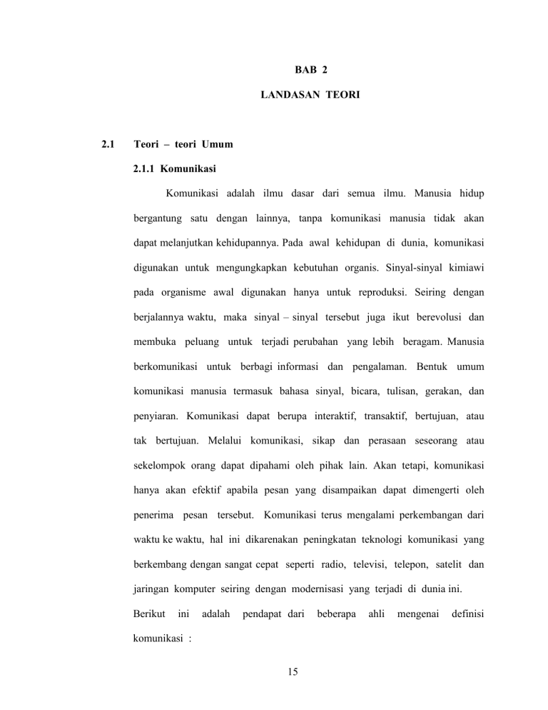 BAB 2 LANDASAN TEORI 2.1 Teori – teori Umum 2.1.1 Komunikasi Komunikasi adalah ilmu dasar dari semua ilmu. Manusia hidup bergantung satu dengan lainnya, tanpa komunikasi manusia tidak akan dapat melanjutkan kehidupannya. Pada awal kehidupan di dunia, komunikasi digunakan untuk mengungkapkan kebutuhan organis. Sinyal-sinyal kimiawi pada organisme awal digunakan hanya untuk reproduksi. Seiring dengan berjalannya waktu, maka sinyal – sinyal tersebut juga ikut berevolusi dan membuka peluang untuk terjadi perubahan yang lebih beragam. Manusia berkomunikasi untuk berbagi informasi dan pengalaman. Bentuk umum komunikasi manusia termasuk bahasa sinyal, bicara, tulisan, gerakan, dan penyiaran. Komunikasi dapat berupa interaktif, transaktif, bertujuan, atau tak bertujuan. Melalui komunikasi, sikap dan perasaan seseorang atau sekelompok orang dapat dipahami oleh pihak lain. Akan tetapi, komunikasi hanya akan efektif apabila pesan yang disampaikan dapat dimengerti oleh penerima pesan tersebut. Komunikasi terus mengalami perkembangan dari waktu ke waktu, hal ini dikarenakan peningkatan teknologi komunikasi yang berkembang dengan sangat cepat seperti radio, televisi, telepon, satelit dan jaringan komputer seiring dengan modernisasi yang terjadi di dunia ini. Berikut ini adalah pendapat dari komunikasi : 15 beberapa ahli mengenai definisi 16 1. Wilbur Schramm menyatakan komunikasi sebagai suatu proses berbagi (sharing process). Schramm mendefinisikannya sebagai berikut : “ Komunikasi berasal dari kata – kata (bahasa) Latin communis yang berarti umum (common) atau bersama. Hakikat sebuah komunikasi adalah usaha membuat penerima atau pemberi komunikasi memiliki pengertian/ pemahaman yang sama terhadap pesan tertentu” (Suprapto, 2006 : 2 – 3) 2. Pakar komunikasi lainnya, Joseph A Devito mengemukakan komunikasi sebagai transaksi. Transaksi yang dimaksudkannya bahwa komunikasi merupakan suatu proses dimana komponen-komponennya saling terkait dan bahwa para komunikatornya beraksi dan bereaksi sebagai suatu kesatuan dan keseluruhan. Dalam setiap proses transaksi, setiap elemen berkaitan secara integral dengan elemen lain. (Suprapto, 2006 : 5) 3. Berelson dan Stainer (1964) : Komunikasi adalah proses penyampaian informasi, gagasan, emosi, keahlian dan lain-lain. Melalui penggunaan simbol-simbol seperti kata – kata, gambar – gambar, angka – angka dan lain – lain. Dilihat dari beberapa definisi komunikasi menurut para ahli diatas dapat disimpulkan bahwa tiap ahli memiliki pandangan masing – masing mengenai definisi komunikasi. Komunikasi terlihat sebagai kata yang abstrak sehingga memiliki banyak arti. Sehingga untuk menetapkan satu definisi tunggal tidaklah mudah. 17 Ilmu komunikasi adalah ilmu komunikasi yang bersifat multidisipliner sehingga definisi komunikasi pun menjadi banyak dan beragam. Masing – masing definisi memiliki penekanan arti yang berbeda satu sama lain, tetapi pada dasarnya berbagai definisi komunikasi yang telah ada sesungguhnya saling melengkapi dan menyempurnakan sejalan dengan perkembangan ilmu komunikasi itu sendiri. Komunikasi dalam tingkat akademi dibagi – bagi menjadi komunikasi massa, komunikasi bagi pembawa acara (broadcast), humas dan lainnya. Pekerjaan dalam dunia komunikasi mencerminkan keberagaman komunikasi itu sendiri. Dalam proses terjadinya komunikasi ada unsur – unsur yang membuat proses itu terjadi. Menurut Harold Laswell unsur – unsur komunikasi tersebut adalah sebagai berikut : 1. Sumber (Who) Sumber adalah pihak yang berinisiatif atau mempunyai kebutuhan untuk berkomunikasi. Sumber boleh jadi seseorang individu, kelompok, organisasi, perusahaan atau bahkan suatu Negara. Dalam mennyampaikan informasi, sumber harus mengubah apa yang ada dalam pikiran dan perasaannya ke dalam symbol verbal dan nonverbal sehingga dapat dipahami oleh penerima pesan. Sumber di sebut juga sebagai komunikator. 18 2. Pesan (Says What) Pesan adalah apa yang dikomunikasikan oleh sumber kepada penerima. Pesan dapat berupa verbal maupun nonverbal yang mewakili perasaan, nilai, gagasan dan pikiran narasumber. 3. Saluran atau media (In Which Channel) Saluran atau media merupakan alat atau wahana yang digunakan sumber untuk menyampaikan pesannya kepada penerima. Media dapat berupa media cetak (surat kabar, majalah) dan media elektronik (radio dan televisi) atau juga harus bertatap langsung (tatap muka). 4. Penerima (To Whom) Penerima (receiver), sering juga disebut sasaran/ tujuan (destination), komunikate (communicate), penyandi – balik (decorder) atau khalayak (audience), pendengar (listener), penafsir (interpreter), yakni orang yang menerima pesan verbal dan nonverbal dari sumber yang menjadi suatu gagasan yang ia pahami. 5. Efek (With What Effect) Efek adalah apa yang terjadi pada penerima setelah ia menerima pesan tersebut. Efek tersebut misalnya penambahan pengetahuan (dari tidak tahu menjadi tahu), terhibur, perubahan sikap (dari tidak setuju menjadi setuju), perubahan keyakinan, perubahan perilaku, dan lain sebagainya. (Mulyana, 2009 : 147 – 148) 19 Tujuan utama komunikasi adalah membangun atau menciptakan pemahamam dan pengertian bersama. Saling memahami atau mengerti bukan berarti harus menyetujui tetapi mungkin dengan komunikasi terjadi suatu perubahan sikap, pendapat, perilaku ataupun perubahan secara sosial: A. Perubahan sikap (attitude change) Seorang komunikan setelah menerima pesan kemudian sikapnya berubah, bisa positif maupun negatif. Dalam berbagai situasi kita berusaha mempengaruhi sikap orang lain dan berusaha agar orang lain bersikap positif sesuai keinginan kita. B. Perubahan pendapat (opinion change) Dalam komunikasi berusaha menciptakan pemahaman. Pemahaman, ialah kemampuan memahami pesan secara cermat sebagaimana dimaksudkan oleh komunikator. Setelah memahami apa yang dimaksud komunikator maka akan tercipta pendapat yang berbedabeda bagi komunikan. C. Perubahan perilaku (behavior change) Komunikasi bertujuan untuk mengubah perilaku maupun tinda