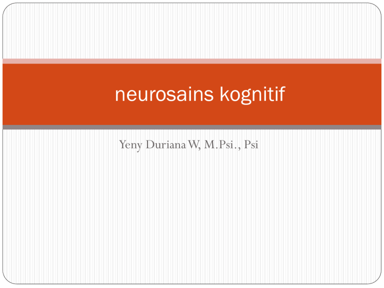 neurosains kognitif Yeny Duriana W, M.Psi., Psi Neurosains kognitif adalah pendekatan dalam psikologi kognitif yg memusatkan kajiannya pada otak. Ilmu yg menggabungkan psikologi kognitif dengan neurosains kemudian disebut neurosains kognitif Otak dipelajari oleh beberapa ilmuwan, mempertanyakan tentang “pikiran” Sejarah pemahaman tentang kognitif: apakah pikiran dan tubuh dua zat yg berbeda Bagaimana terjadinya gerak refleks?? Isi pikiran-tubuh : paara filsuf berpendapat bahwa satu2nya dunia nyata adalah dunia pikiran sedangkan fisik hanya ilusi. Sedangkan flsuf yg lain dunis nyata adalah fisik sedangkan pikiran hanya sebentuk proses yg terjadi di otak Perkembangannnya tersimpulkan ada dualisme antara tubuh dan pikiran Sistem saraf pusa Sumsum tulang belakang dan otak Fokus otak neuron-neuron yg sangat padat neuron Dendrit menerima impuls dari neuron lain Tubuh sel bertanggung jawab menjaga kondisi dasar neuron Akson penghubung tubuh sel dengan sel2 lain Akson berhenti di terminal para sinaptik (dekat permukaan dendrit neuron lain Otak Korteks serebral tempat proses berpikir manusia dan kognisi. Sensasi, pemrosesan bahasa, dan fungsi kognitif lain Dibagi menjadi 4: 1. lobus frontal : pengendalian impuls, pertimbangan, pemecahan msalah, pengendalian & pelaksanaan perilaku, &pengorganisasian kompleks 2. Lobus temporal : memproses sinyal auditori, pengenalan wajah 3. Lobus parieatal; integrasi informasi sensori pancaindera, proses manipulasi objek, proses visual-spasial 4. Lobus oksipital : proses visual Area sensori – motorik: kemampuan motorik Memori hampir di semua bagian otak, tapi ada yg mengatakan di area spesifik Hemisfer otak Kanan integrasi informasi sepanjang waktu, seni, musik, proses spasial, wjah Kiri bahasa, konseptual, analisis dan klasifikasi