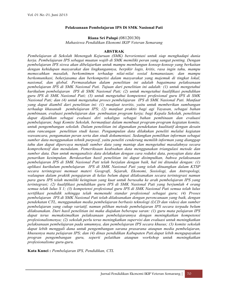 Vol. 01 No. 01, Juni 2013 Pelaksanaan Pembelajaran IPS Di SMK Nasional Pati Riana Sri Palupi (08120130) Mahasiswa Pendidikan Ekonomi IKIP Veteran Semarang ABSTRAK Pembelajaran di Sekolah Menengah Kejuruan (SMK) berorientasi untuk siap menghadapi dunia kerja. Pembelajaran IPS sebagai muatan wajib di SMK memiliki peran yang sangat penting. Dengan pembelajaran IPS siswa akan dibelajarkan untuk mampu membangun konsep-konsep yang berkaitan dengan kehidupan masyarakat dan lingkungannya, berpikir logis, kritis, rasa ingin tahu, mampu memecahkan masalah, berkomitmen terhadap nilai-nilai sosial kemanusiaan; dan mampu berkomunikasi, bekerjasama dan berkompetisi dalam masyarakat yang majemuk di tingkat lokal, nasional, dan global. Permasalahan dalam penelitian ini adalah bagaimana pelaksanaan pembelajaran IPS di SMK Nasional Pati. Tujuan dari penelitian ini adalah: (1) untuk mengetahui kurikulum pembelajaran IPS di SMK Nasional Pati; (2) untuk mengetahui kualifikasi pendidikan guru IPS di SMK Nasional Pati; (3) untuk mengetahui kompetensi profesional guru IPS di SMK Nasional Pati; dan (4) untuk mengetahui proses pembelajaran IPS di SMK Nasional Pati. Manfaat yang dapat diambil dari penelitian ini: (1) manfaat teoritis, yaitu untuk memberikan sumbangan terhadap khasanah pembelajaran IPS; (2) manfaat praktis bagi agi Yayasan, sebagai bahan pembinaan, evaluasi pembelajaran dan pembuatan program kerja; bagi Kepala Sekolah, penelitian dapat dijadikan sebagai evaluasi diri sekaligus sebagai bahan pembinaan dan evaluasi pembelajaran; bagi Komite Sekolah, bermanfaat dalam membuat program-program kegiatan komite, untuk pengembangan sekolah. Dalam penelitian ini digunakan pendekatan kualitatif dengan desain atau rancangan penelitian studi kasus. Pengumpulan data dilakukan peneliti melalui kegiatan wawancara, pengamatan peran serta dan studi dokumentasi. Sedangkan pemilihan informan sebagai sumber data menggunakan tehnik purposif, yaitu peneliti cenderung memilih informan yang dianggap tahu dan dapat dipercaya menjadi sumber data yang mantap dan mengetahui masalahnya secara komprehensif dan mendalam. Pemeriksaan keabsahan data menggunakan triangulasi metode dan sumber data. Dan untuk menganalisis data delakukan dengan cara reduksi data, penyajian data dan penarikan kesimpulan. Berdasarkan hasil penelitian ini dapat disimpulkan, bahwa pelaksanaan pembelajaran IPS di SMK Nasional Pati telah berjalan dengan baik, hal ini ditandai dengan: (1) aplikasi kurikulum pembelajaran IPS di SMK Nasional Pati yang telah dituangkan dalam KTSP secara terintegrasi memuat materi Geografi, Sejarah, Ekonomi, Sosiologi, dan Antropologi, walaupun dalam praktik pengajaran di kelas belum dapat dilaksanakan secara terintegrasi namun para guru IPS telah memiliki keinginan yang kuat untuk berusaha ke arah pembelajaran IPS yang terintegrasi; (2) kualifikasi pendidikan guru IPS di SMK Nasional Pati yang berjumlah 4 orang semua telah lulus S 1; (3) kompetensi profesional guru IPS di SMK Nasional Pati semua telah lulus sertifikasi pendidik sehingga telah memenuhi standar profesional sebagai guru; (4) Proses pembelajaran IPS di SMK Nasional Pati telah dilaksanakan dengan perencanaan yang baik, dengan pendekatan CTL, menggunakan media pembelajaran berbasis teknologi (LCD dan video) dan sumber pembelajaran yang cukup variatif, namun pilihan metode pembelajaran IPS secara terpadu belum dilaksanakan. Dari hasil penelitian ini maka diajukan beberapa saran: (1) guru mata pelajaran IPS dapat terus memaksimalkan pelaksanaan pembelajarannya dengan meningkatkan kompetensi profesionalismenya; (2) sekolah perlu terus meningkatkan supervisi dan evaluasi untuk meningkatkan pelaksanaan pembelajaran pada umumnya, dan pembelajaran IPS secara khusus; (3) komite sekolah dapat lebih menggali dana untuk pengembangan sarana prasarana ataupun media pembelajaran, khususnya mata pelajaran IPS; dan (4) dinas pendidikan Kabupaten Pati.dapat lebih mengupayakan progran pengembangan guru, seperti pelatihan ataupun workshop untuk meningkatkan profesionalisme guru-guru. Kata Kunci : Pembelajaran IPS, Pendidikan, CTL Jurnal Pendidikan Ekonomi IKIP Veteran Semarang | 70 Vol. 01 No. 01, Juni 2013 PENDAHULUAN Undang-Undang Nomor 20 tahun 2003 tentang Sistem Pendidikan Nasional menyatakan bahwa pendidikan adalah usaha sadar dan terencana untuk mewujudkan suasana belajar dan proses pembelajaran agar peserta didik secara aktif mengembangkan potensi dirinya untuk memiliki kekuatan spiritual keagamaan, pengendalian diri, kepribadian, kecerdasan, akhlak mulia, serta keterampilan yang diperlukan dirinya, masyarakat, bangsa, dan Negara. Disebutkan pula dalam Pasal 31 Undang-Undang Dasar tahun 1945 ayat 2 bahwa, pemerintah mengusahakan dan menyelenggarakan satu sistem pengajaran (pendidikan) nasional yang diatur dengan undang-undang. Pendidikan secara umum dapat dimaknai sebagai upaya memanusiakan manusia yang diselenggarakan sesuai dengan pandangan hidup, dan dalam latar sosial kebudayaan setiap masyarakat tertentu. Pendidikan merupakan bagian yang tidak dapat dipisahkan dari hidup dan kehidupan manusia. John Dewey menyatakan, bahwa pendidikan sebagai salah satu kebutuhan, fungsi sosial, sebagai bimbingan, sarana pertumbuhan yang mempersiapkan dan membukakan serta membentuk disiplin hidup. Dalam era globalisasi, pendidikan akan pengetahuan sosial menjadi dasar utama untuk meraih informasi dari berbagai penjuru dunia. Banyak informasi baru dalam Ilmu Pengetahuan Sosial (IPS) yang berujud seperangkat peristiwa, fakta, konsep, dan generalisasi yang berkaitan dengan isu sosial menjadi sarana dalam pengembangan kehidupan bermasyarakat ataupun berbangsa. Pada jenjang SMK/MAK mata pelajaran IPS memuat materi Geografi, Sejarah, Ekonomi, Sosiologi, dan Antropologi. Peserta didik diarahkan untuk dapat menjadi warga negara Indonesia yang demokratis, dan bertanggung jawab, serta warga dunia yang cinta damai. Di dalam pembelajaran mata pelajaran IPS, siswa diarahkan untuk agar mampu: (1) memahami 
