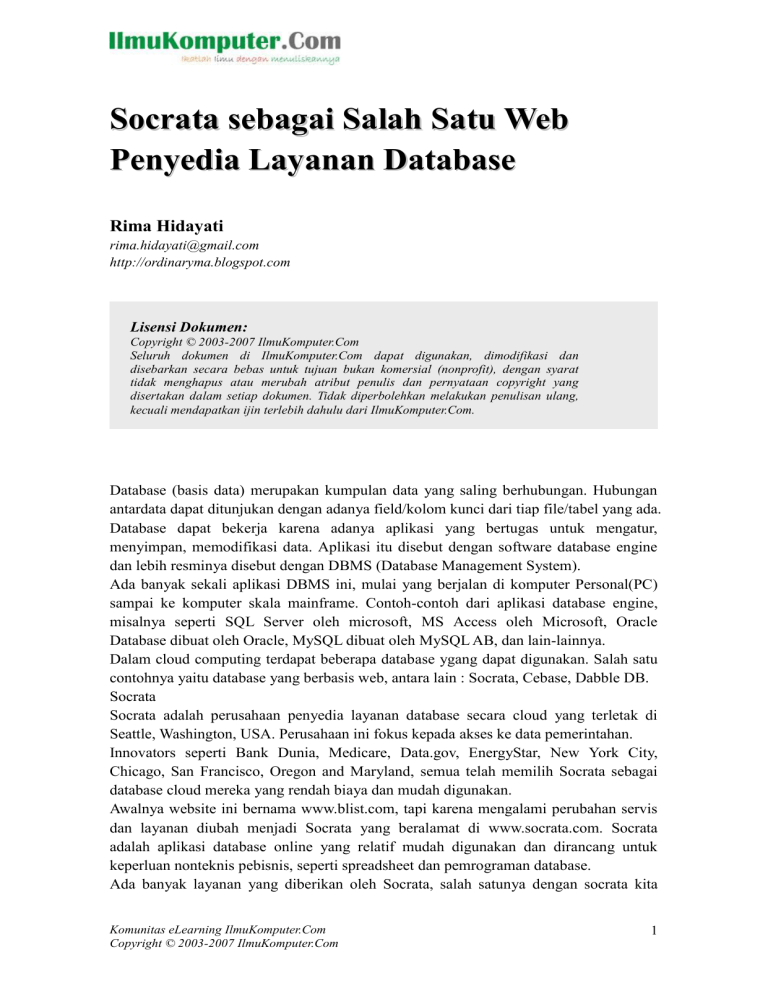 Socrata sebagai Salah Satu Web Penyedia Layanan Database Rima Hidayati [email protected] http://ordinaryma.blogspot.com Lisensi Dokumen: Copyright © 2003-2007 IlmuKomputer.Com Seluruh dokumen di IlmuKomputer.Com dapat digunakan, dimodifikasi dan disebarkan secara bebas untuk tujuan bukan komersial (nonprofit), dengan syarat tidak menghapus atau merubah atribut penulis dan pernyataan copyright yang disertakan dalam setiap dokumen. Tidak diperbolehkan melakukan penulisan ulang, kecuali mendapatkan ijin terlebih dahulu dari IlmuKomputer.Com. Database (basis data) merupakan kumpulan data yang saling berhubungan. Hubungan antardata dapat ditunjukan dengan adanya field/kolom kunci dari tiap file/tabel yang ada. Database dapat bekerja karena adanya aplikasi yang bertugas untuk mengatur, menyimpan, memodifikasi data. Aplikasi itu disebut dengan software database engine dan lebih resminya disebut dengan DBMS (Database Management System). Ada banyak sekali aplikasi DBMS ini, mulai yang berjalan di komputer Personal(PC) sampai ke komputer skala mainframe. Contoh-contoh dari aplikasi database engine, misalnya seperti SQL Server oleh microsoft, MS Access oleh Microsoft, Oracle Database dibuat oleh Oracle, MySQL dibuat oleh MySQL AB, dan lain-lainnya. Dalam cloud computing terdapat beberapa database ygang dapat digunakan. Salah satu contohnya yaitu database yang berbasis web, antara lain : Socrata, Cebase, Dabble DB. Socrata Socrata adalah perusahaan penyedia layanan database secara cloud yang terletak di Seattle, Washington, USA. Perusahaan ini fokus kepada akses ke data pemerintahan. Innovators seperti Bank Dunia, Medicare, Data.gov, EnergyStar, New York City, Chicago, San Francisco, Oregon and Maryland, semua telah memilih Socrata sebagai database cloud mereka yang rendah biaya dan mudah digunakan. Awalnya website ini bernama www.blist.com, tapi karena mengalami perubahan servis dan layanan diubah menjadi Socrata yang beralamat di www.socrata.com. Socrata adalah aplikasi database online yang relatif mudah digunakan dan dirancang untuk keperluan nonteknis pebisnis, seperti spreadsheet dan pemrograman database. Ada banyak layanan yang diberikan oleh Socrata, salah satunya dengan socrata kita Komunitas eLearning IlmuKomputer.Com Copyright © 2003-2007 IlmuKomputer.Com 1 dapat berbagi data publik dengan masyarakat luas, menggunakan layanan bernama Socrata Open Data Cloud. Langsung saja kita gunakan web browser untuk menuju situs www.socrata.com. Berikut adalah tampilan Home dari socrata.com: Untuk membuka layanan Socrata Open Data Cloud, klik tulisan Open data di pojok kanan atas Komunitas eLearning IlmuKomputer.Com Copyright © 2003-2007 IlmuKomputer.Com 2 Tampilan Open Data: Di Socrata Open Data Cloud, kita dapat menyimpan berbagai tipe file yang disediakan, seperti file datasets (seperti ms.excel), calendar, map, chart, forms, dan file documents. Dengan membuka Open data, kita sebagai pengunjung dapat melihat file apa saja yang disimpan disana, file tersebut memang diatur sebagai data publik, jadi semua pengunjung dapat melihatnya. Contoh data yang berupa spreadsheet: Komunitas eLearning IlmuKomputer.Com Copyright © 2003-2007 IlmuKomputer.Com 3 Contoh data berupa kalender: Contoh data yang berupa peta lokasi: Komunitas eLearning IlmuKomputer.Com Copyright © 2003-2007 IlmuKomputer.Com 4 Mari kita mencoba menggunakan Open Data ini, kita daftar dulu ya, pertama kita klik Sign Up pada bagian kanan atas web: Kemudian akan muncul form yang harus kita isi untuk mendaftar jadi bagian dari socrata.com. isikan semua data yang diminta ya, jangan ada yang dikosongi, dan jangan lupa password juga harus merupakan kombinasi huruf besar kecil dan angka. Komunitas eLearning IlmuKomputer.Com Copyright © 2003-2007 IlmuKomputer.Com 5 Jika password dinilai lemah atau tidak sesuai, maka akan muncul tampilan seperti ini, perbaiki password anda. Setelah itu klik Create My Account Oke, dengan cepat saja kita sudah terdaftar sebagai anggota dari socrata.com, mudah bukan? Berikut adalah tampilan Account yang kita miliki Komunitas eLearning IlmuKomputer.Com Copyright © 2003-2007 IlmuKomputer.Com 6 Tentu saja karena kita baru saja terdaftar, belum ada file apapun yang kita miliki. Kita coba membuat datasets untuk kita simpan sebagai database kita. Klik Create a new Dataset Lalu kita diberi 3 pilihan untuk memasukkan data yang kita buat, apakah langsung dengan tempate dari socrata.com, upload file bertipe .xls / .xlsx, ataukah ingin mengupload file lainnya. Komunitas eLearning IlmuKomputer.Com Copyright © 2003-2007 IlmuKomputer.Com 7 Apabila ingin memasukkan data langsung ke template yang disediakan, pilih Design from Scratch Sedangkan jika ingin memasukkan data dari file yang sudah kita miliki, maka pilih Import a Data File Komunitas eLearning IlmuKomputer.Com Copyright © 2003-2007 IlmuKomputer.Com 8 Atau jika ingin mengunggah file lainnya pilih Upload a Non-Data File, bisa jadi tipe filenya berupa .pdf, .doc, dan lain-lain. Kita coba pilih yang pertama, yaitu Design from scratch. Kita akan diminta mendeskripsikan data yang akan kita buat. Komunitas eLearning IlmuKomputer.Com Copyright © 2003-2007 IlmuKomputer.Com 9 Kemudian klik next, lalu finish Tampilan datasets hampir sama dengan ms.excel, kita dapat menambahkan komlom dan baris sesuai kebutuhan. Komunitas eLearning IlmuKomputer.Com Copyright © 2003-2007 IlmuKomputer.Com 10 Untuk menambah kolom misalnya, klik icon + dan isikan nama kolom dan tipe datanya di form sebelah kanan ini, kemudian klik Create Komunitas eLearning IlmuKomputer.Com Copyright © 2003-2007 IlmuKomputer.Com 11 Setelah kolom dibuat kita dapat mengisi barisan sel dibawahnya, data ini akan secara periodik disimpan oleh server selagi kita mengisinya. Apabila data sudah selesai dimasukkan dan kita hendak mempublikasikannya ke semua orang, maka klik Publish Dataset di sebelah kiri atas. Komunitas eLearning IlmuKomputer.Com Copyright © 2003-2007 IlmuKomputer.Com 12 Tampilan dataset setelah di publish: